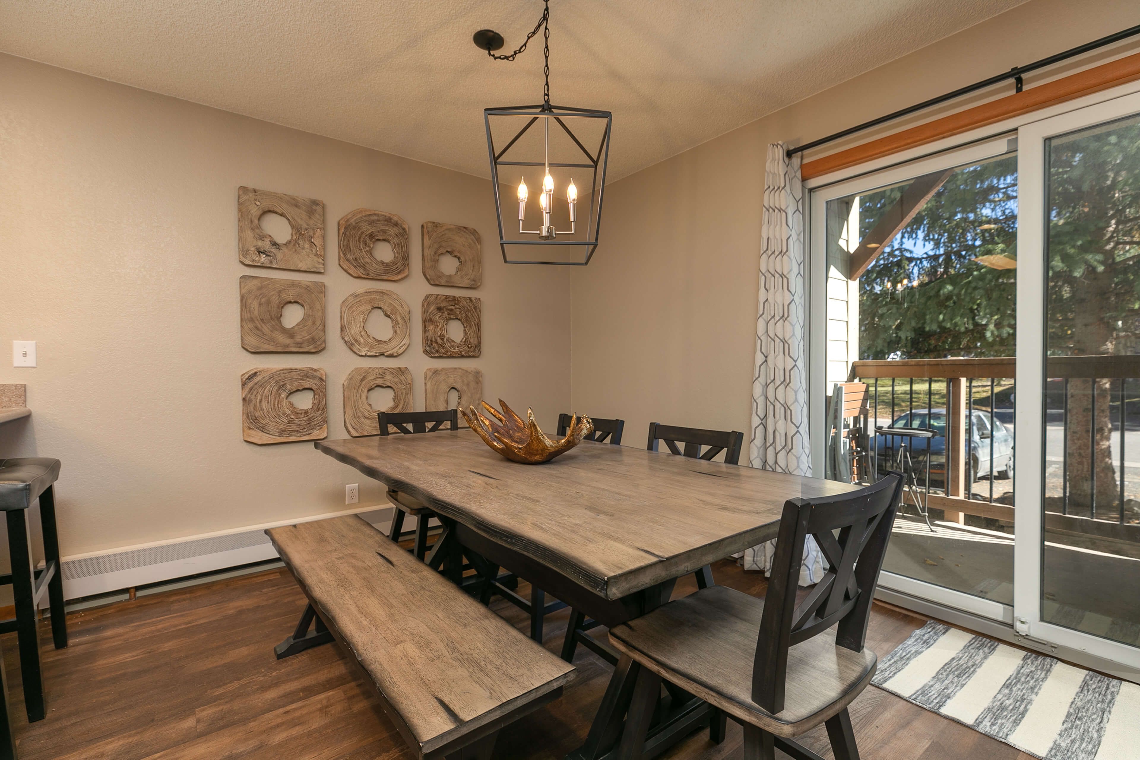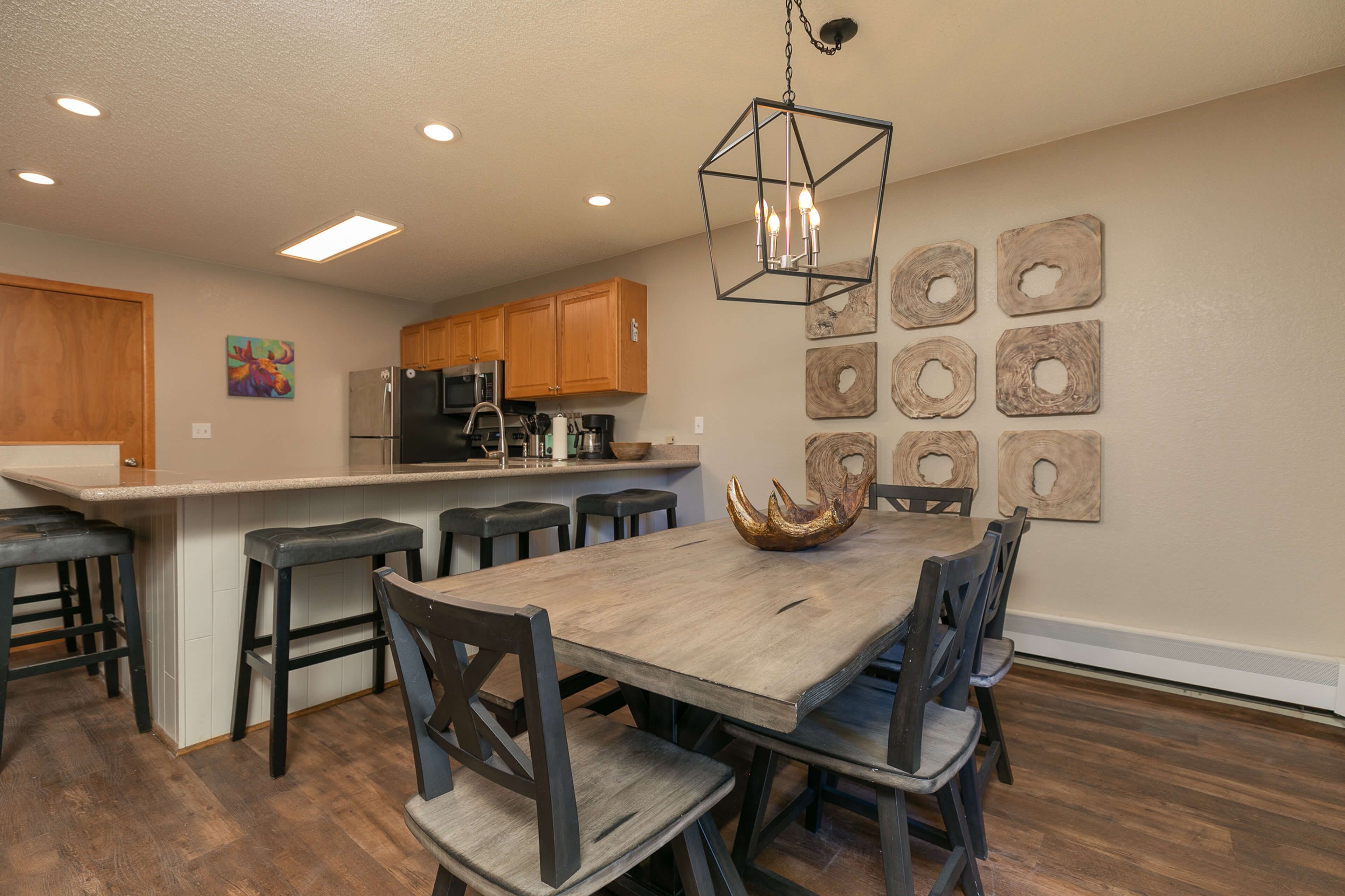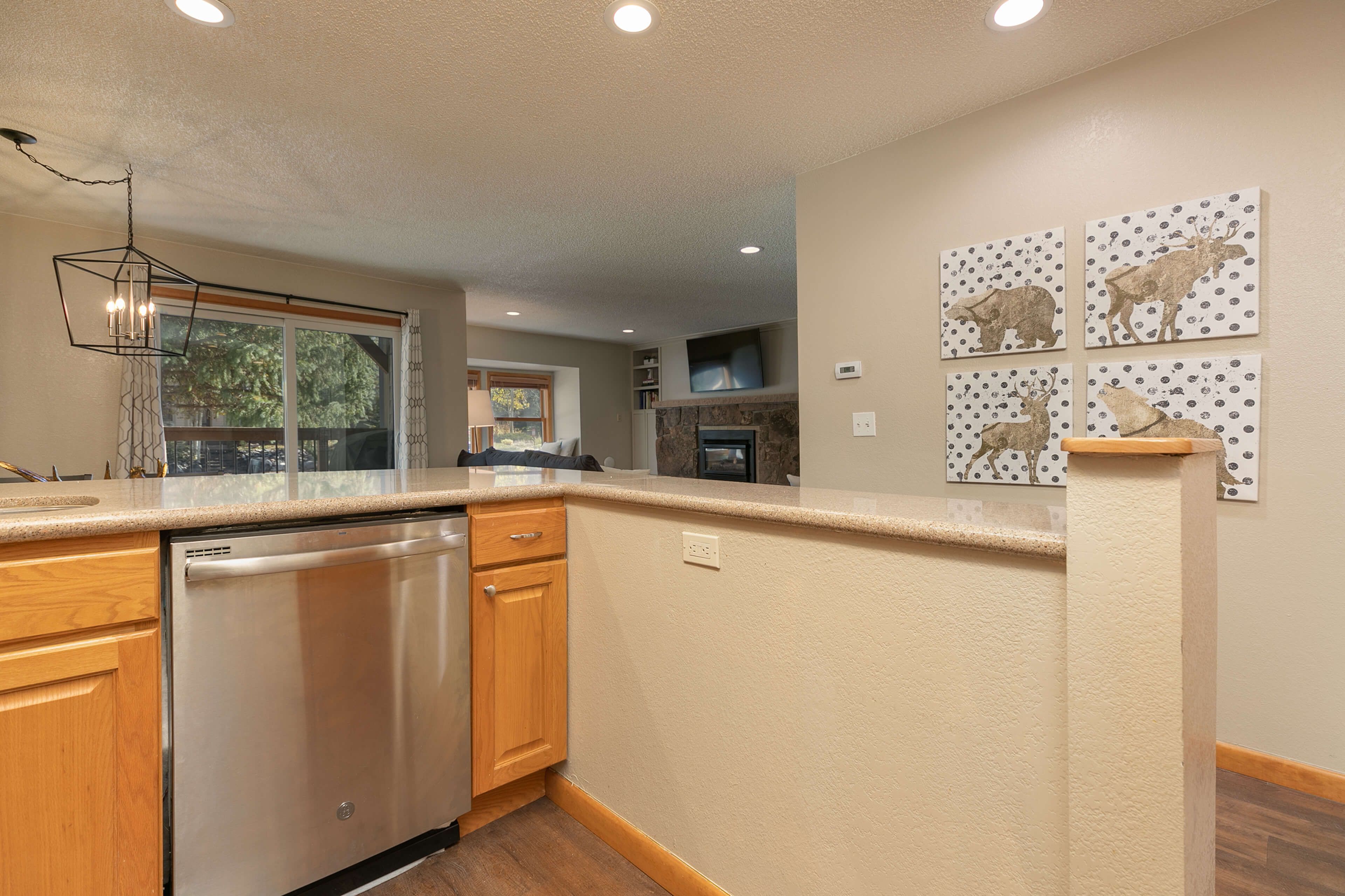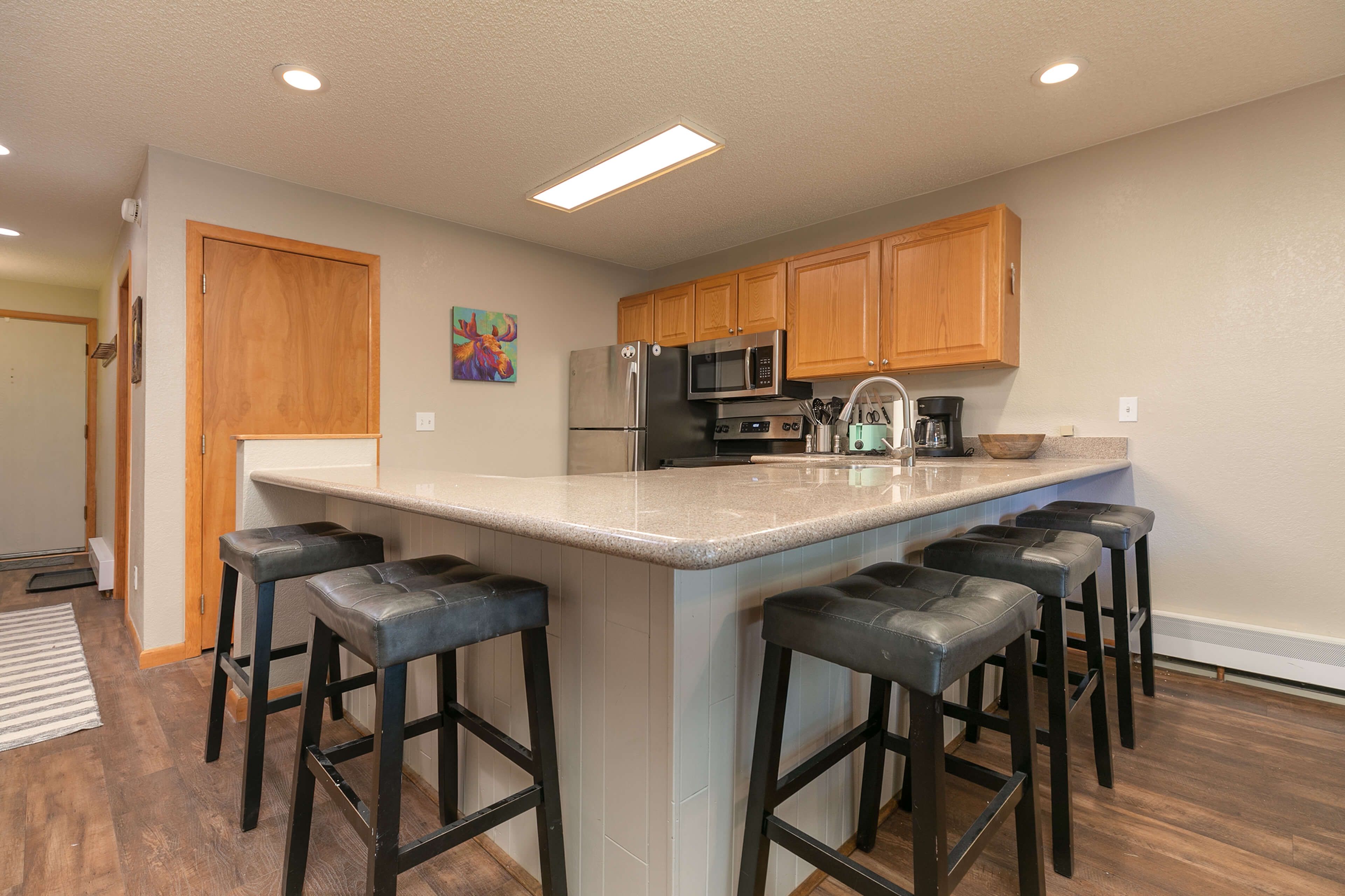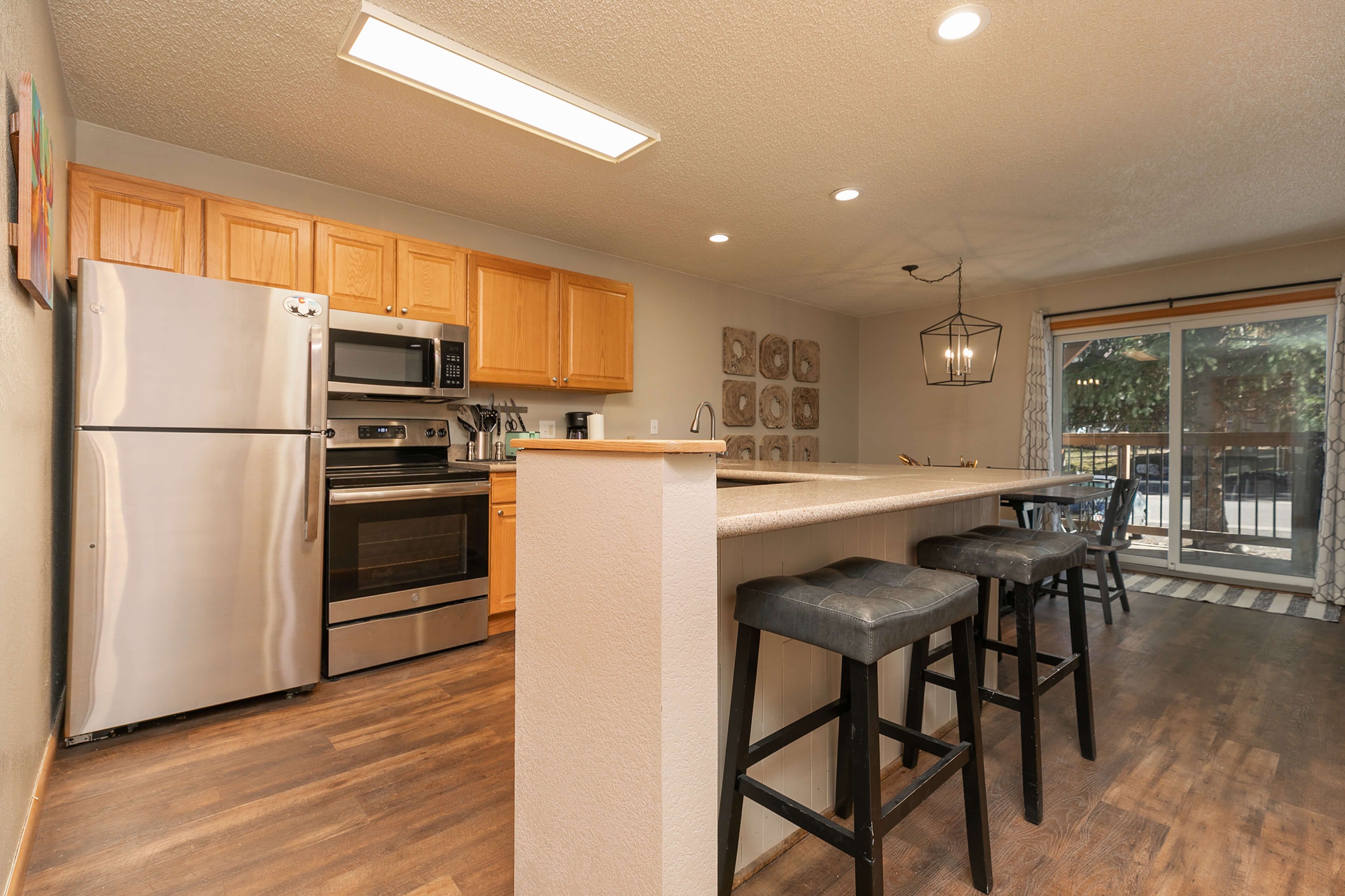 Inside, the welcoming living area features a stone gas fireplace and large Smart TV — perfect for movie nights, catching the game, or checking the morning snow report. The kitchen is fully outfitted with stainless-steel appliances and all the essentials for home-cooked meals, while the dining table seats six and the breakfast counter accommodates five more. It’s a space designed for gathering and refueling between adventures.