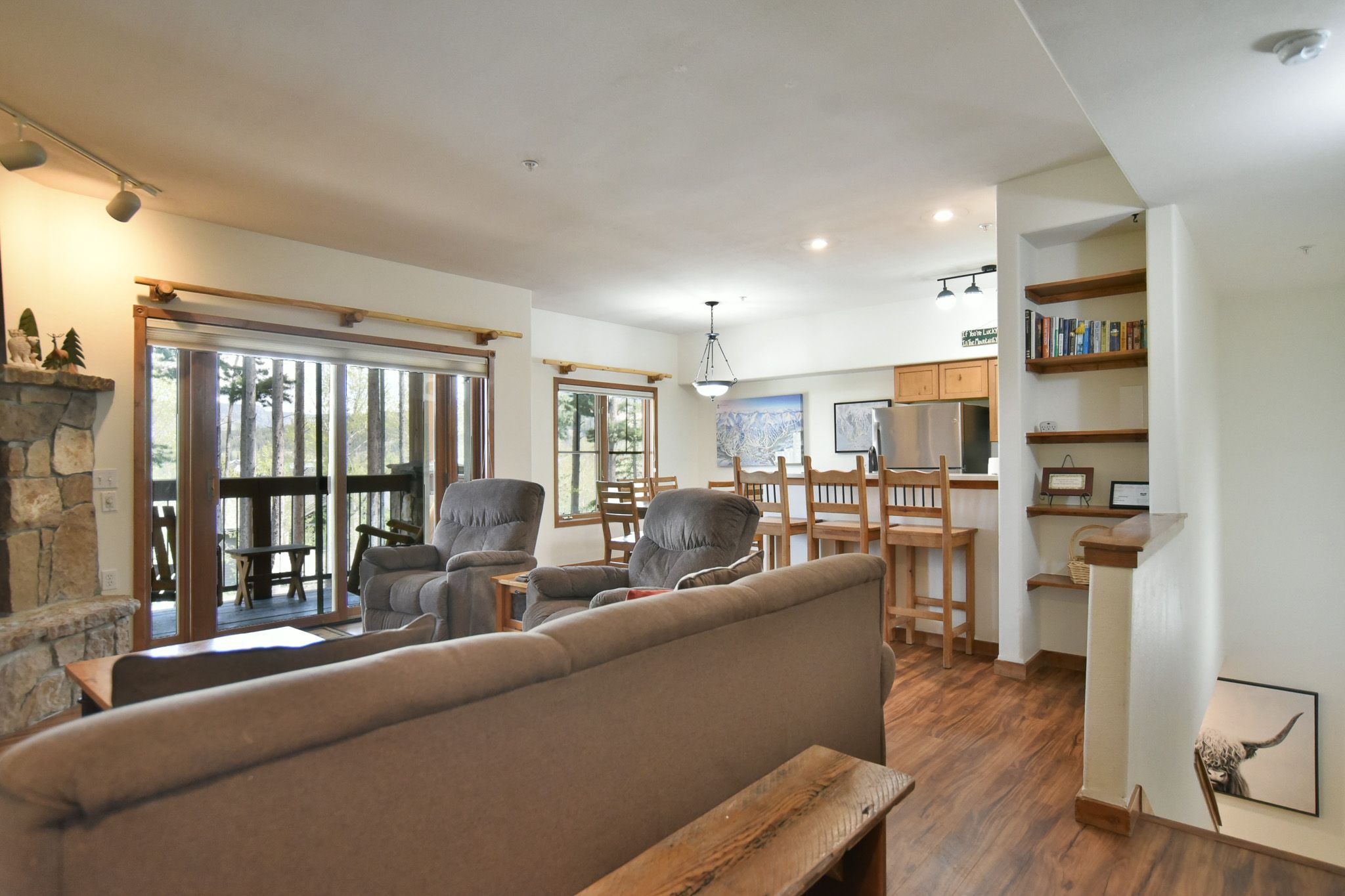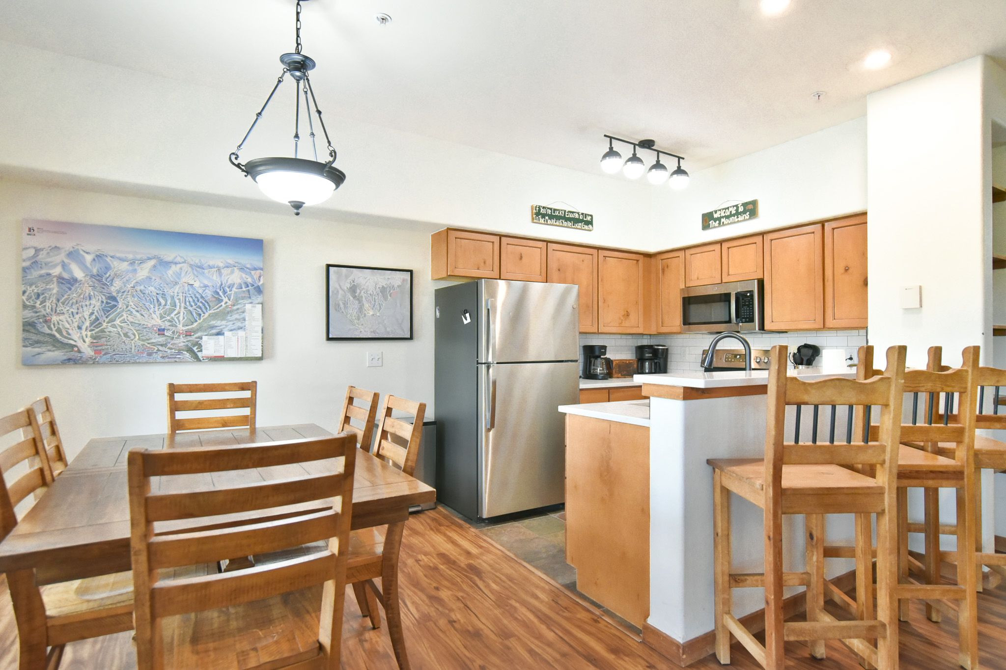 Inside, the split-level layout separates the main living space from the sleeping quarters, offering both openness and privacy. The upper level features a fully updated kitchen, a dining area with seating for the group, and a cozy living room centered around a gas fireplace. Head down the stairs to the lower level, where you’ll find both bedrooms and two beautifully renovated bathrooms. The condo also includes hardwood floors throughout, an in-unit washer and dryer, and access to both an on-site community hot tub and the seasonal Upper Village Pool with additional hot tubs and a heated outdoor pool.
