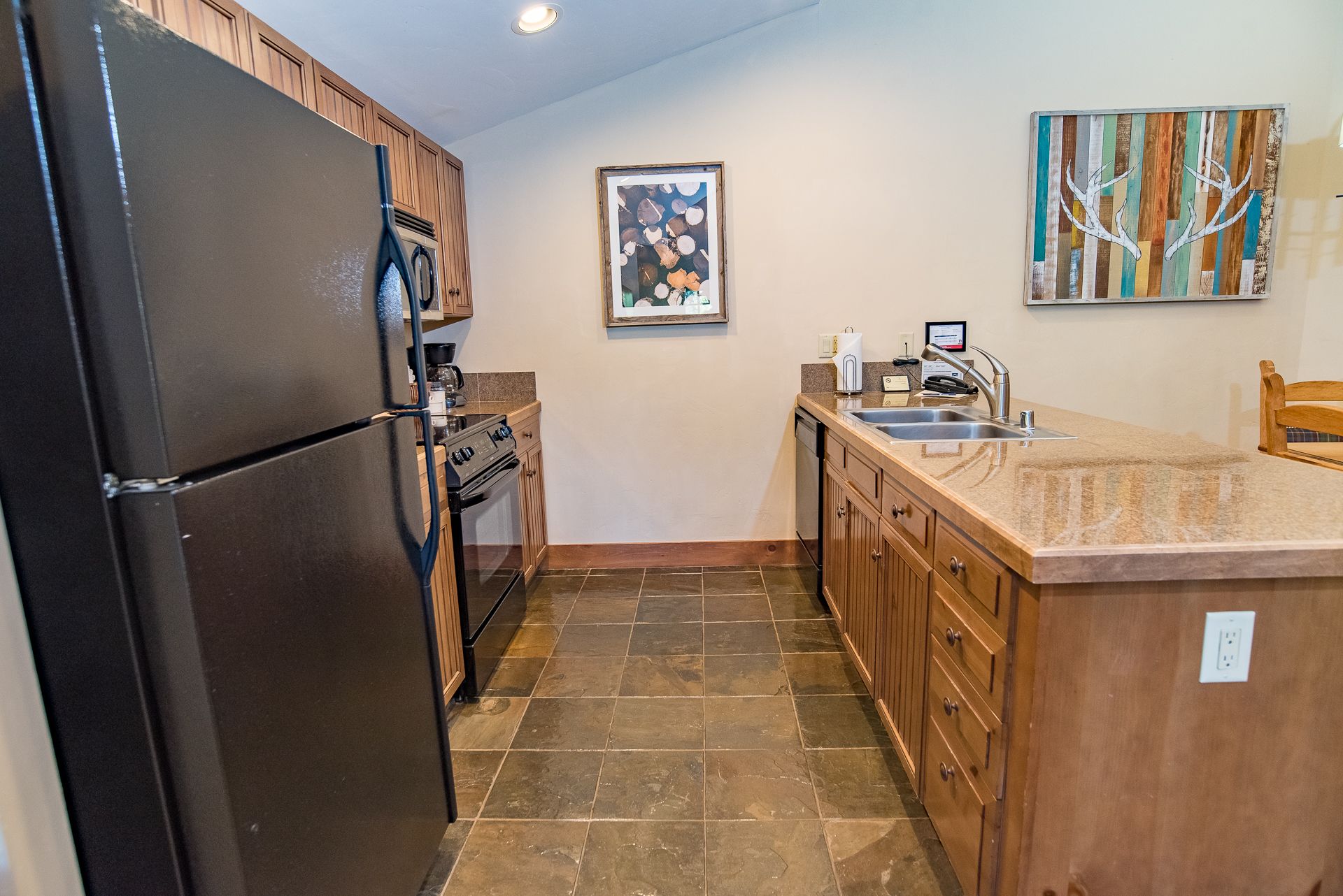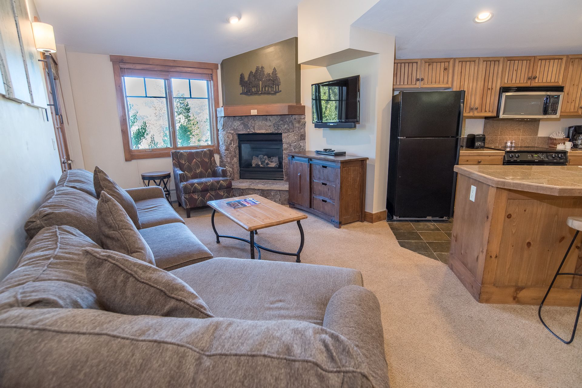This comfortable 1-bedroom, 1-bathroom is perfect for up to four guests. The living area features a stone gas fireplace, and there’s a large flat-screen TV for relaxing after a long day on the slopes. Right off the living room is the balcony — perfect for enjoying the fall colors and crisp mountain air. Granite counter tops in the full kitchen provide plenty of space to whip up great mountain meals and après-ski snacks. There’s seating for four at the dining table and three more at the kitchen counter.