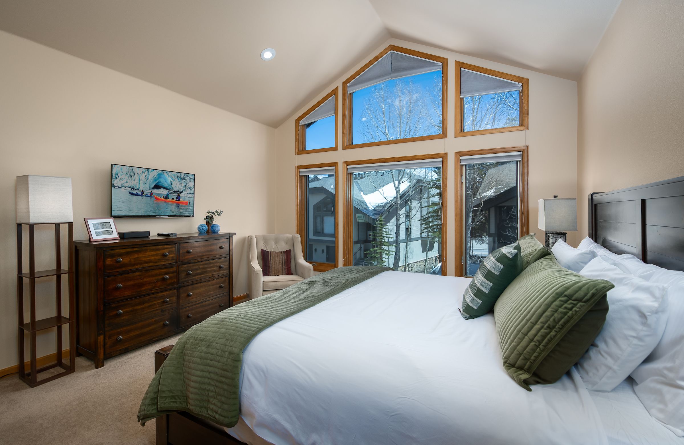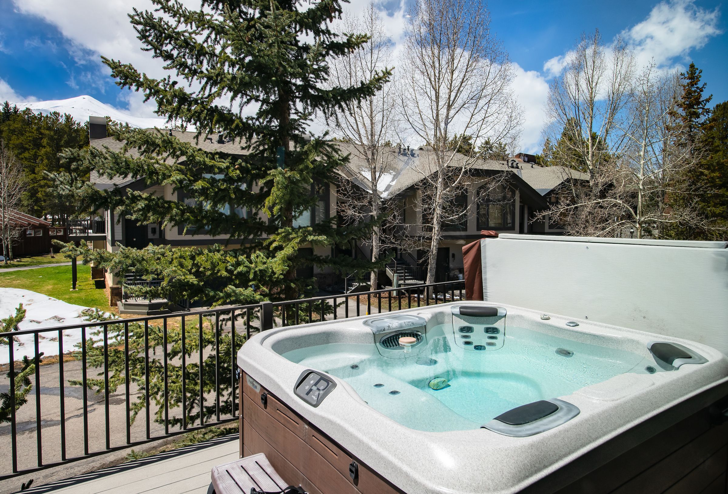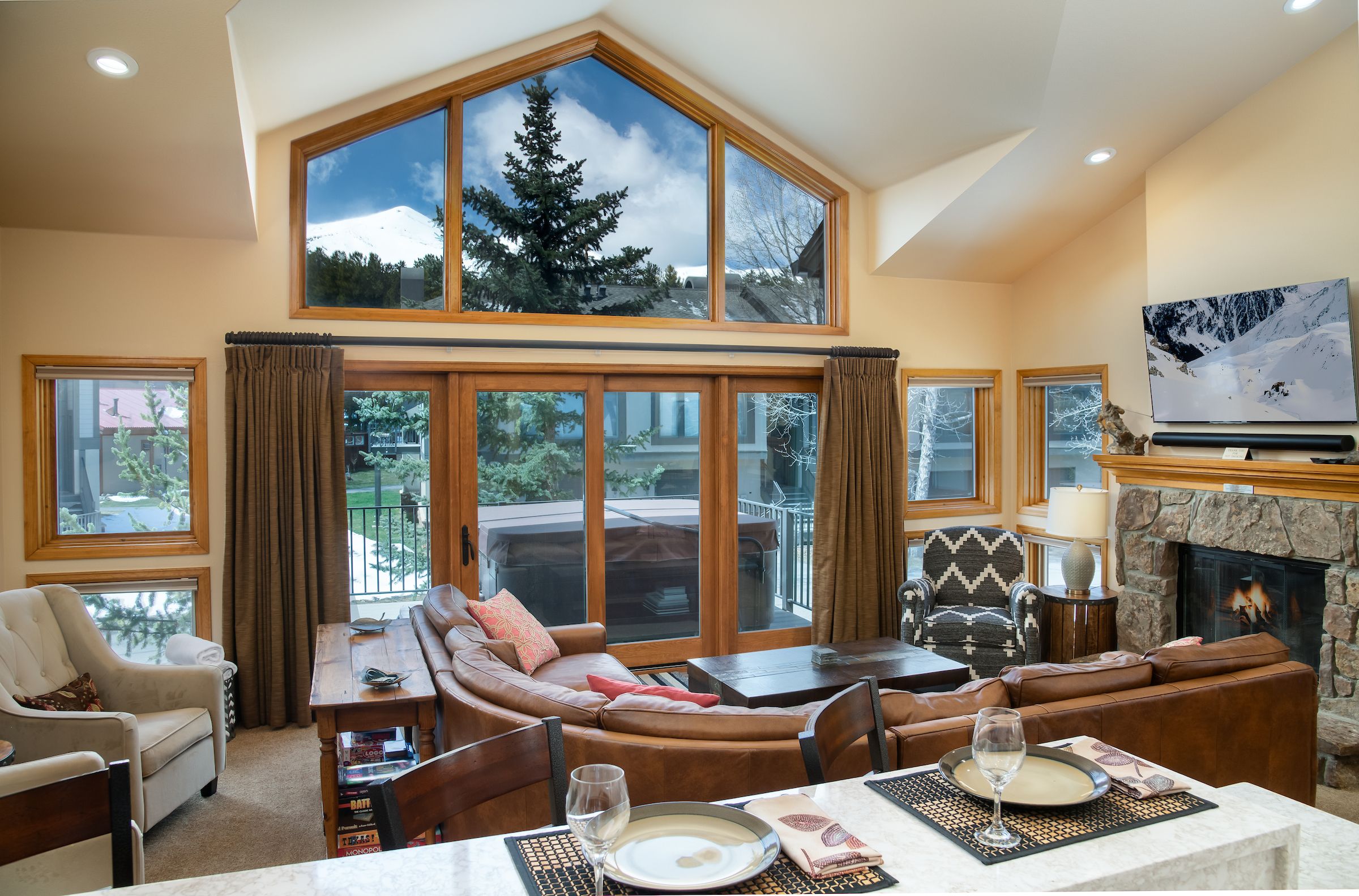Accommodating up to six guests, this 3-bedroom, 3-bathroom premium townhome boasts three bedroom suites with private bathrooms, catering perfectly to multiple families or couples seeking both privacy and togetherness. The living area, adorned with vaulted ceilings and bathed in natural light, invites relaxation with its large Smart TV, gas fireplace, and comfortable leather couch—a great spot for sharing stories of the day’s escapades on the slopes. Step out onto the deck from the living area and take in the mountain views from your own private hot tub.