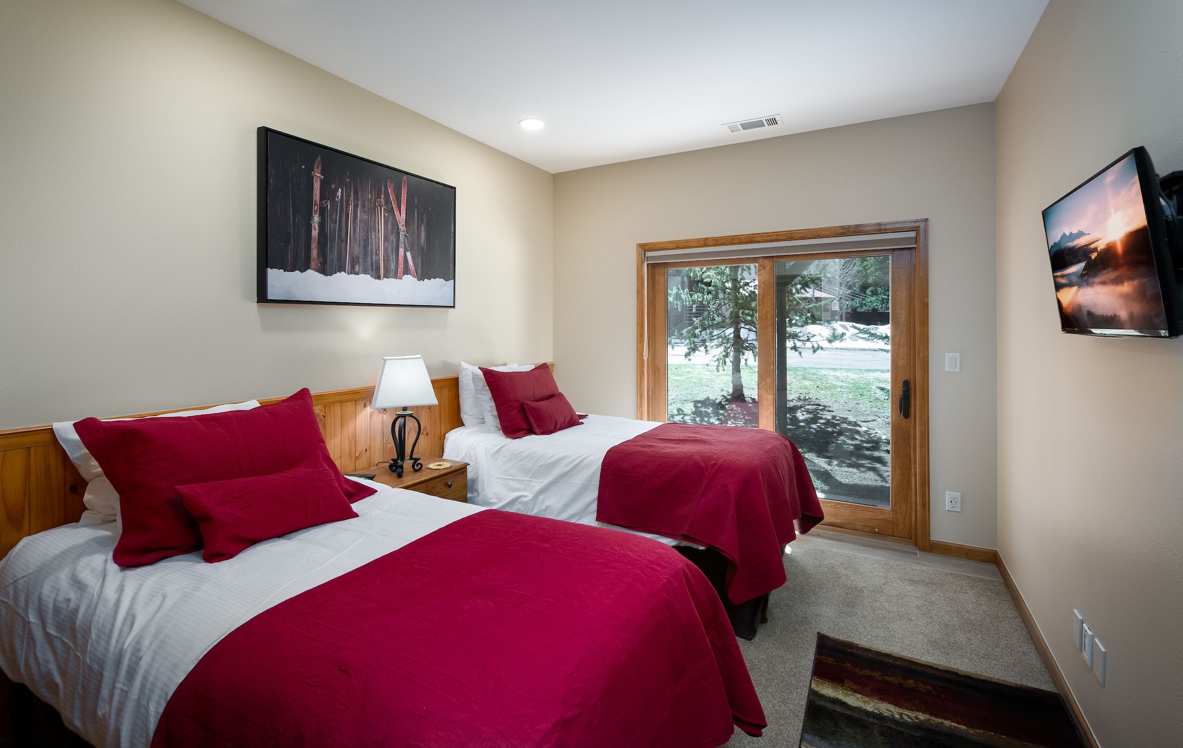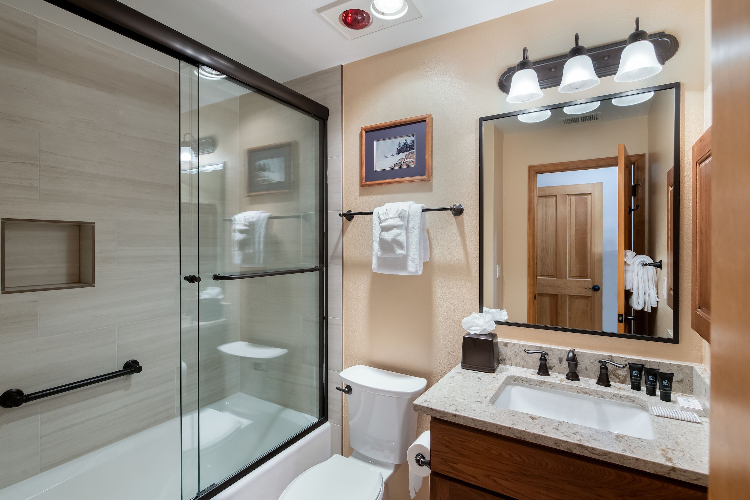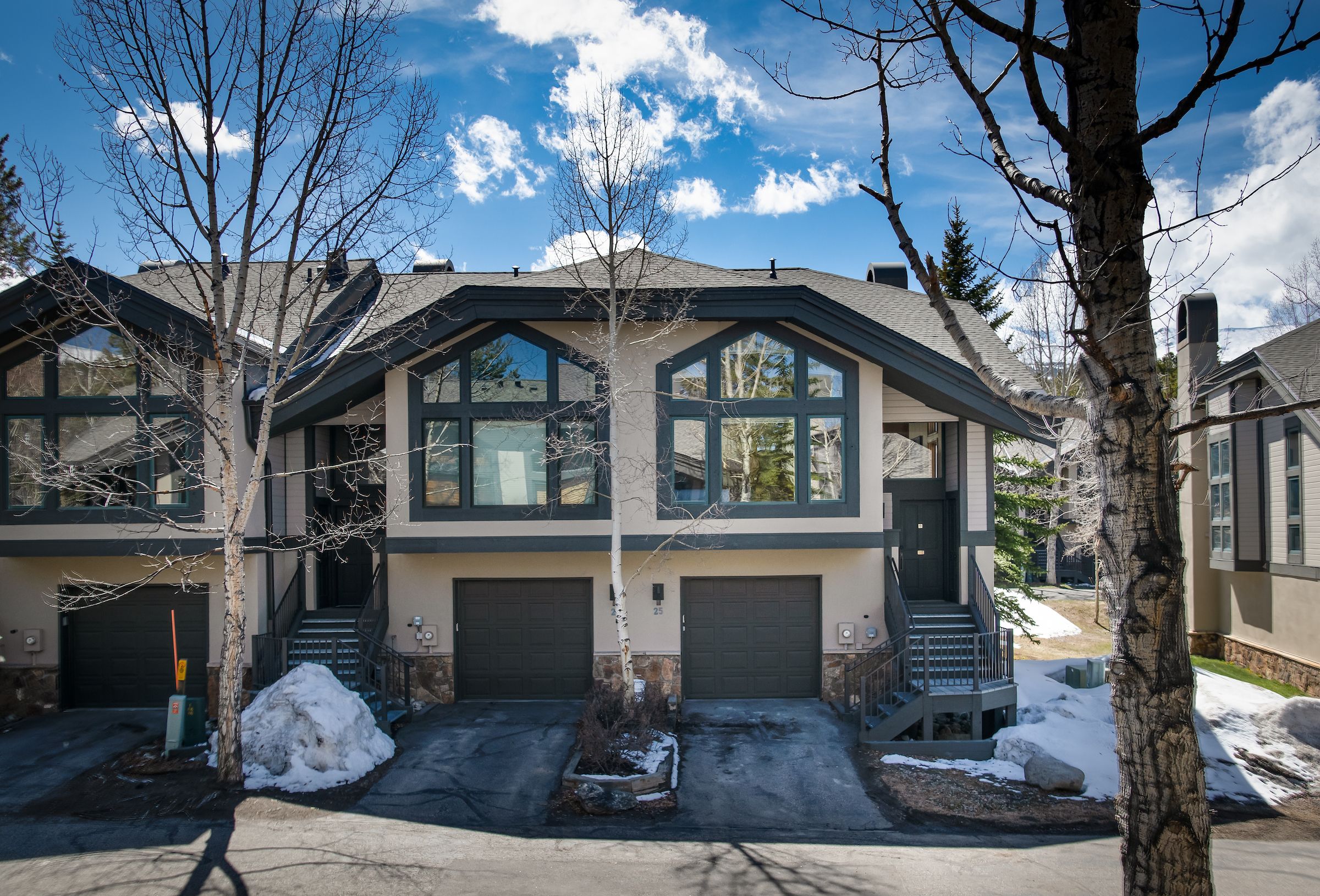 Accommodating up to six guests, this 3-bedroom, 3-bathroom premium townhome boasts three bedroom suites with private bathrooms, catering perfectly to multiple families or couples seeking both privacy and togetherness. The living area, adorned with vaulted ceilings and bathed in natural light, invites relaxation with its large Smart TV, gas fireplace, and comfortable leather couch—a great spot for sharing stories of the day’s escapades on the slopes. Step out onto the deck from the living area and take in the mountain views from your own private hot tub.