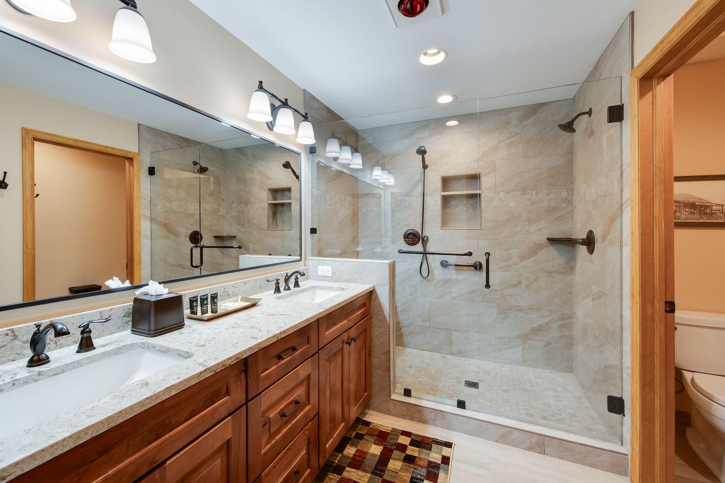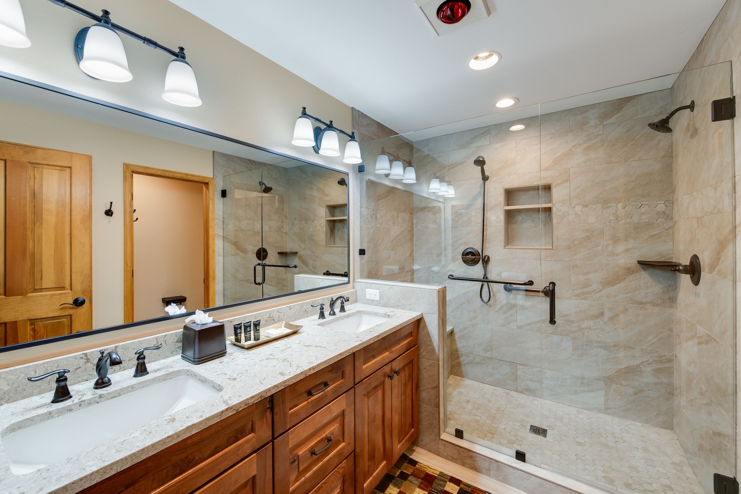 - King master suite: king bed, private bathroom with double walk-in tile shower and 2 sinks, Smart TV. (sleeps 2)