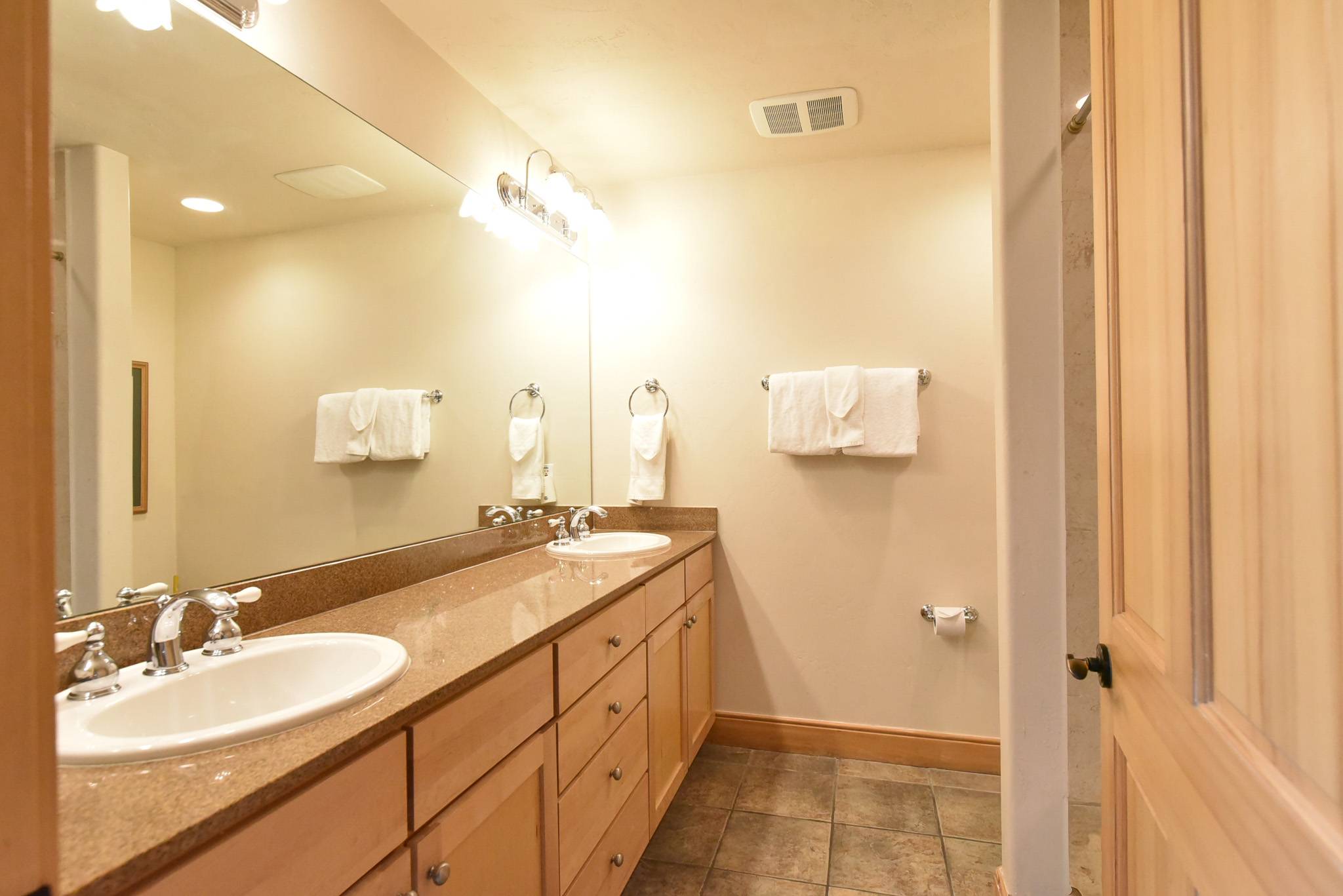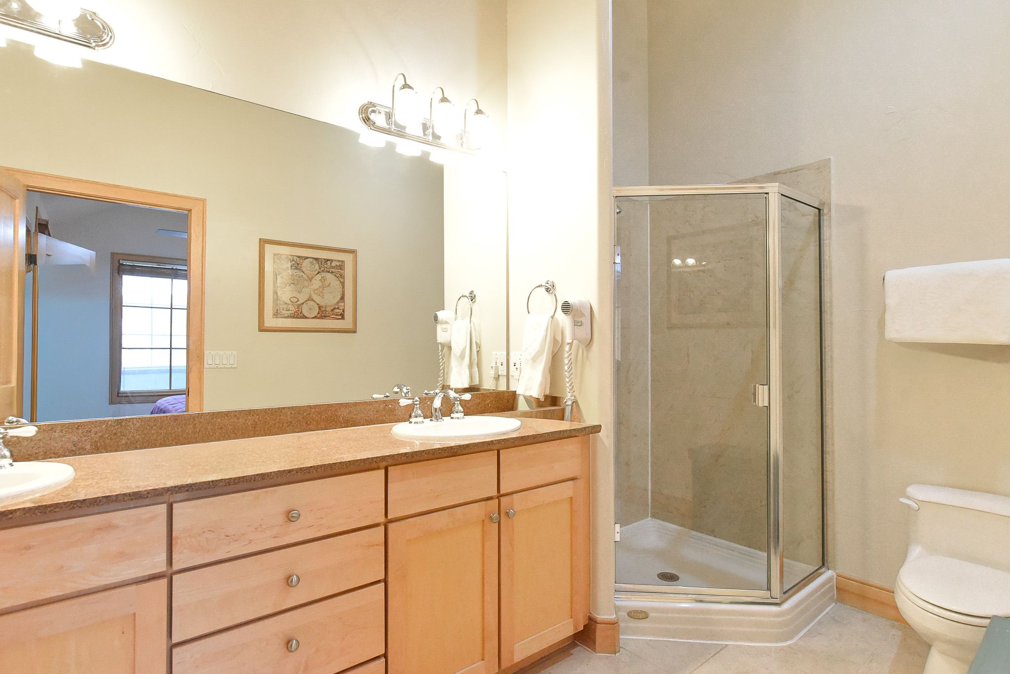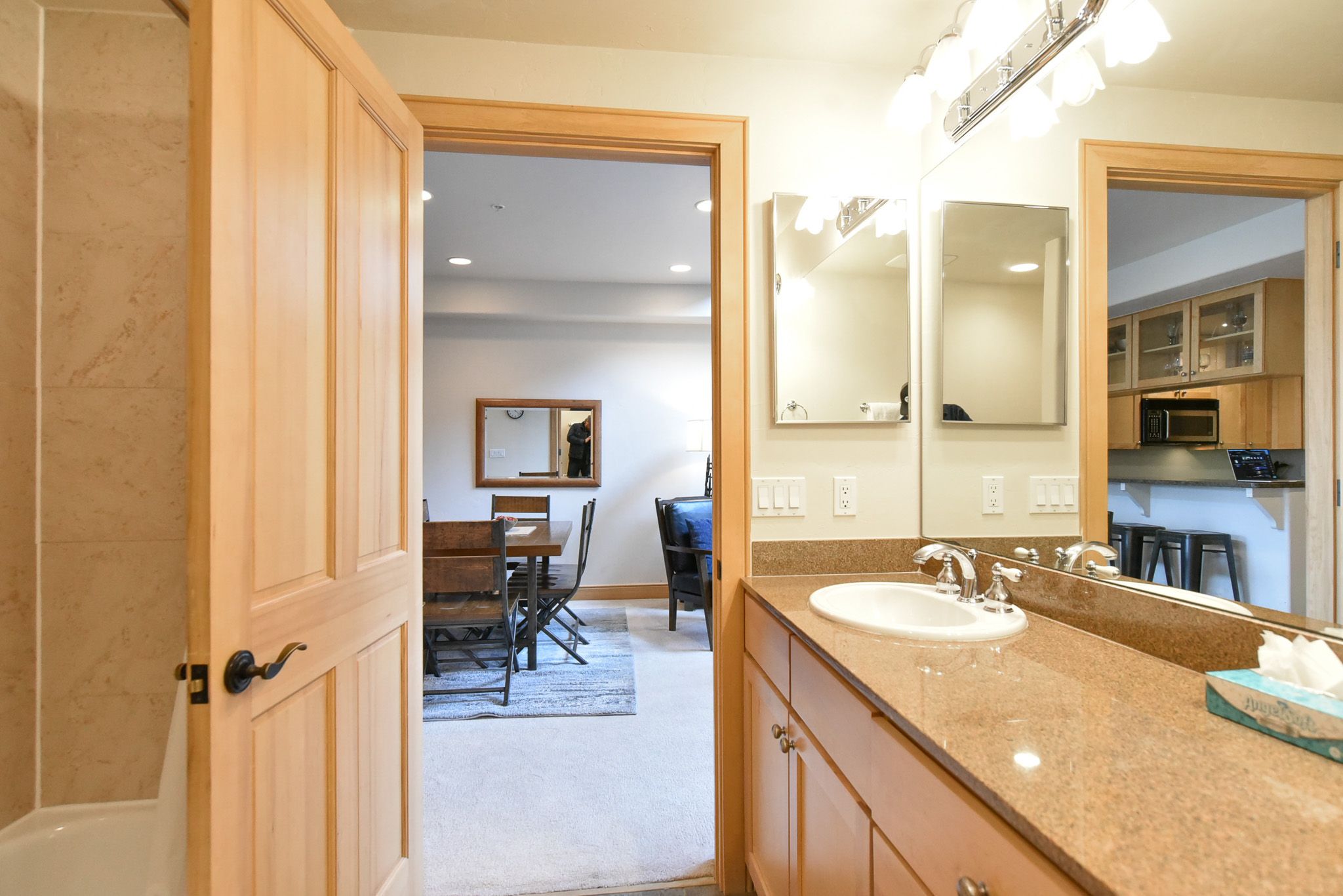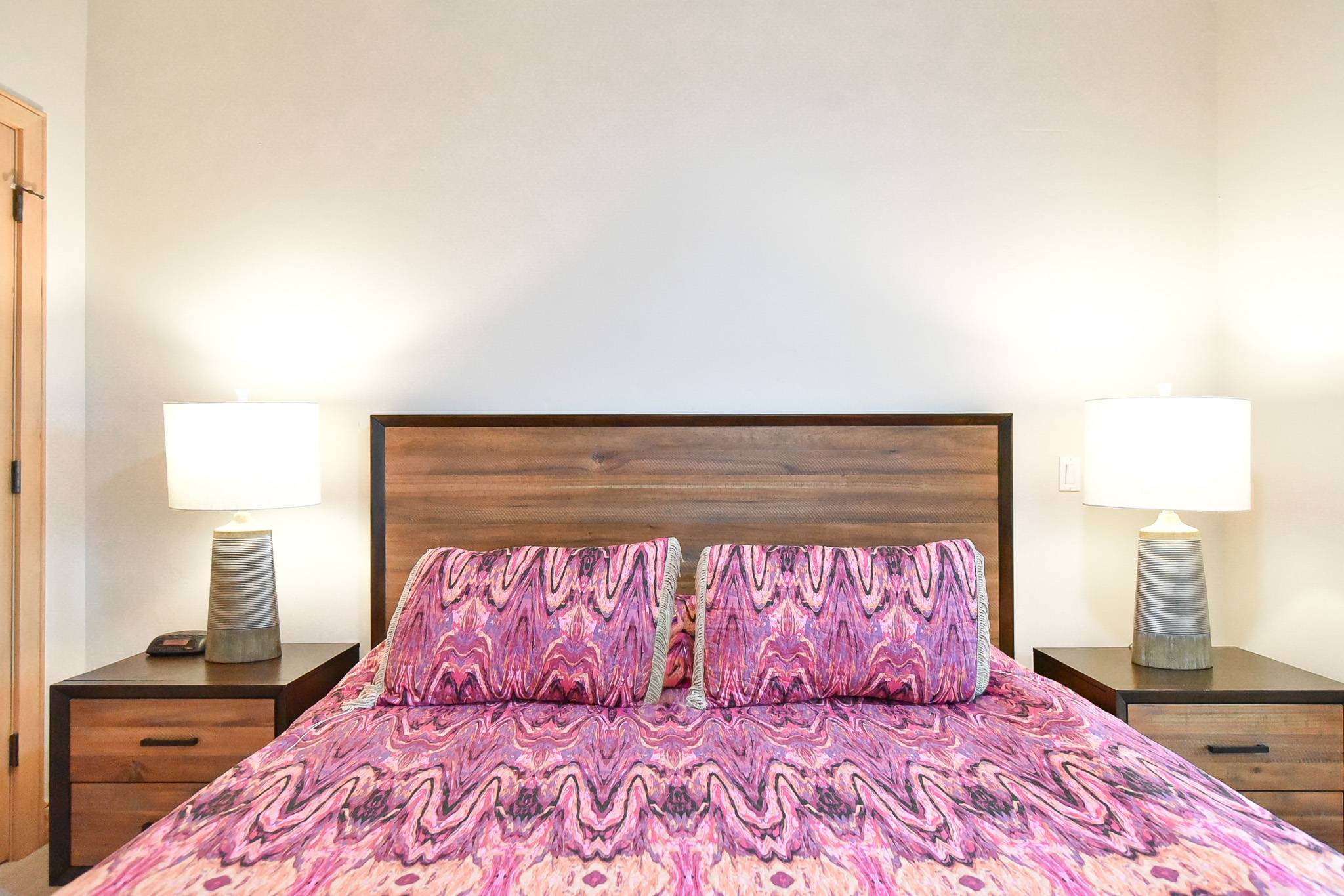 The two-level layout offers a wonderful sense of separation while still feeling connected. The main level queen bedroom provides a peaceful retreat with mountain views that set the tone for a restful night’s sleep. The shared hallway bathroom is spacious with dual vanities and a shower and tub combination. Upstairs, the king master suite feels like its own sanctuary. Raised ceilings, a comfortable seating area, a TV and a spa-like ensuite with dual vanities, a walk-in shower and a large soaking tub all come together to create a space you may never want to leave. A washer and dryer in the unit adds even more convenience during extended stays or adventure-filled days.