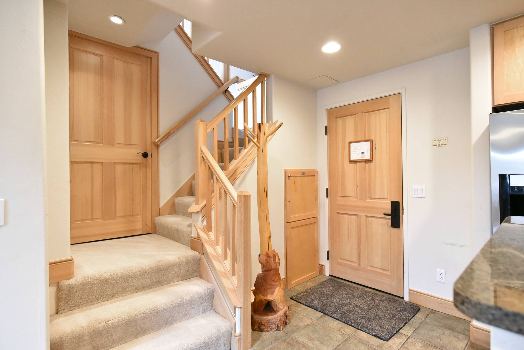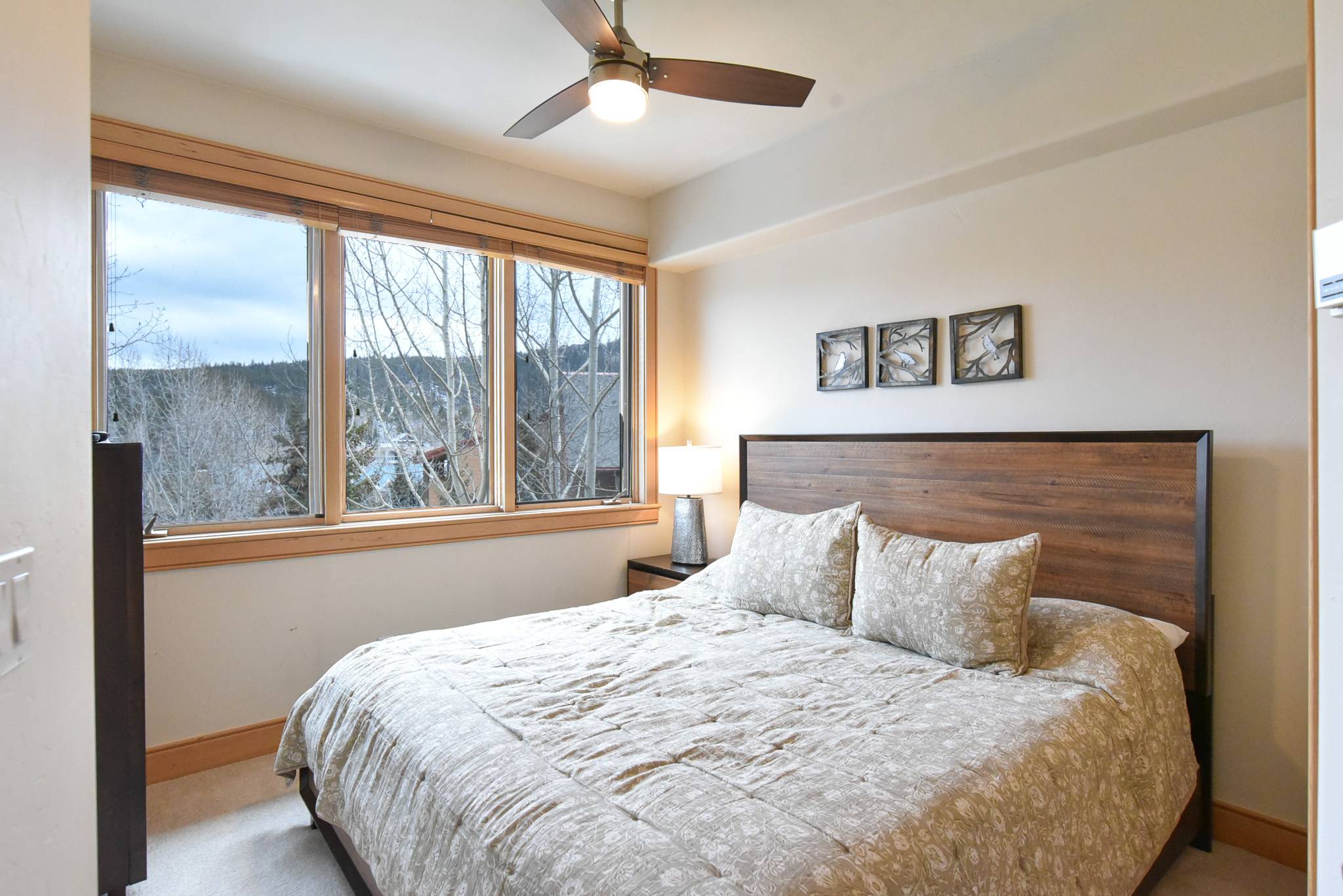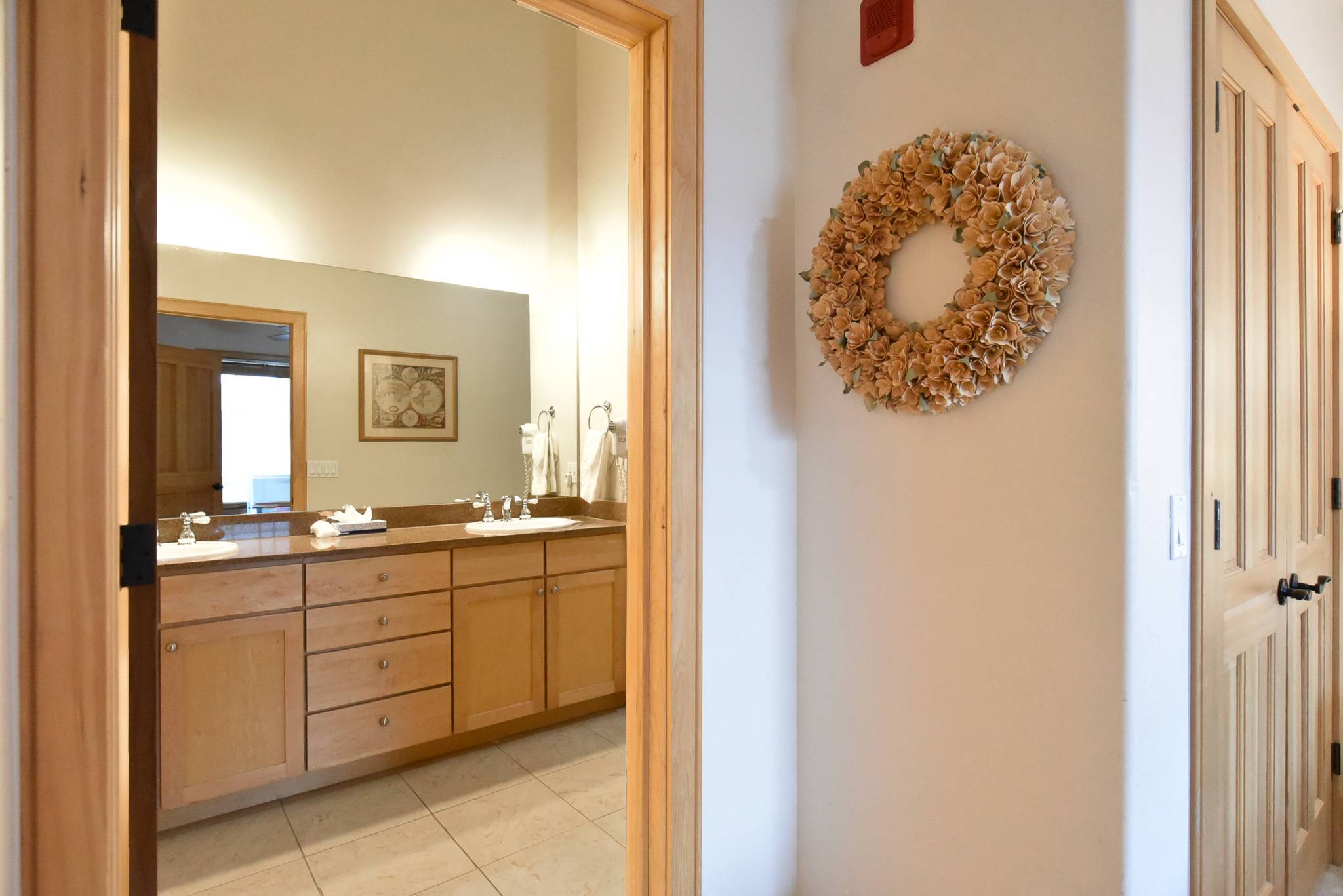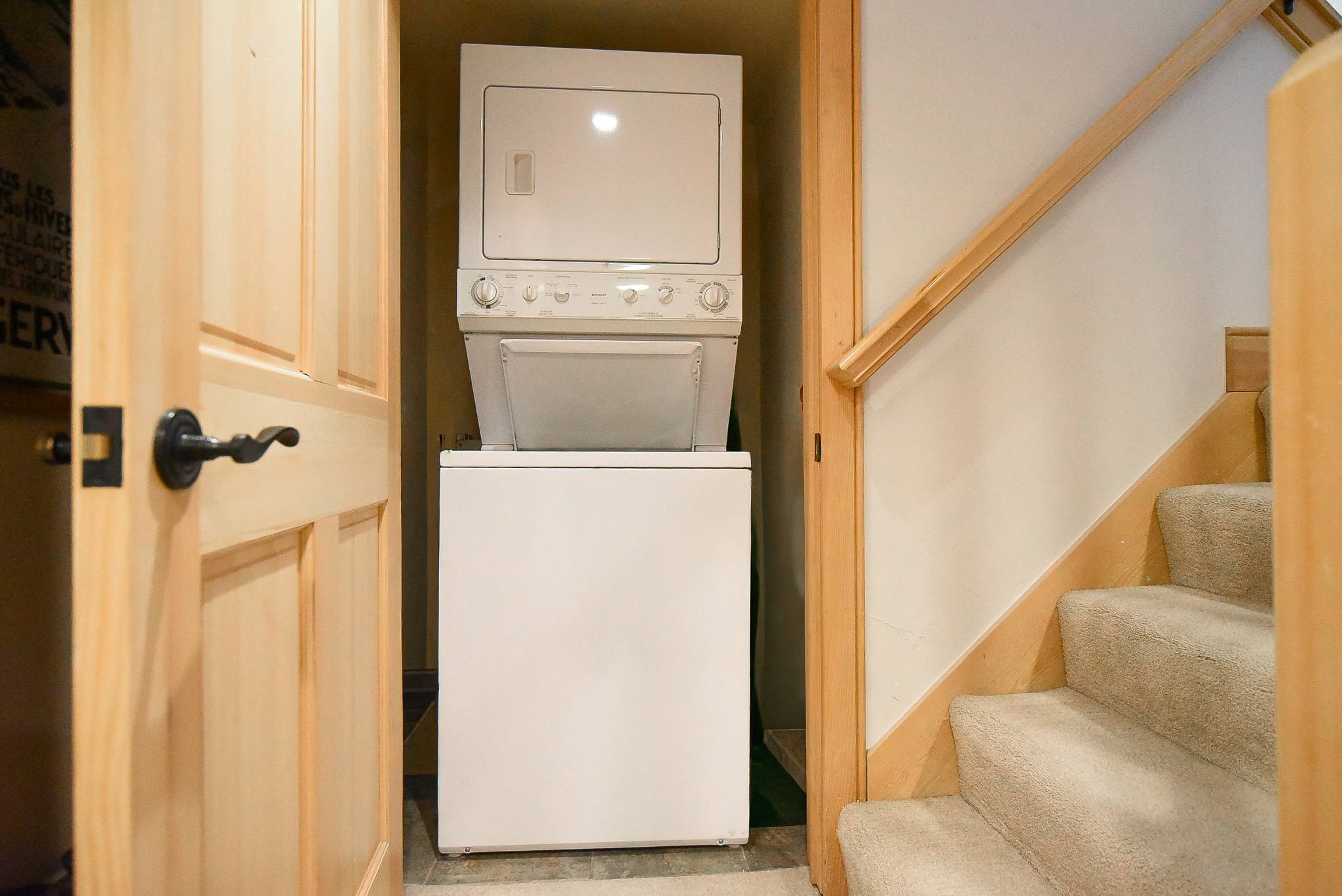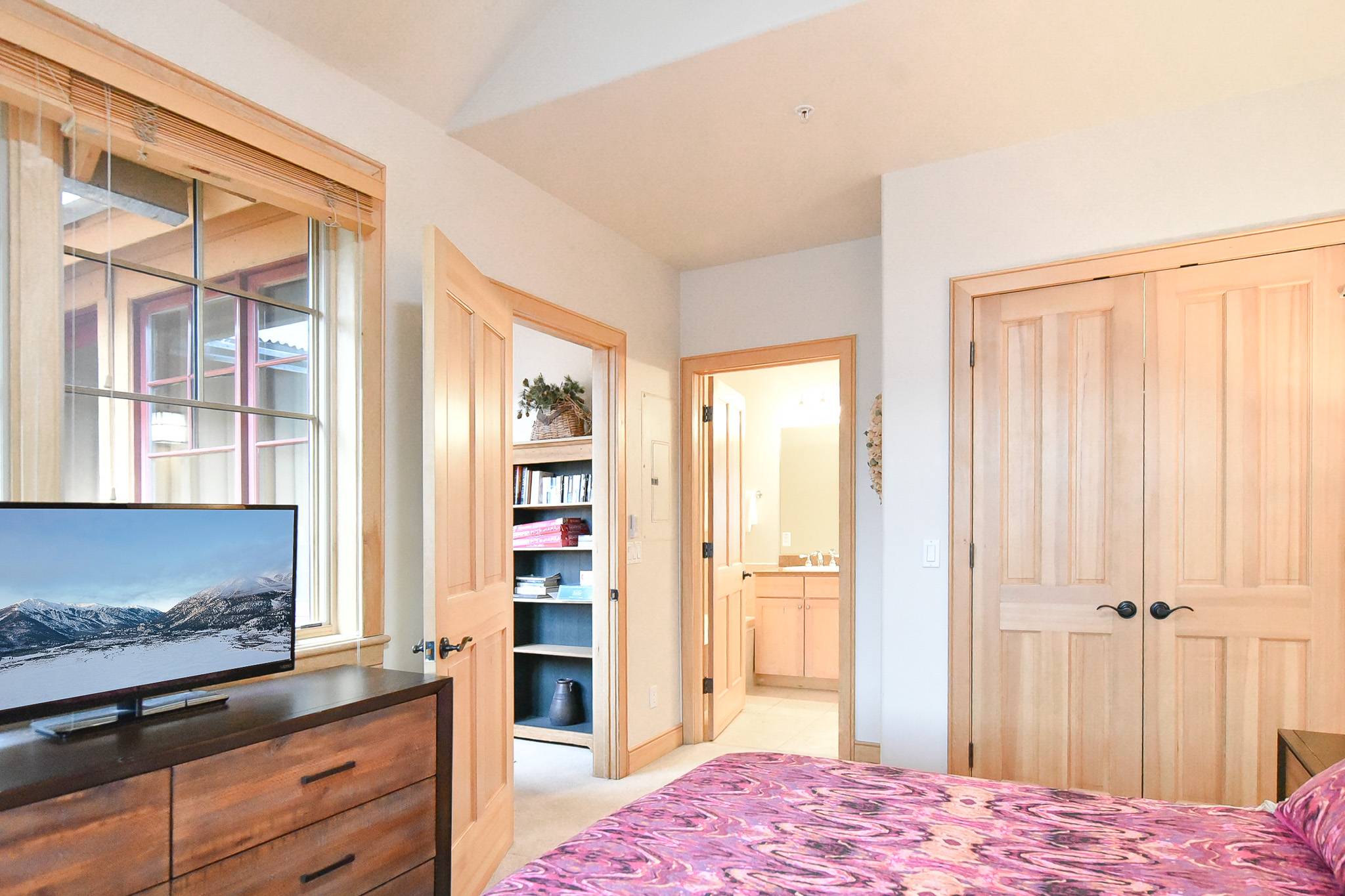 The two-level layout offers a wonderful sense of separation while still feeling connected. The main level queen bedroom provides a peaceful retreat with mountain views that set the tone for a restful night’s sleep. The shared hallway bathroom is spacious with dual vanities and a shower and tub combination. Upstairs, the king master suite feels like its own sanctuary. Raised ceilings, a comfortable seating area, a TV and a spa-like ensuite with dual vanities, a walk-in shower and a large soaking tub all come together to create a space you may never want to leave. A washer and dryer in the unit adds even more convenience during extended stays or adventure-filled days.