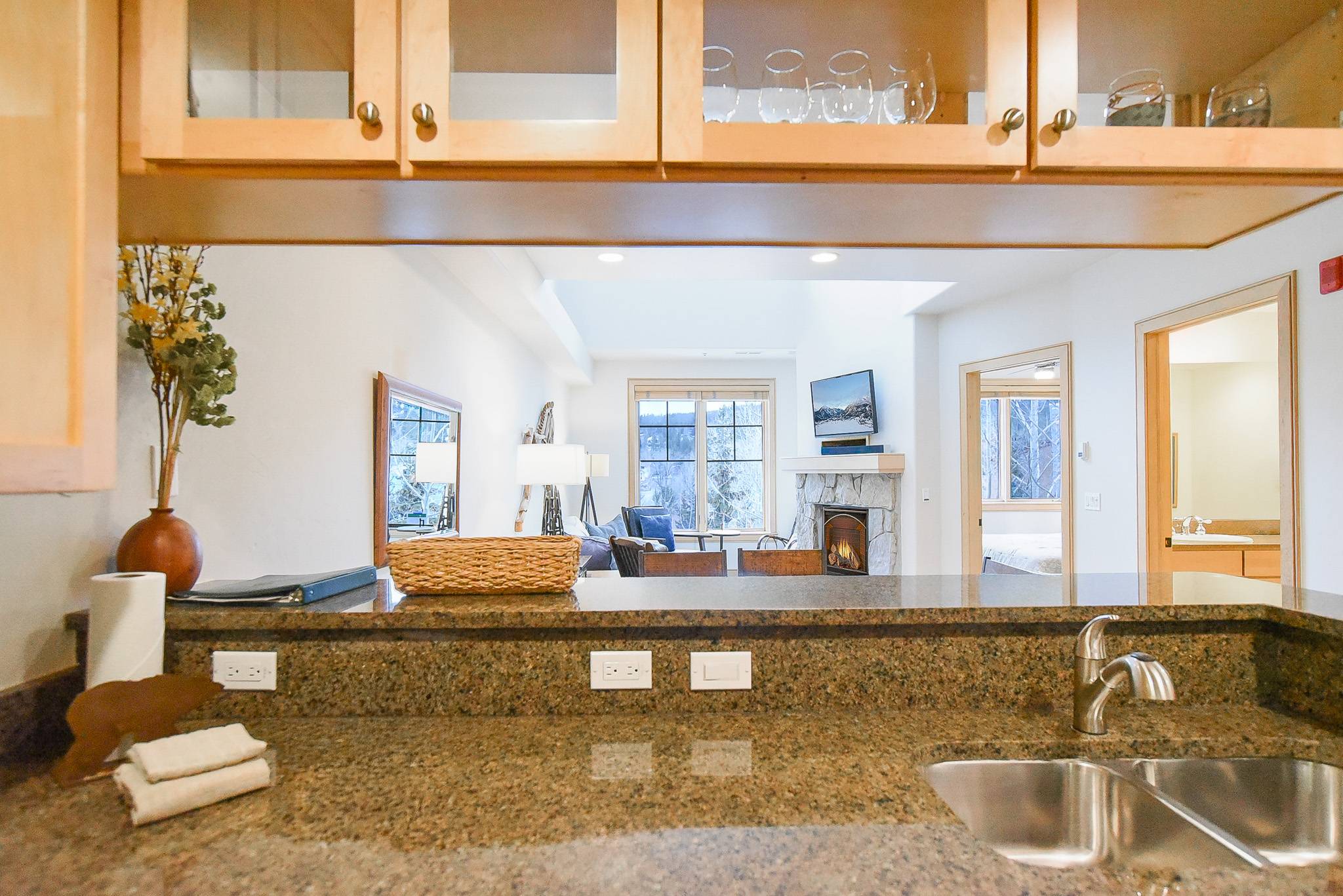 Step inside and let the warmth of the living area welcome you in. Sunlight filters through the windows, highlighting the vaulted ceilings, the inviting gas fireplace and the comfortable furnishings that create a perfect space for unwinding after a day on the mountain. The kitchen brings everyone together with its granite counters, stainless steel appliances and plenty of room to gather for meals or casual conversation. From morning coffee to après snacks, it is a space that feels both functional and naturally cozy. And when you want a moment of pure relaxation, your private hot tub awaits on the balcony with beautiful mountain views.