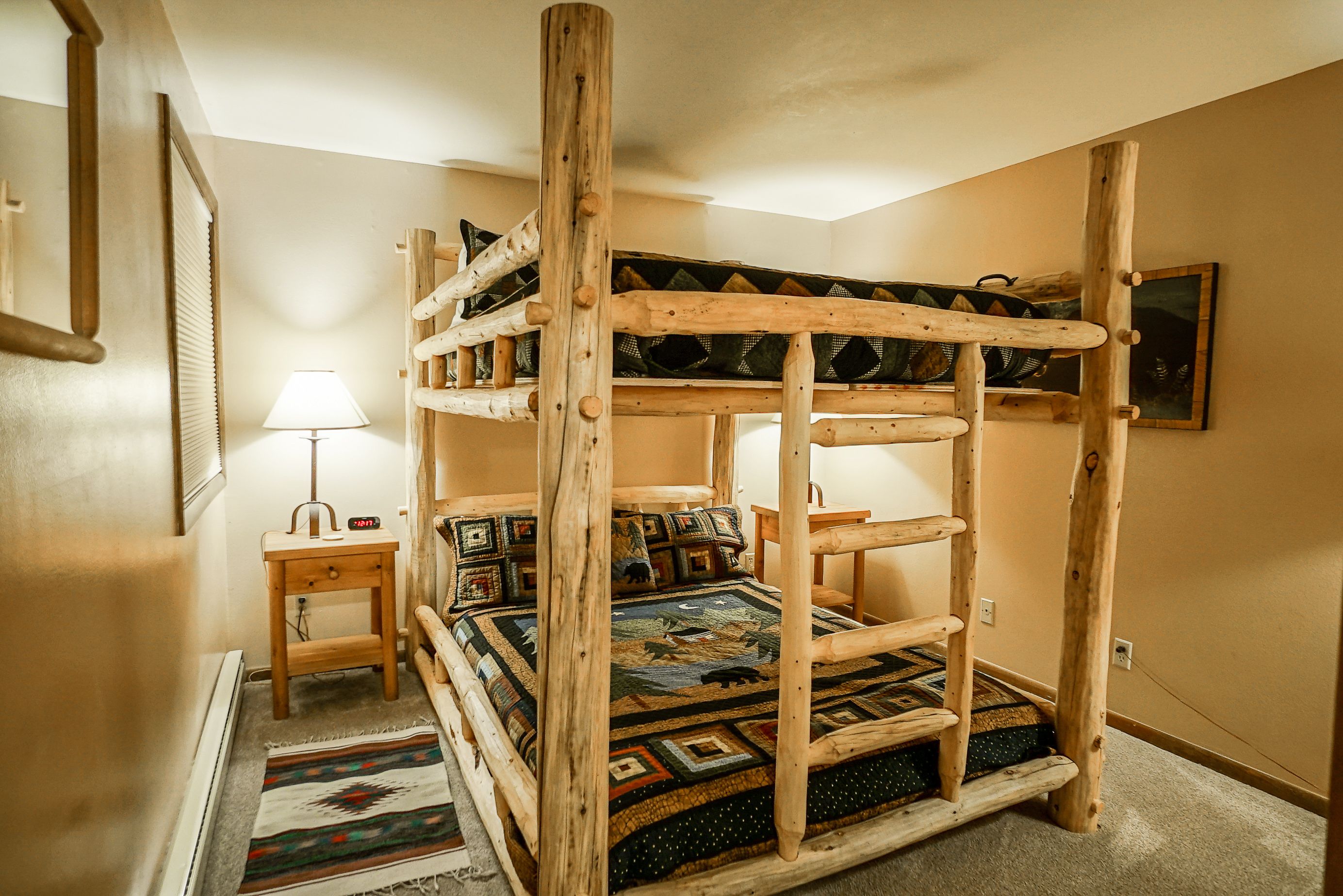 - Queen bunk suite: queen-over-queen bunk bed, private bathroom with tub/shower, flat-screen TV. (sleeps 4)
