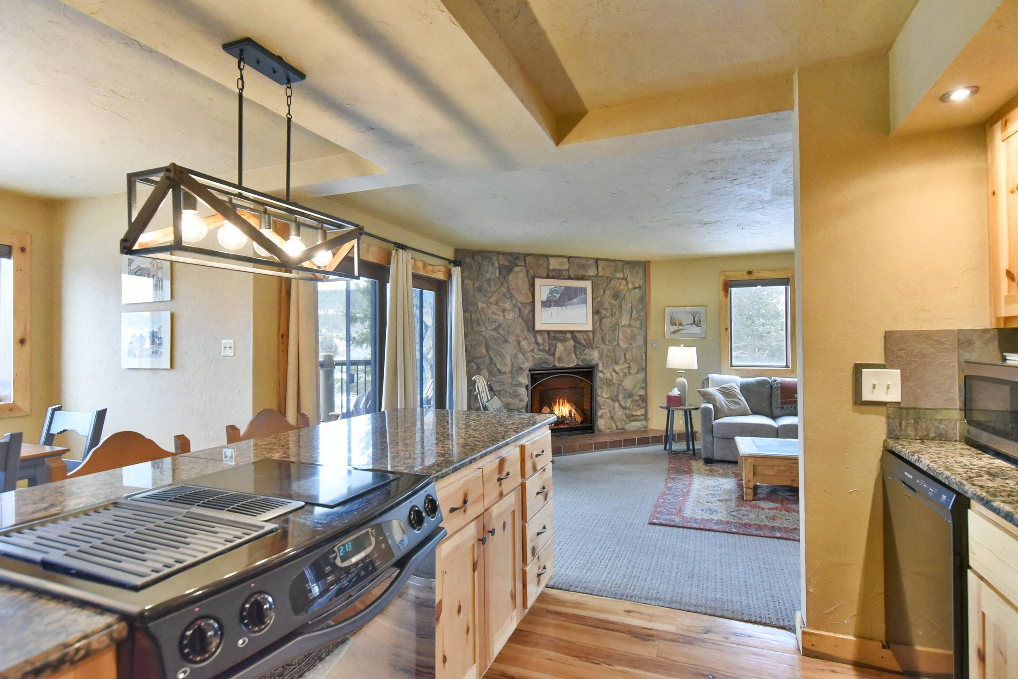This 2-bedroom, 2-bathroom condo works perfectly for families or groups of up to eight. The living area is cozy with comfortable furniture, a river-rock gas fireplace, and a huge flat-screen Smart TV. The fully equipped kitchen has everything you need to whip up snacks or a home-cooked meal, and there’s plenty of room for everyone with six places at the dining room table and three more at the counter.