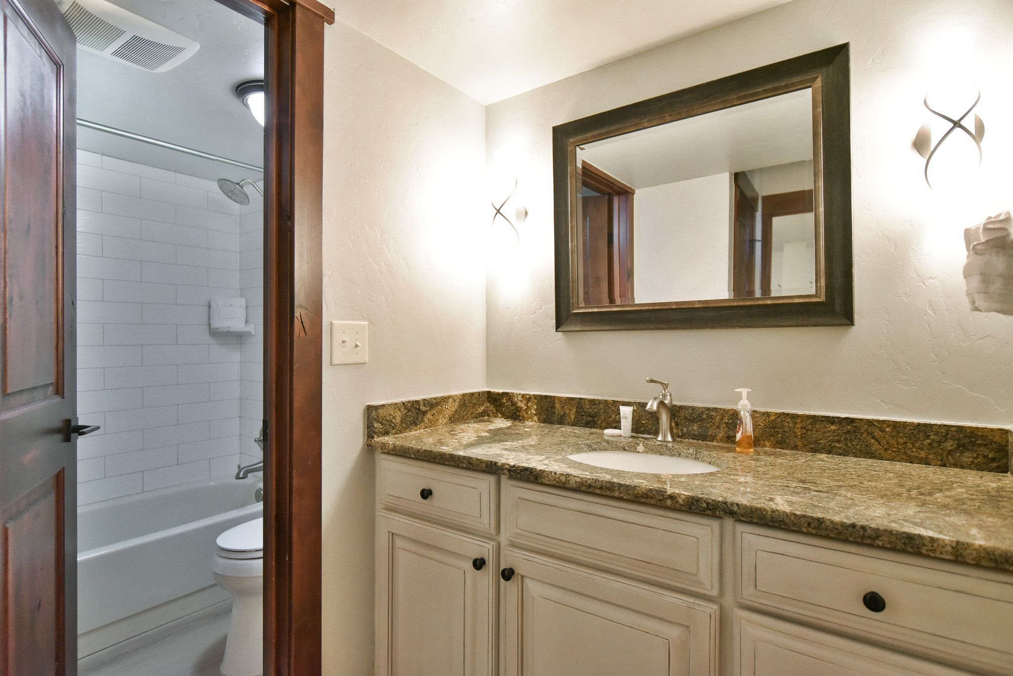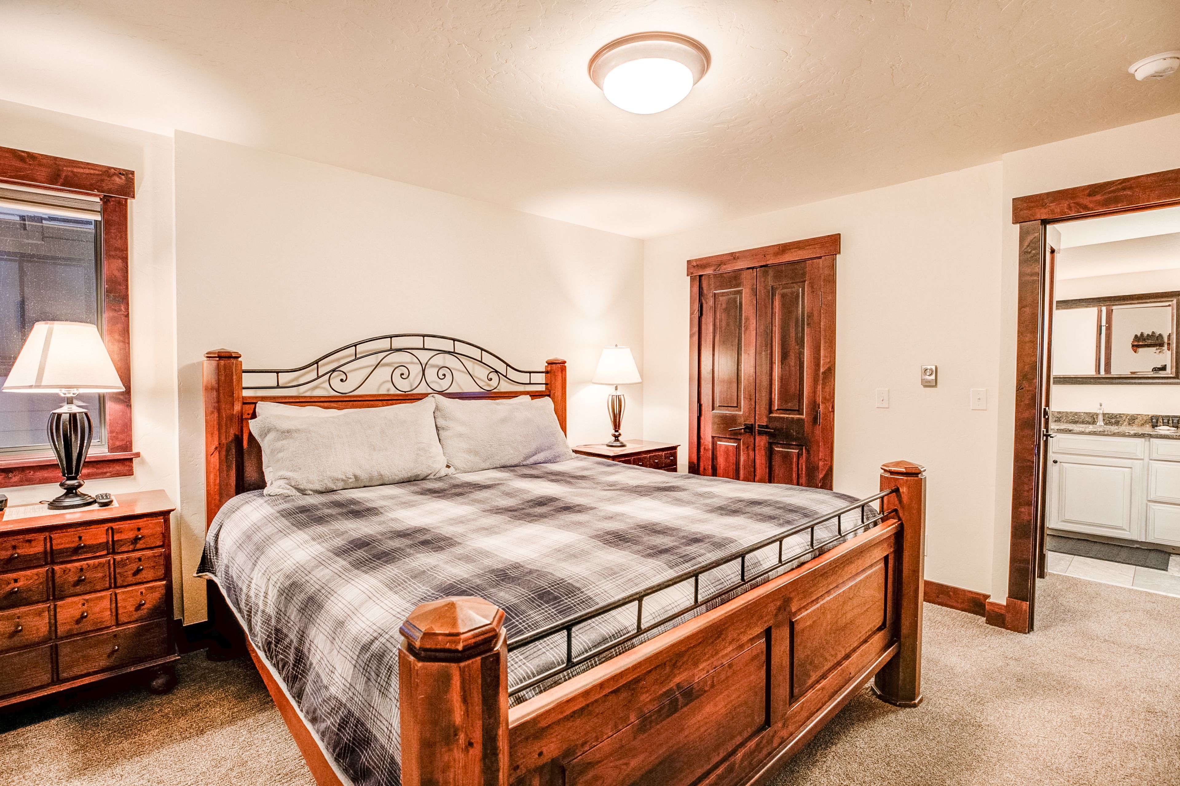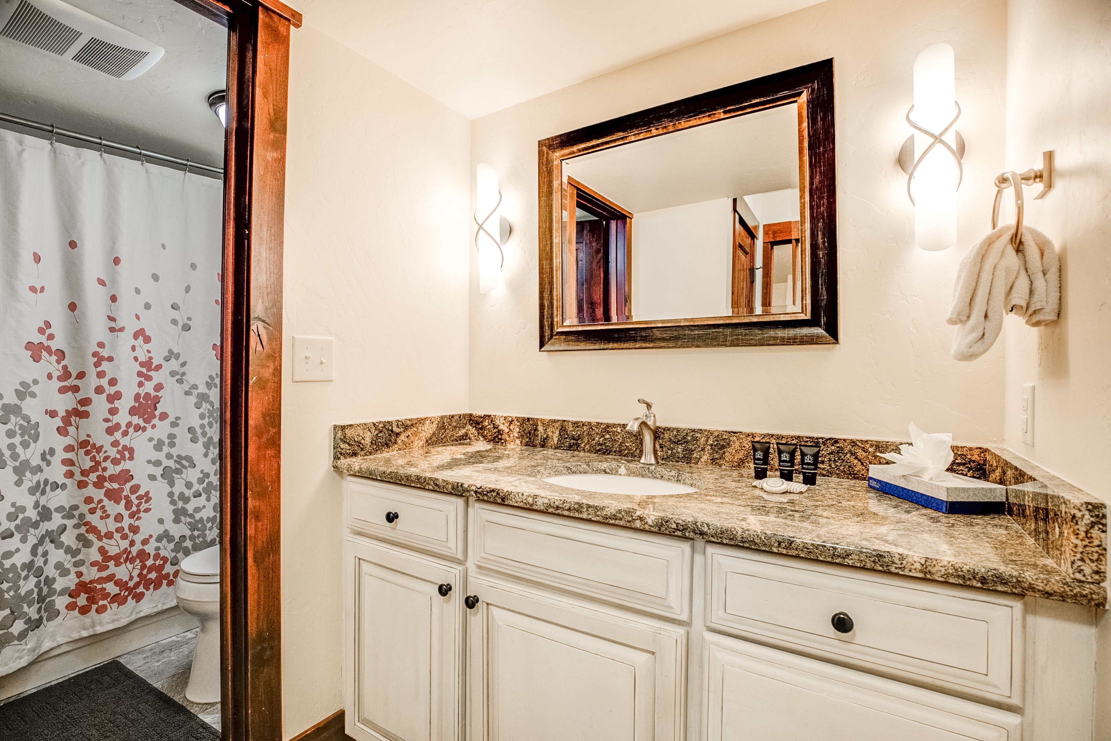 This 2-bedroom, 2-bathroom condo is the perfect getaway for families or groups of up to eight. Walking into the living area, you’ll like the comfortable furniture and natural light, as well as a beautiful river-rock gas fireplace and flat-screen TV. The fully equipped kitchen has beautiful granite countertops and all the gear you’ll need to make memorable mountain meals. There’s also a private balcony for taking in the crisp mountain air.