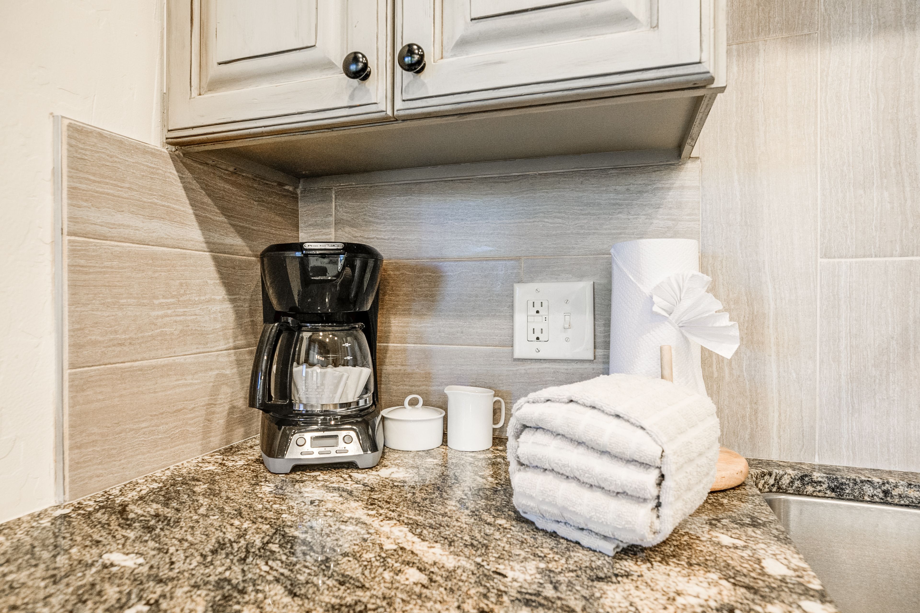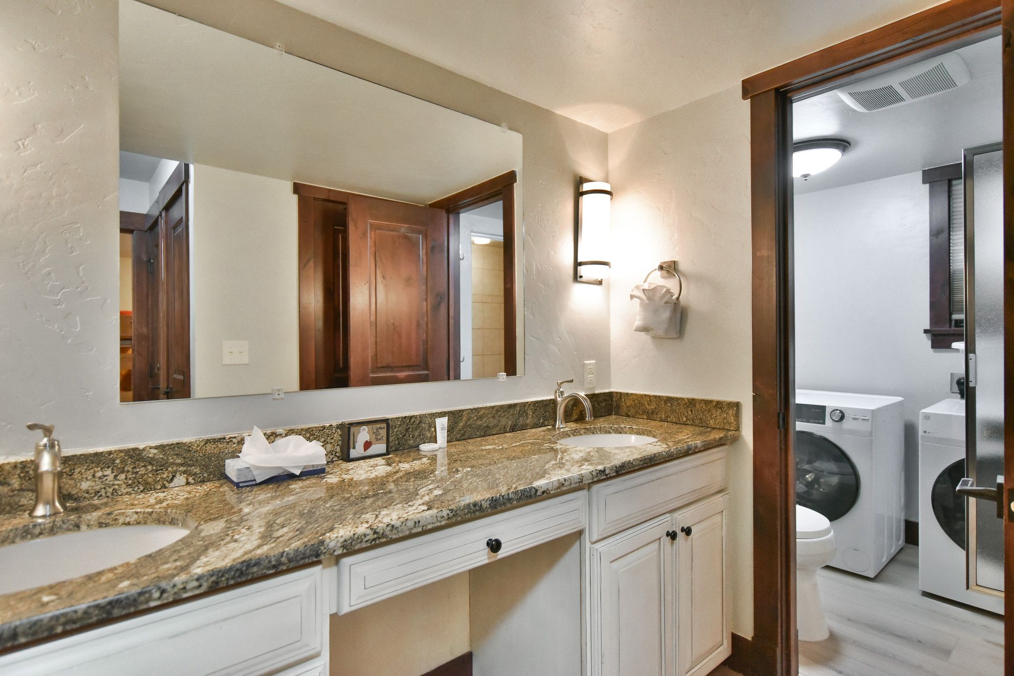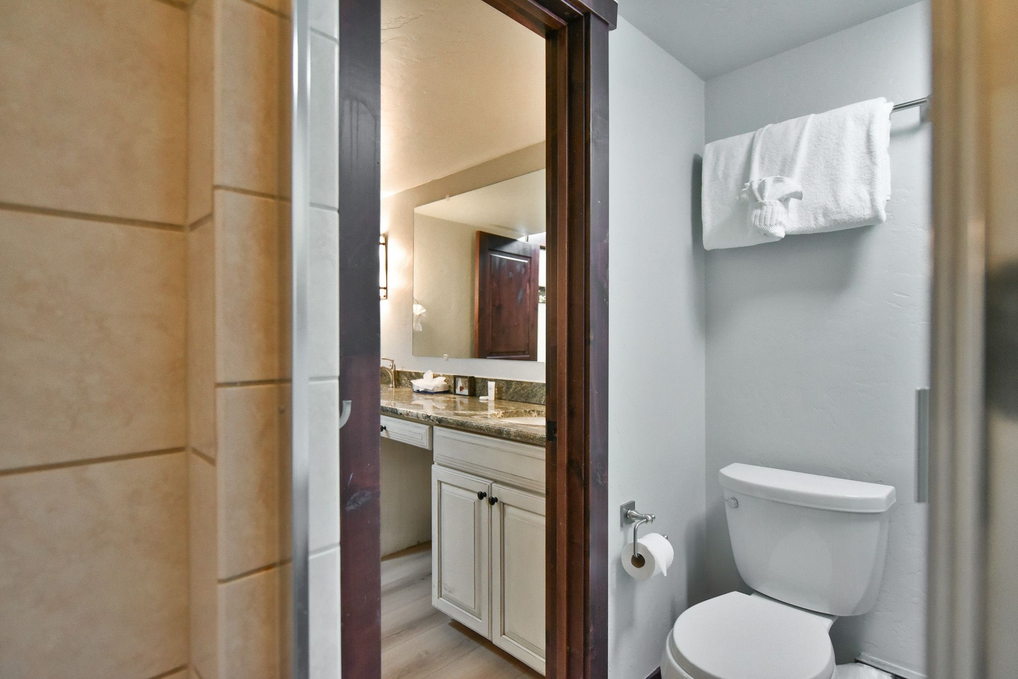 This 2-bedroom, 2-bathroom condo is the perfect getaway for families or groups of up to eight. Walking into the living area, you’ll like the comfortable furniture and natural light, as well as a beautiful river-rock gas fireplace and flat-screen TV. The fully equipped kitchen has beautiful granite countertops and all the gear you’ll need to make memorable mountain meals. There’s also a private balcony for taking in the crisp mountain air.