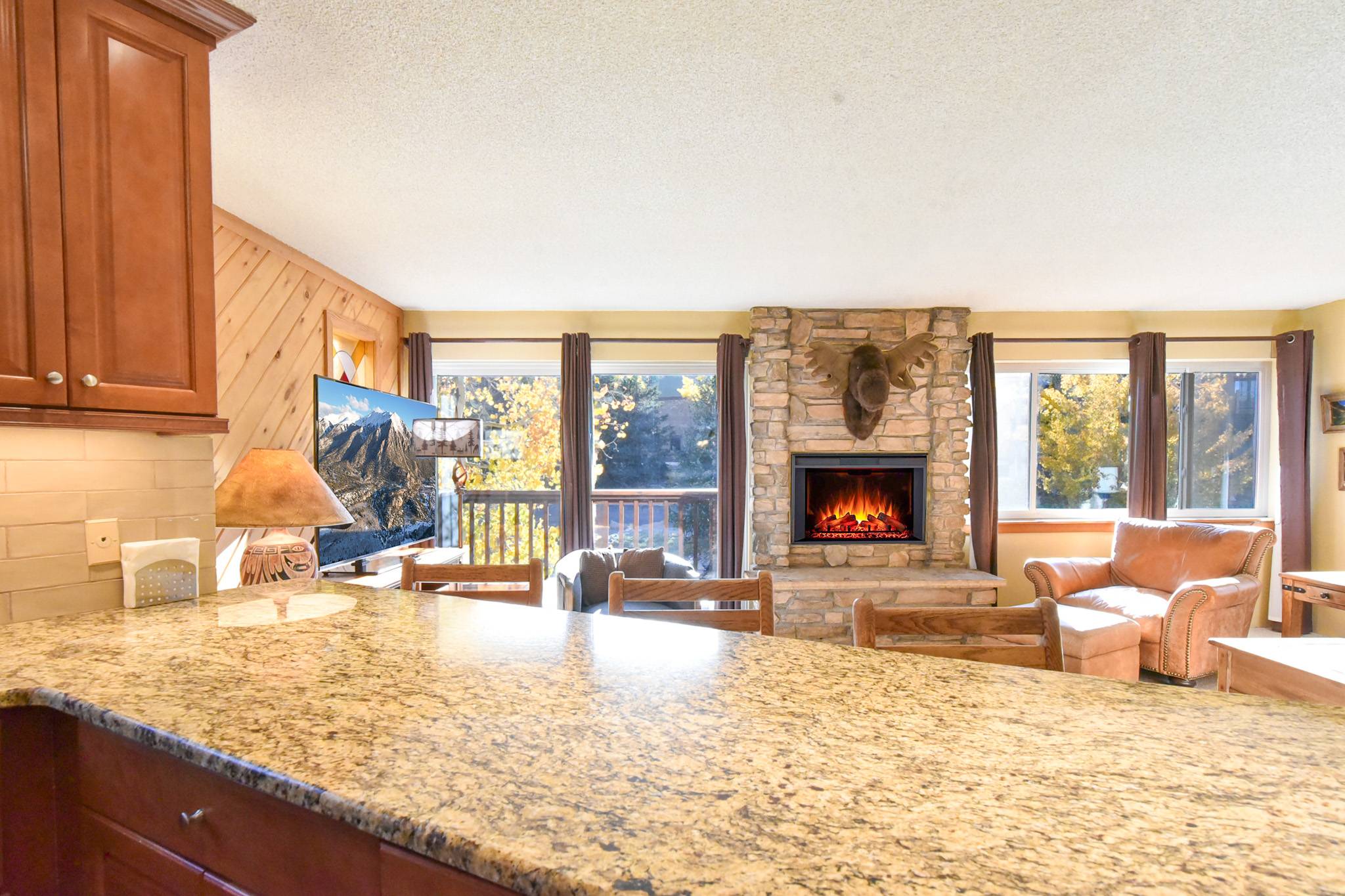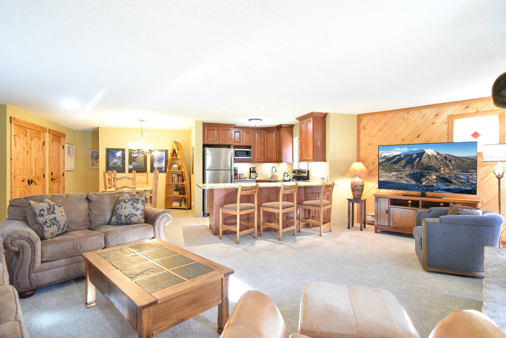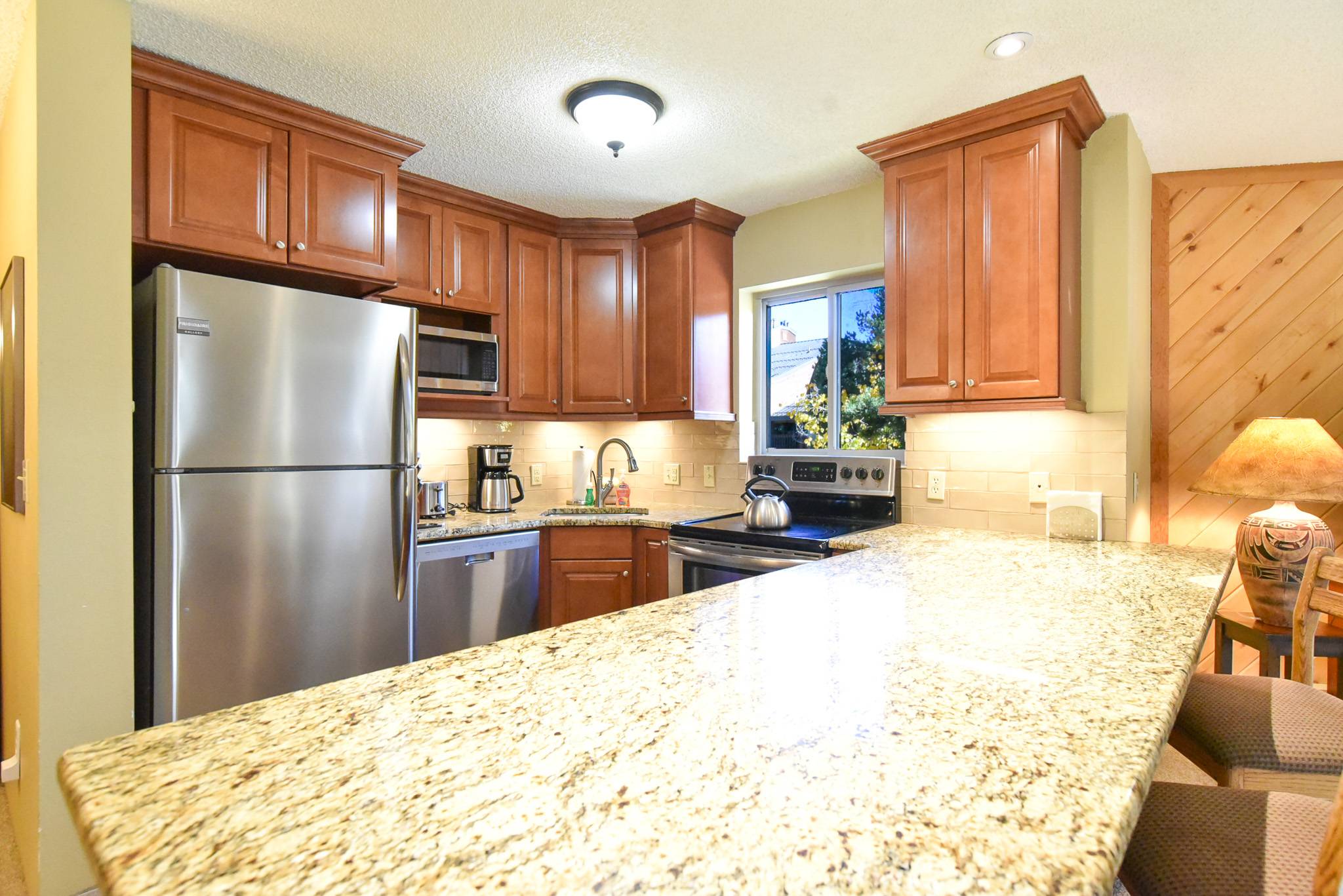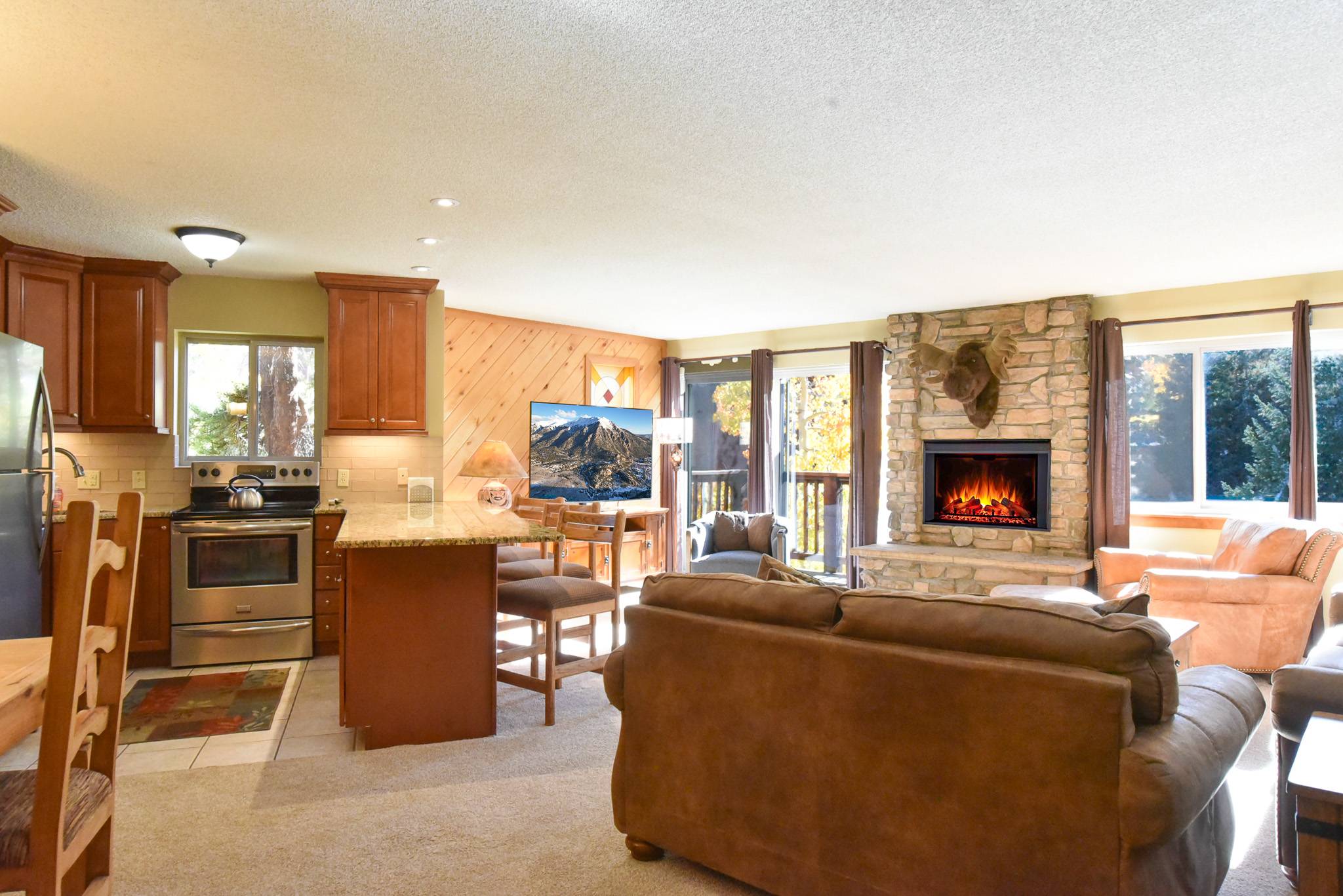 Inside, the condo captures that warm alpine feel while offering modern comfort throughout. The open-concept living area features a gas fireplace, a comfortable sofa (that doubles as a sleeper), and access to a private patio surrounded by fresh mountain air. It’s an inviting space to relax and reconnect after a day outdoors. The updated kitchen features granite countertops and stainless steel appliances, fully equipped for everything from easy breakfasts before hitting the slopes to shared evening meals with family and friends.