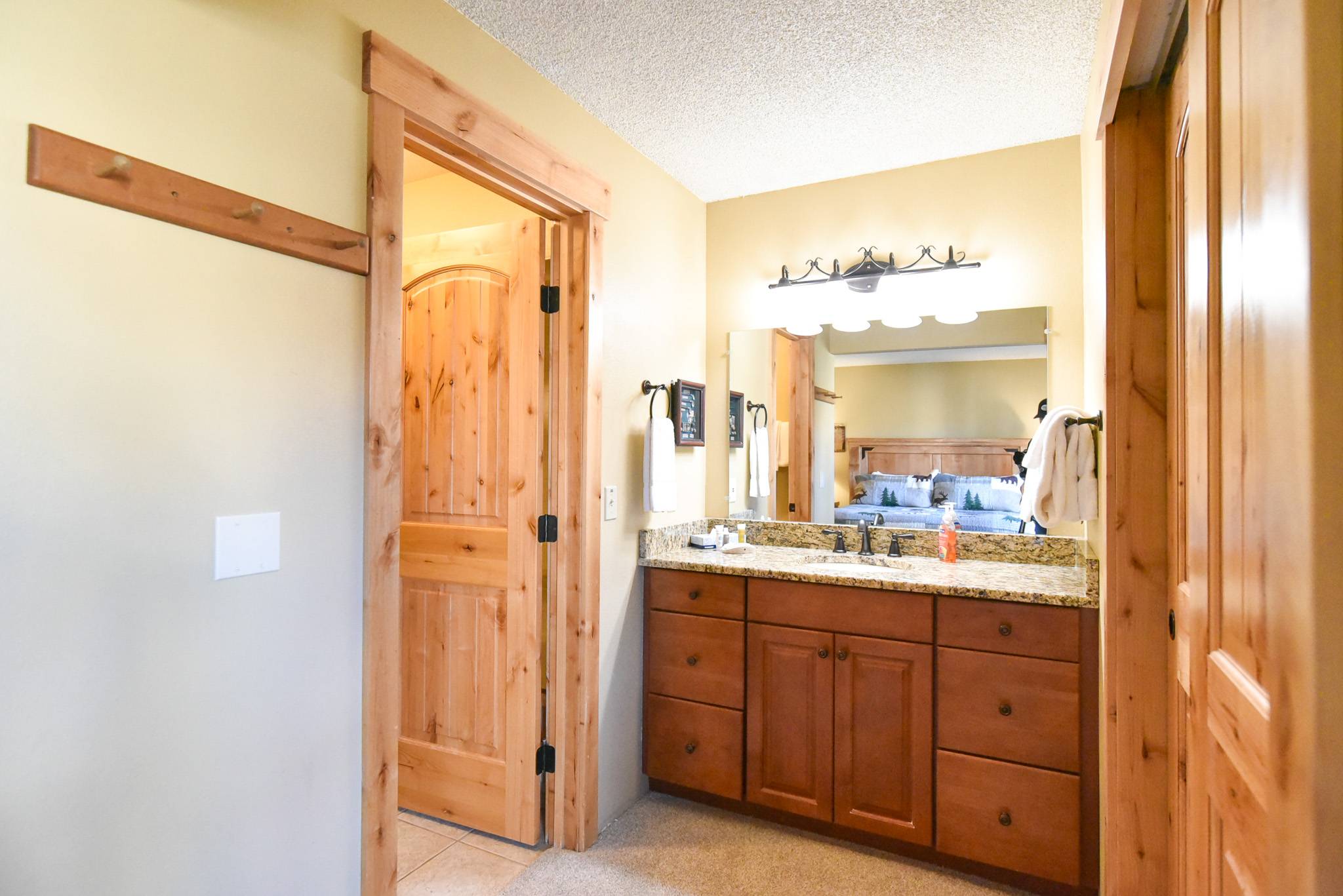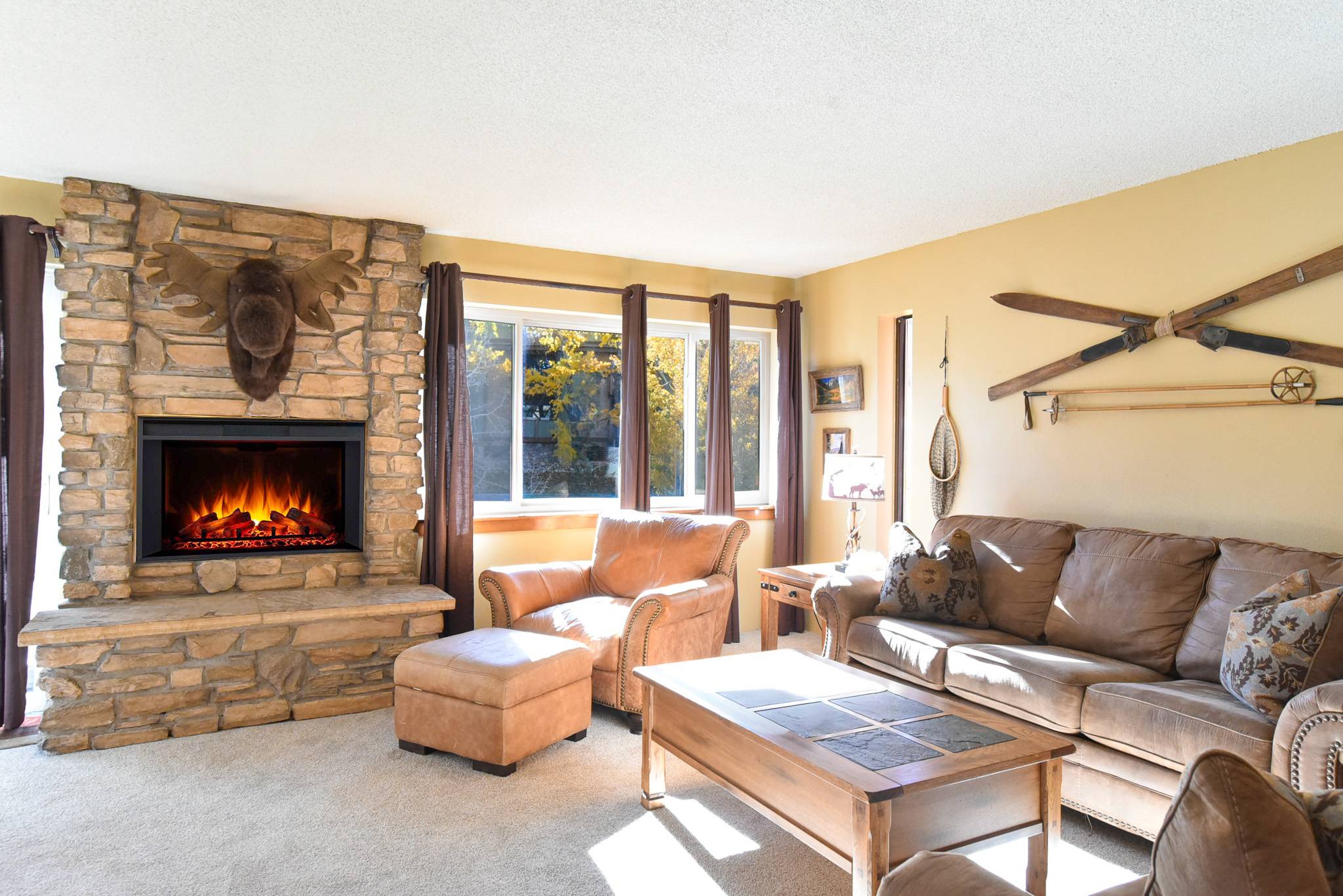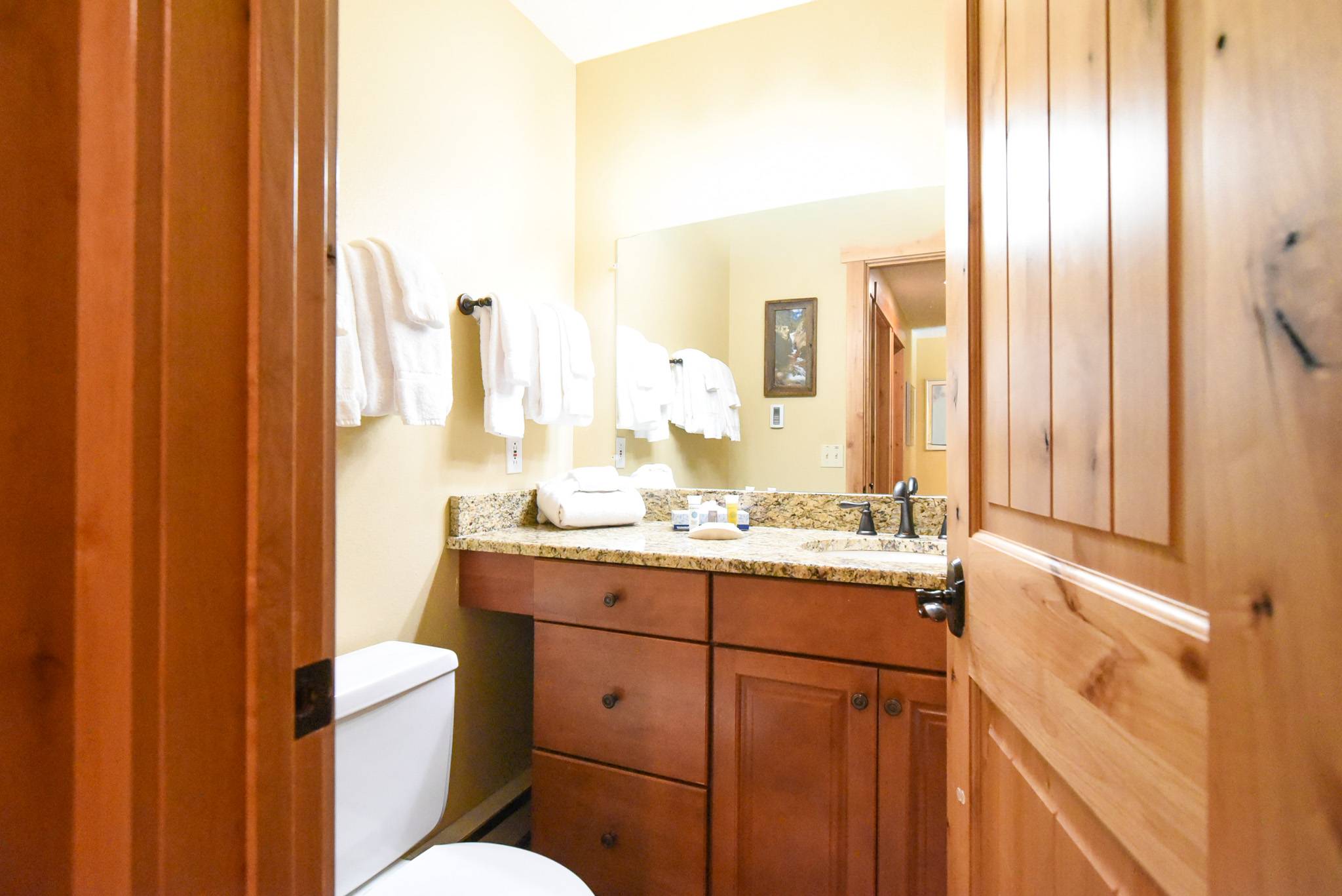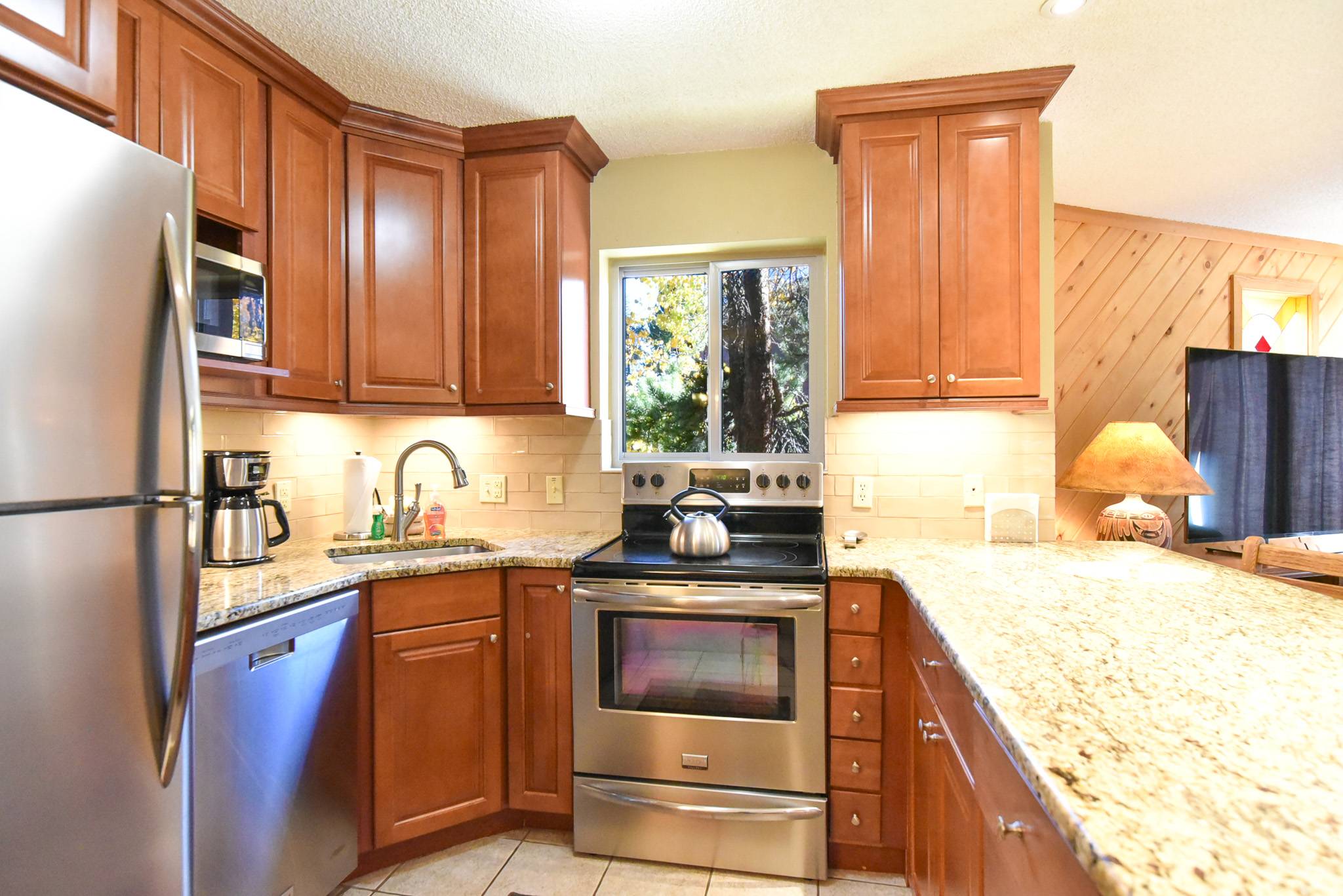 Inside, the condo captures that warm alpine feel while offering modern comfort throughout. The open-concept living area features a gas fireplace, a comfortable sofa (that doubles as a sleeper), and access to a private patio surrounded by fresh mountain air. It’s an inviting space to relax and reconnect after a day outdoors. The updated kitchen features granite countertops and stainless steel appliances, fully equipped for everything from easy breakfasts before hitting the slopes to shared evening meals with family and friends.