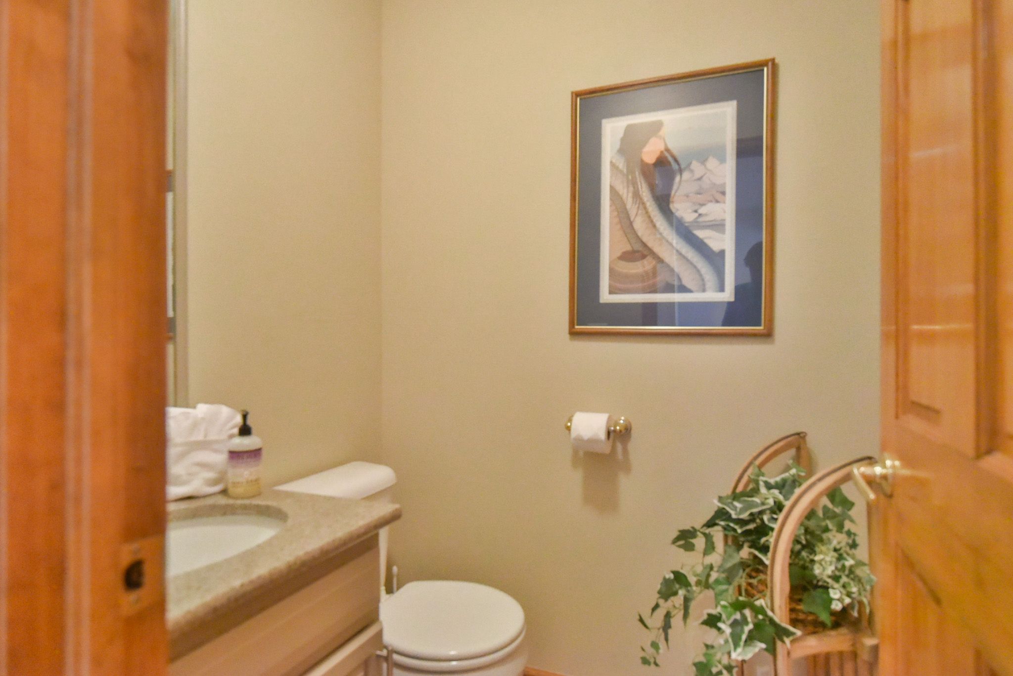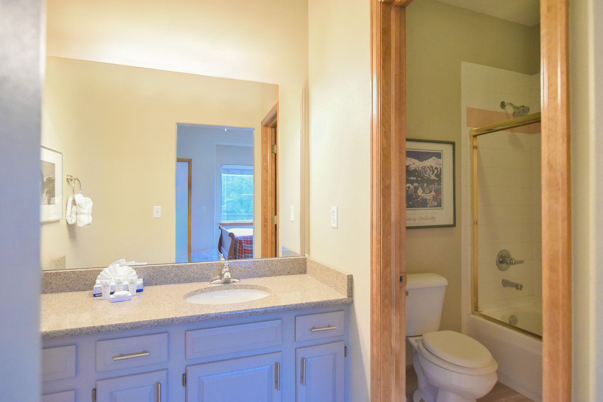 This 2-bedroom, 2.5-bathroom retreat comfortably sleeps up to six guests and features two private queen suites, each with its own ensuite bathroom. The upper-level suite offers sweeping mountain views and a private balcony—an ideal place to start your morning with a cup of coffee and a view. On the lower level, the second suite includes a walk-out patio that leads directly to the private hot tub, creating the perfect après-ski experience right at home.