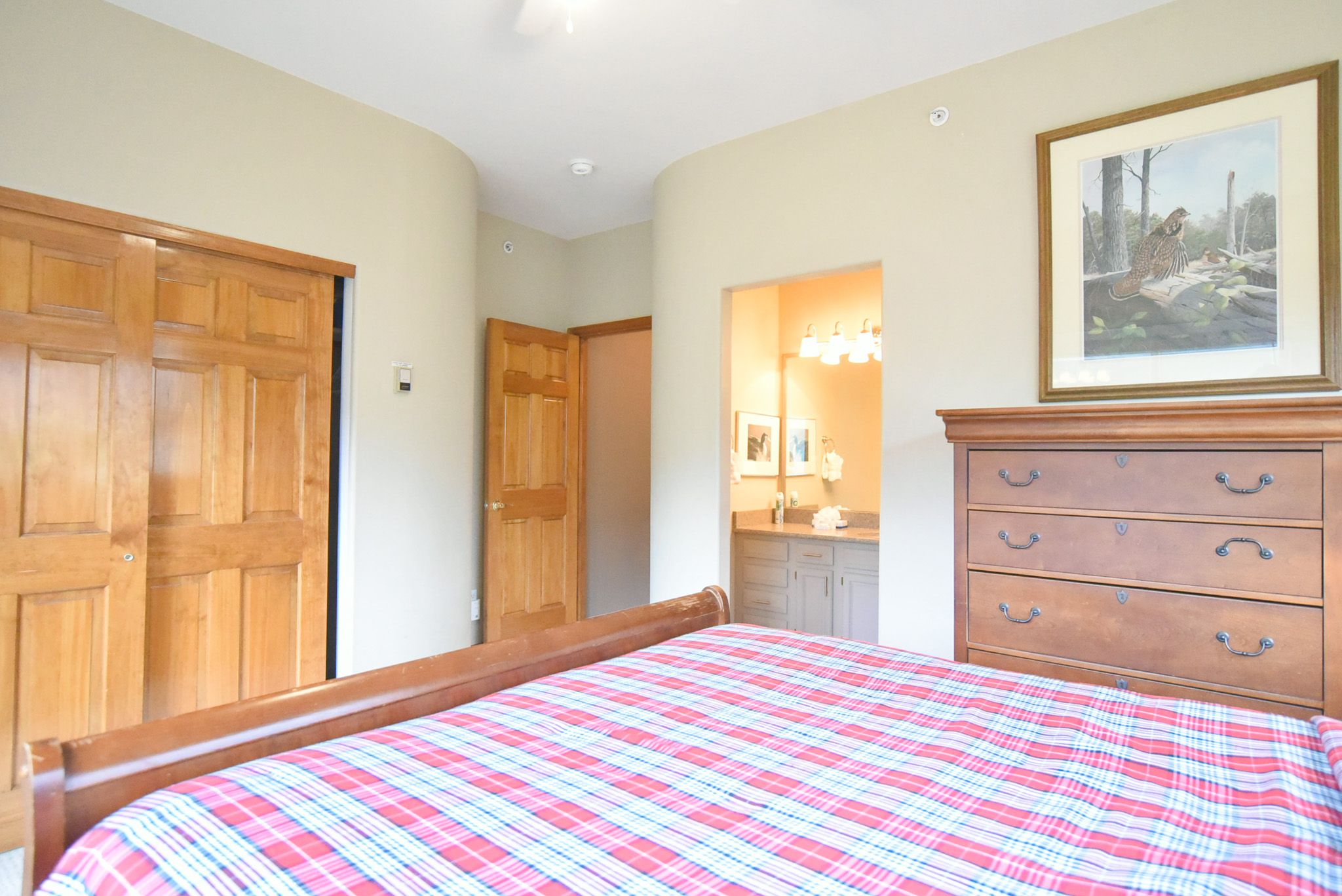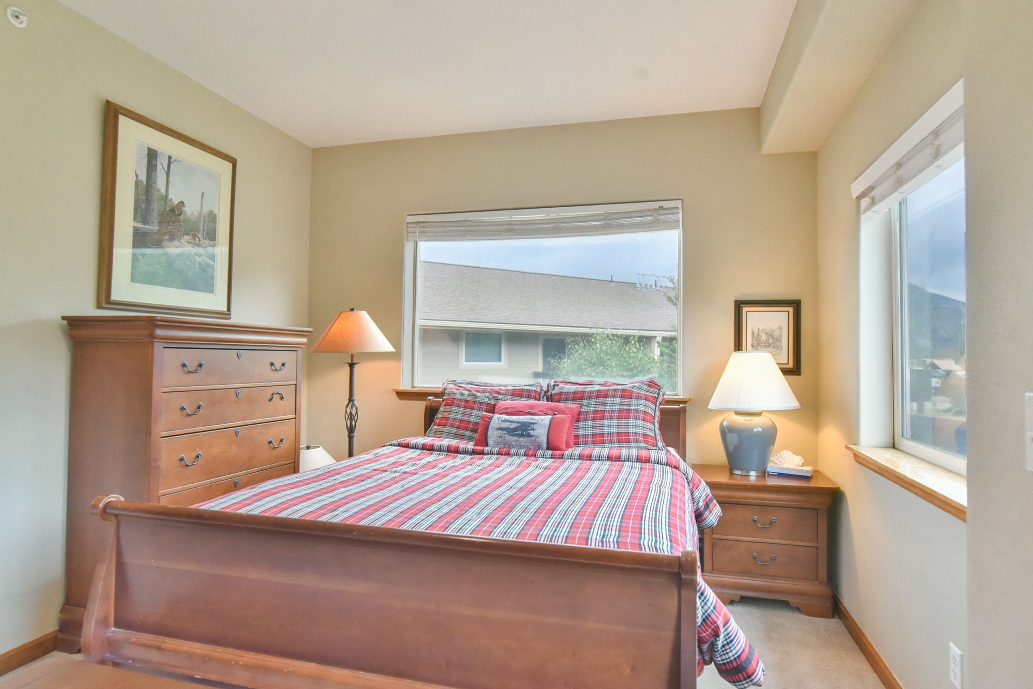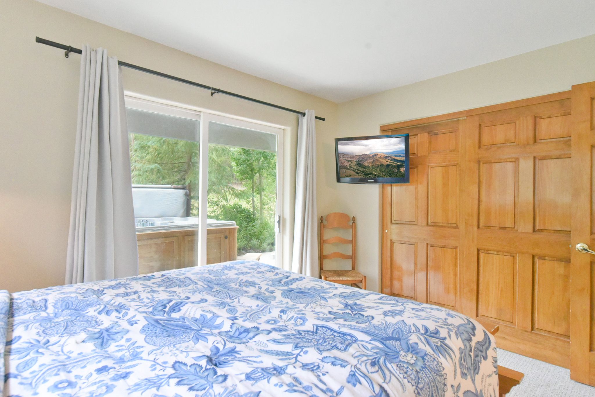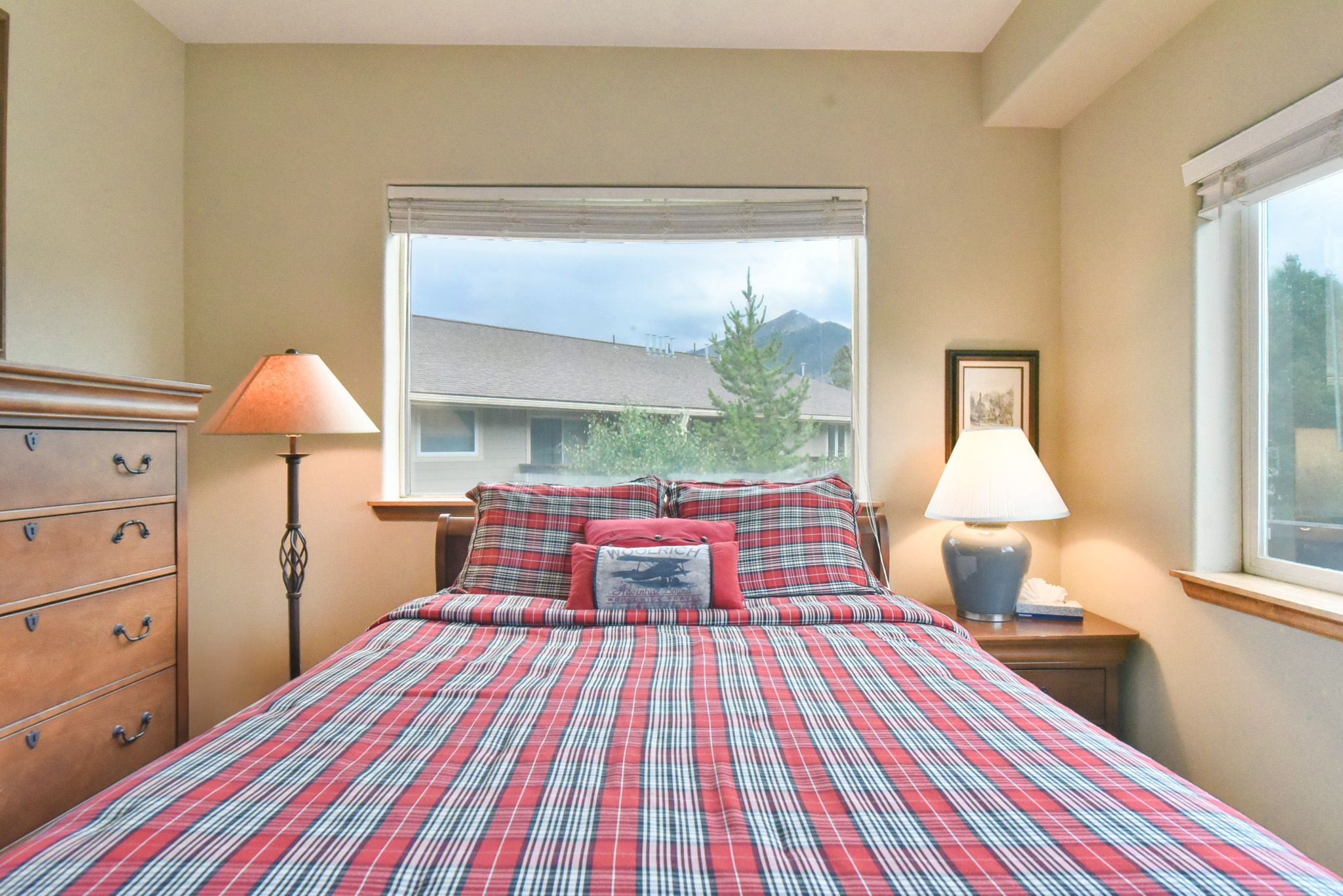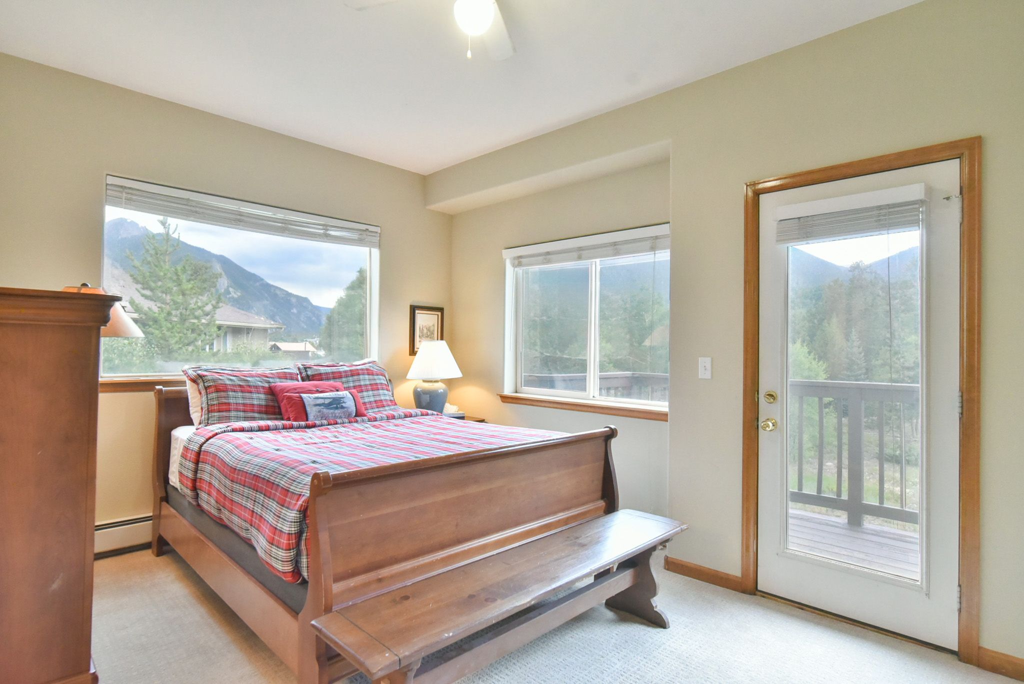 •  Queen Master Suite: queen bed, private bathroom with tub/shower, private door to deck with mountain views. (sleeps 2)