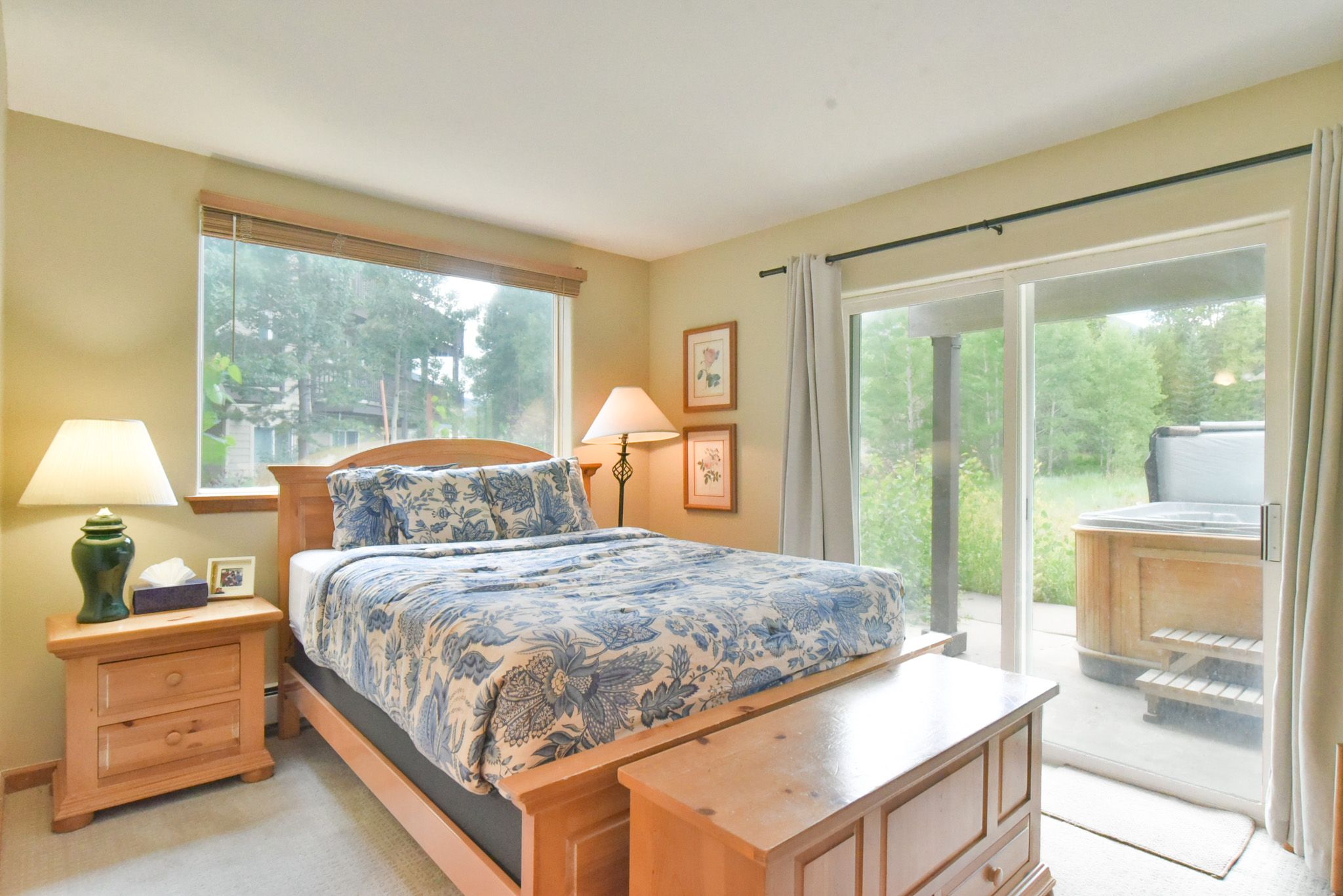 •  Queen Master Suite 2: queen bed, one full bed, private bathroom with tub/shower, flat-screen TV, lower patio access featuring hot tub. (sleeps 2)
