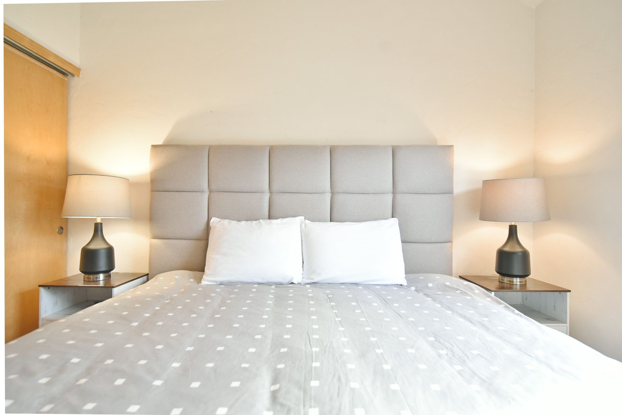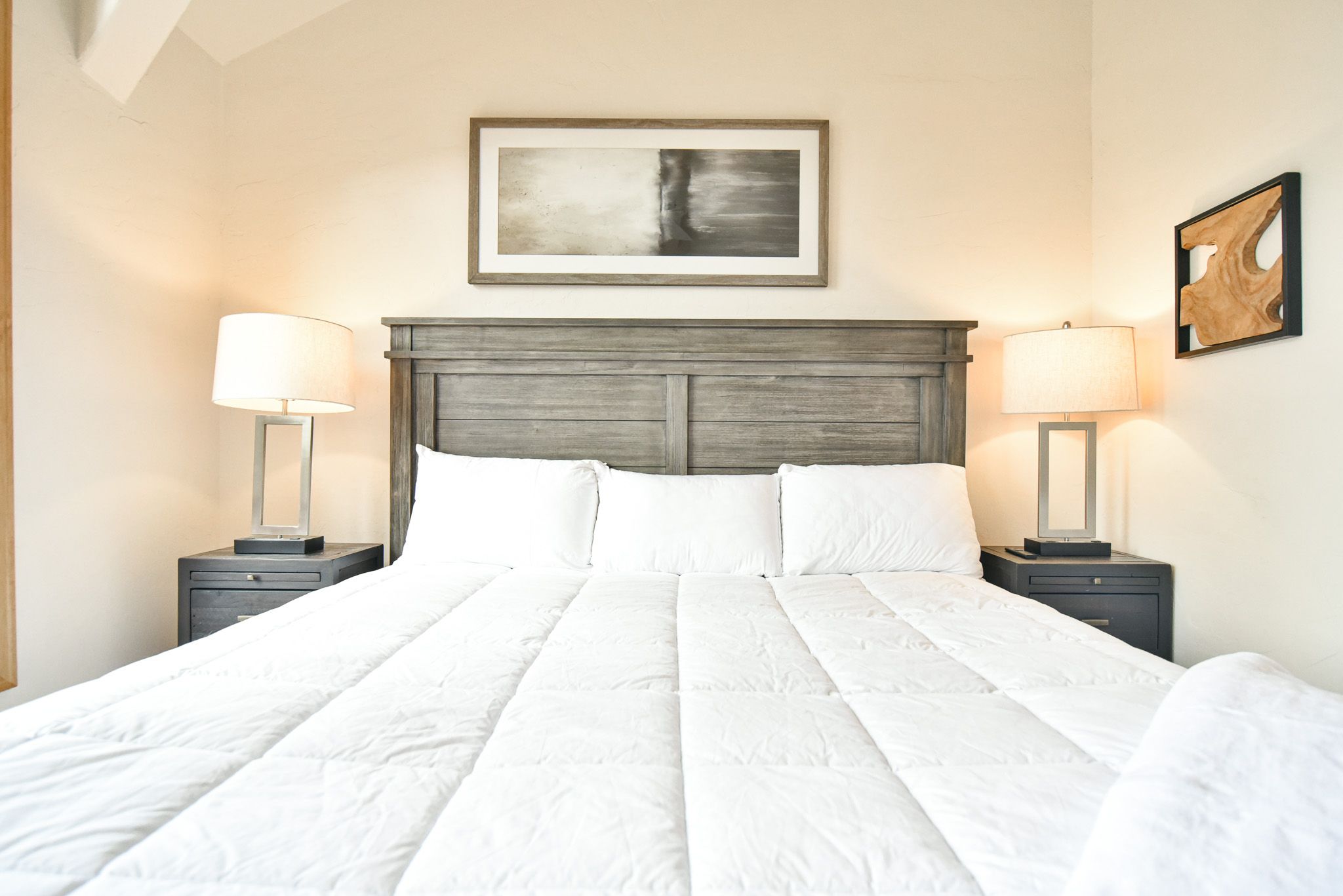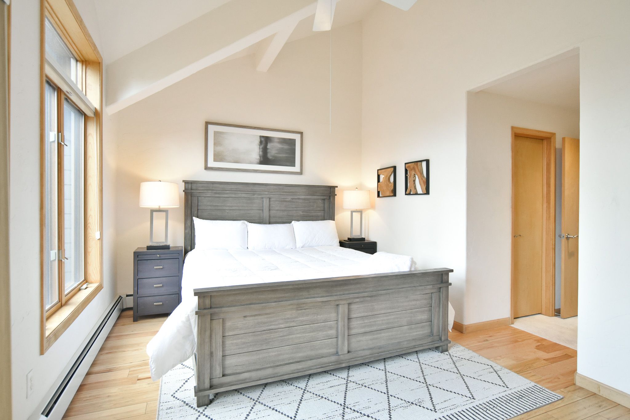- King Master Suite: king bed, vaulted ceilings and large windows, smart tv, private attached bathroom with walk-in tile shower. (sleeps 2)