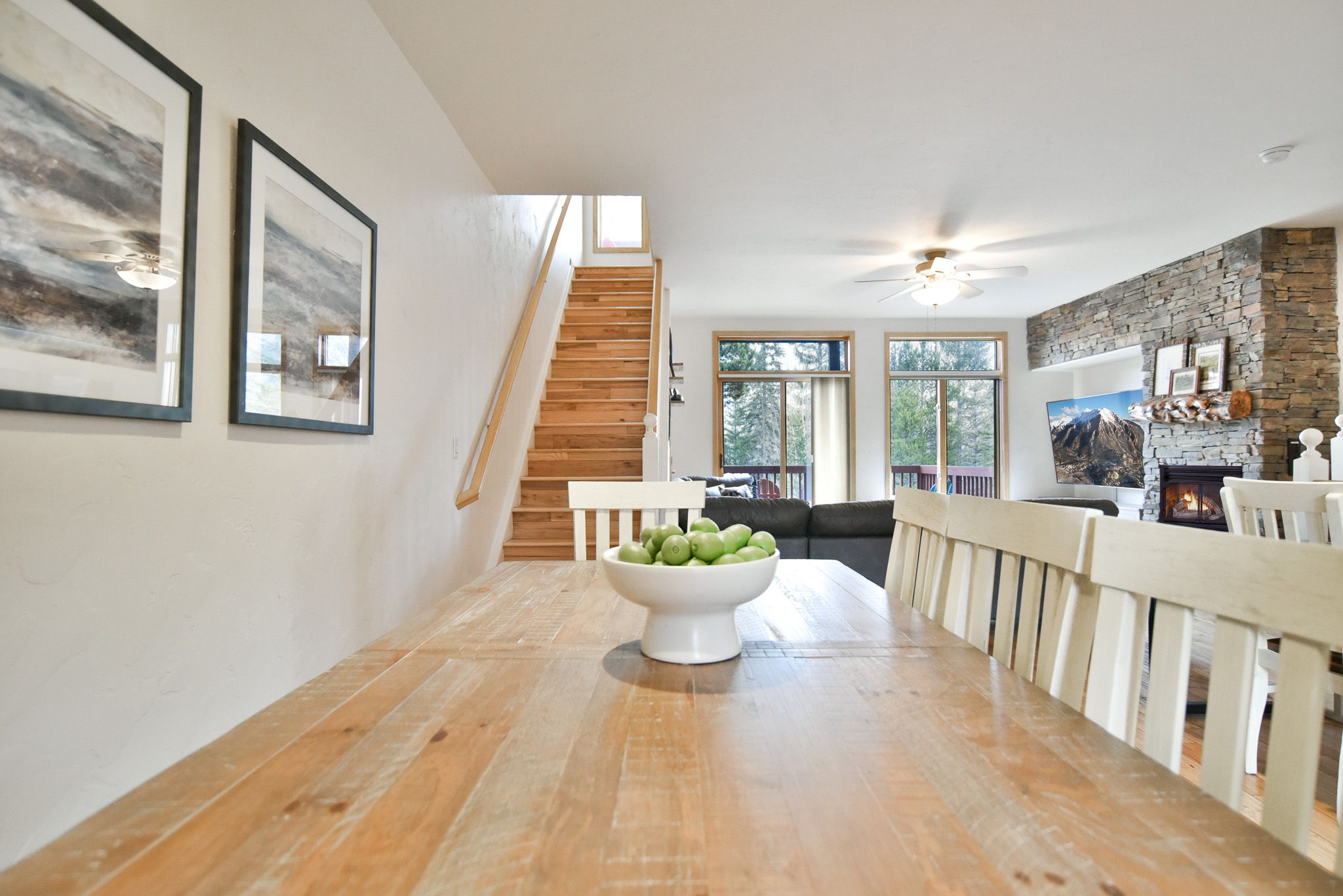 Step inside to discover a spacious, light-filled interior thoughtfully designed to bring the outdoors in. The main living area boasts rich hardwood floors, cozy seating, and a gas fireplace with a striking stone wall, creating a warm and welcoming ambiance. The fully equipped kitchen features granite countertops, stainless steel appliances, and plenty of counter space, making it easy to prepare meals for your group. Gather around the dining table, which comfortably seats eight, or take advantage of the small workstation if you need a quiet moment to catch up on any work. Large windows throughout the home let natural light flood in, highlighting the beautiful mountain views and creating a serene atmosphere.