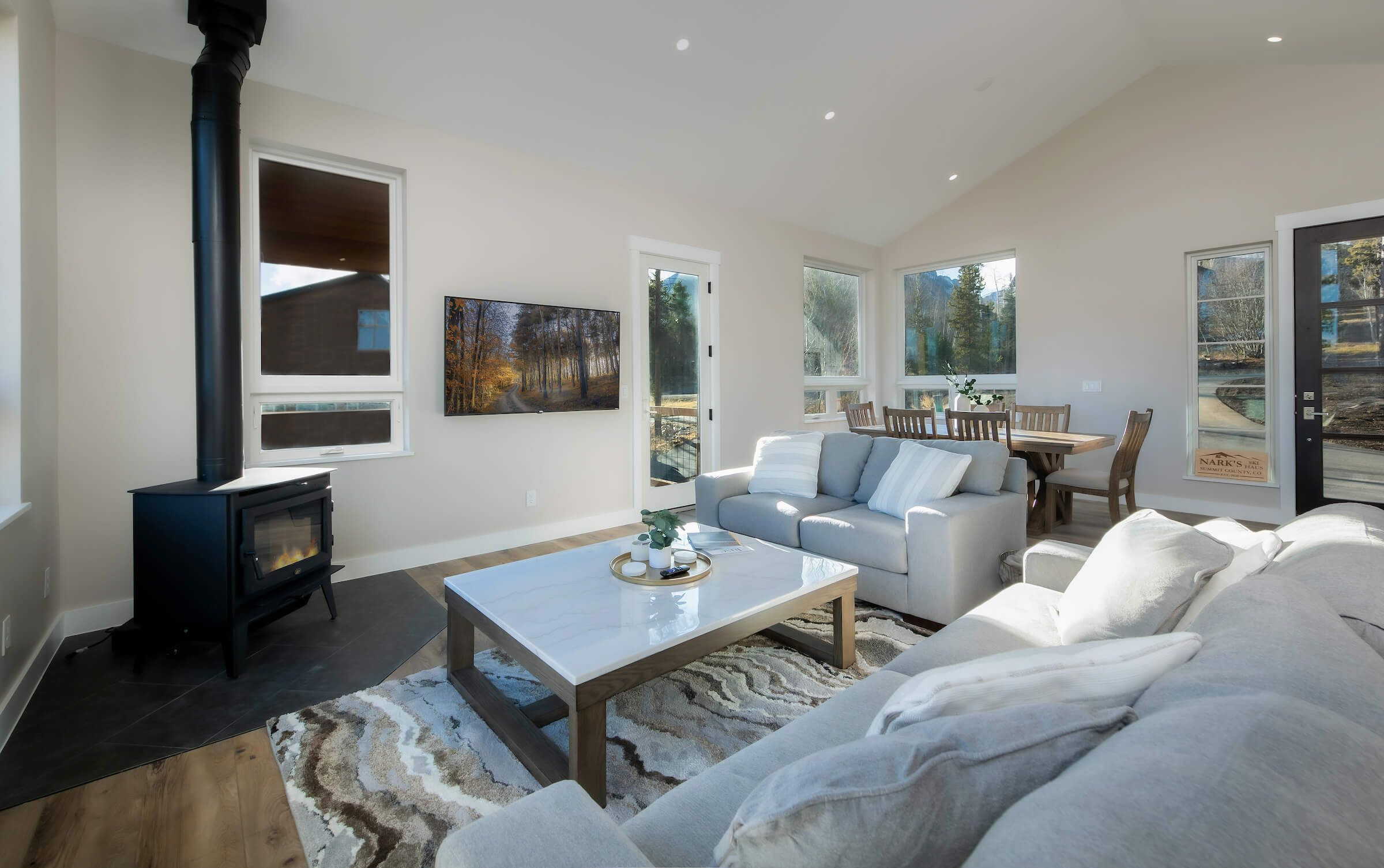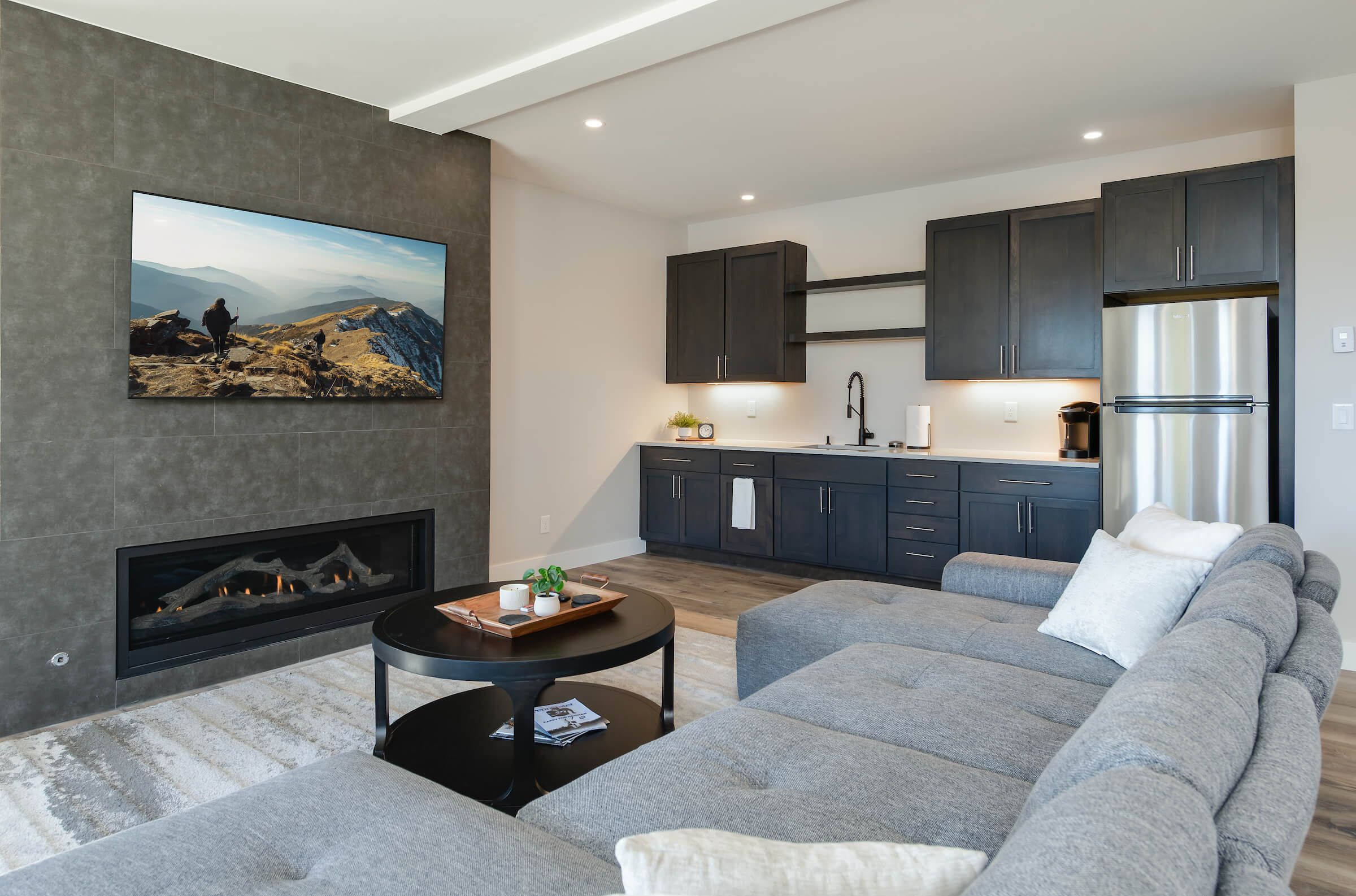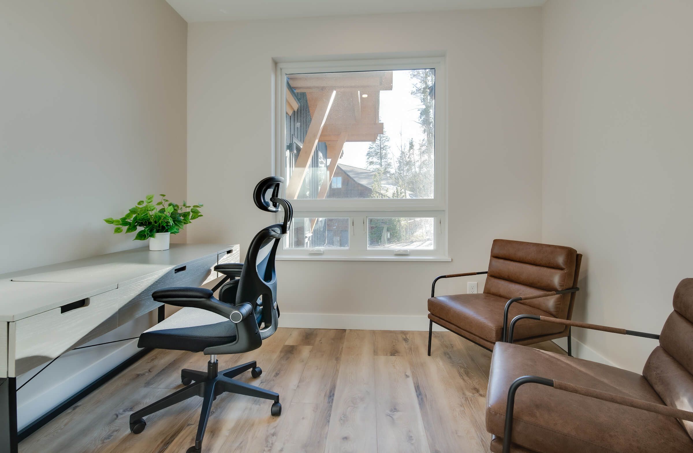 The main living area creates an atmosphere of luxury featuring vaulted ceilings and panoramic windows helping to create a welcoming and warm environment for all those that visit. The kitchen area features granite counter tops, stainless steel appliances and a dining table with seating for 6 along with a breakfast bar with seating for 3. Just off the living room there is a wrap-around deck perfect for taking in the views and enjoying that fresh mountain air along with a dedicated office for those wanting to get some work done. The downstairs features a dedicated entertainment area with large flat-screen Smart TV, wet bar, and walkout patio.