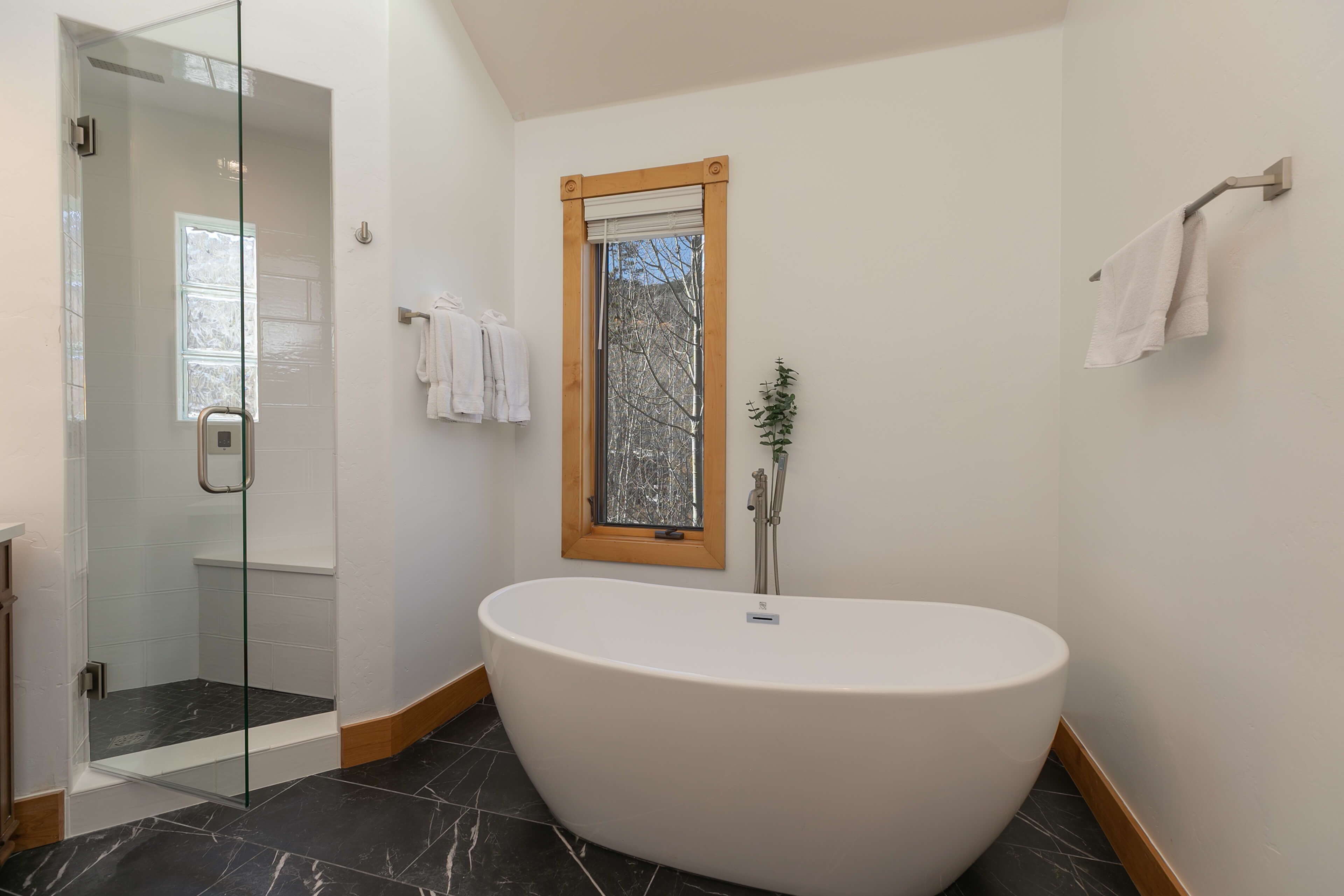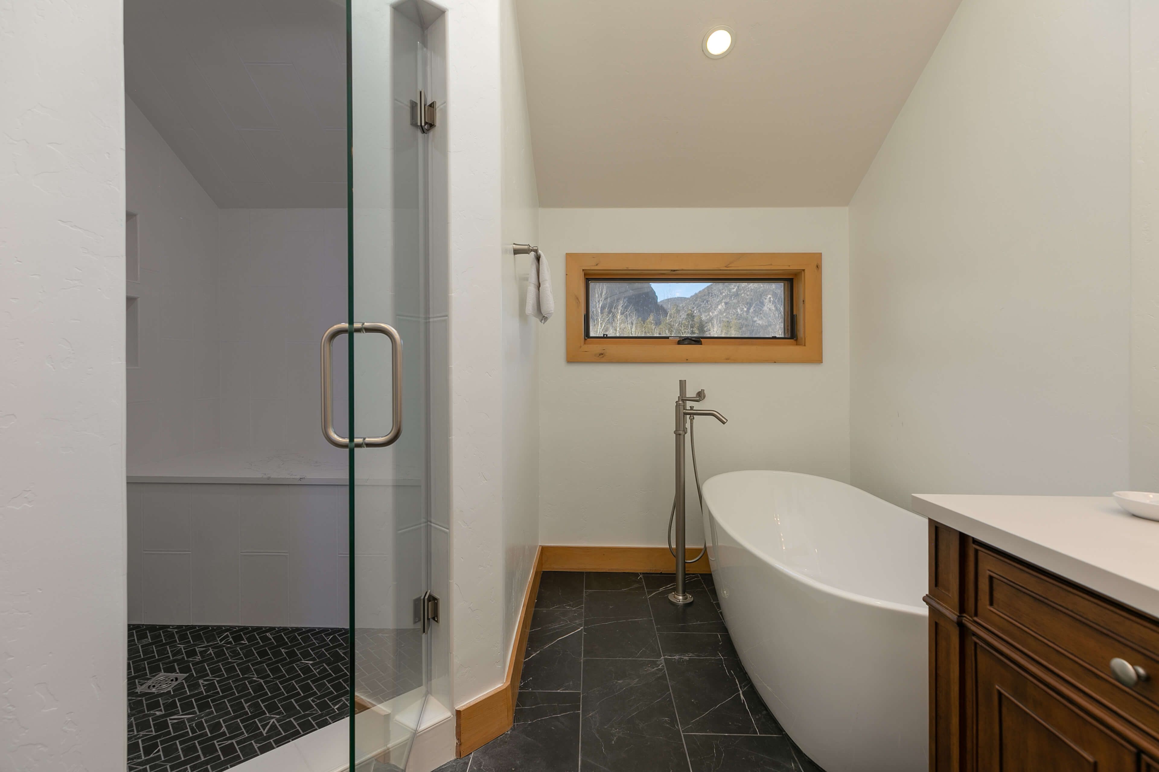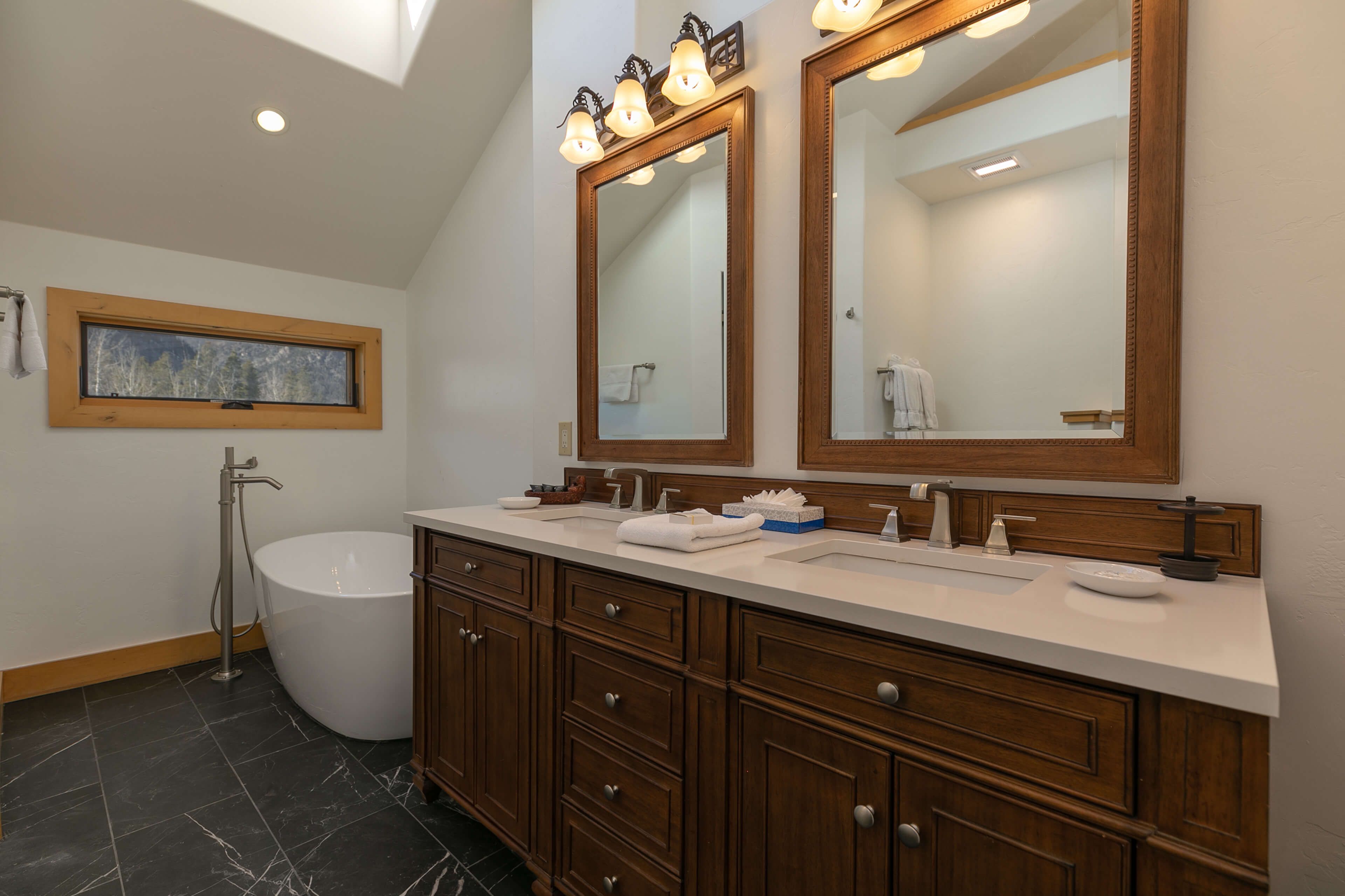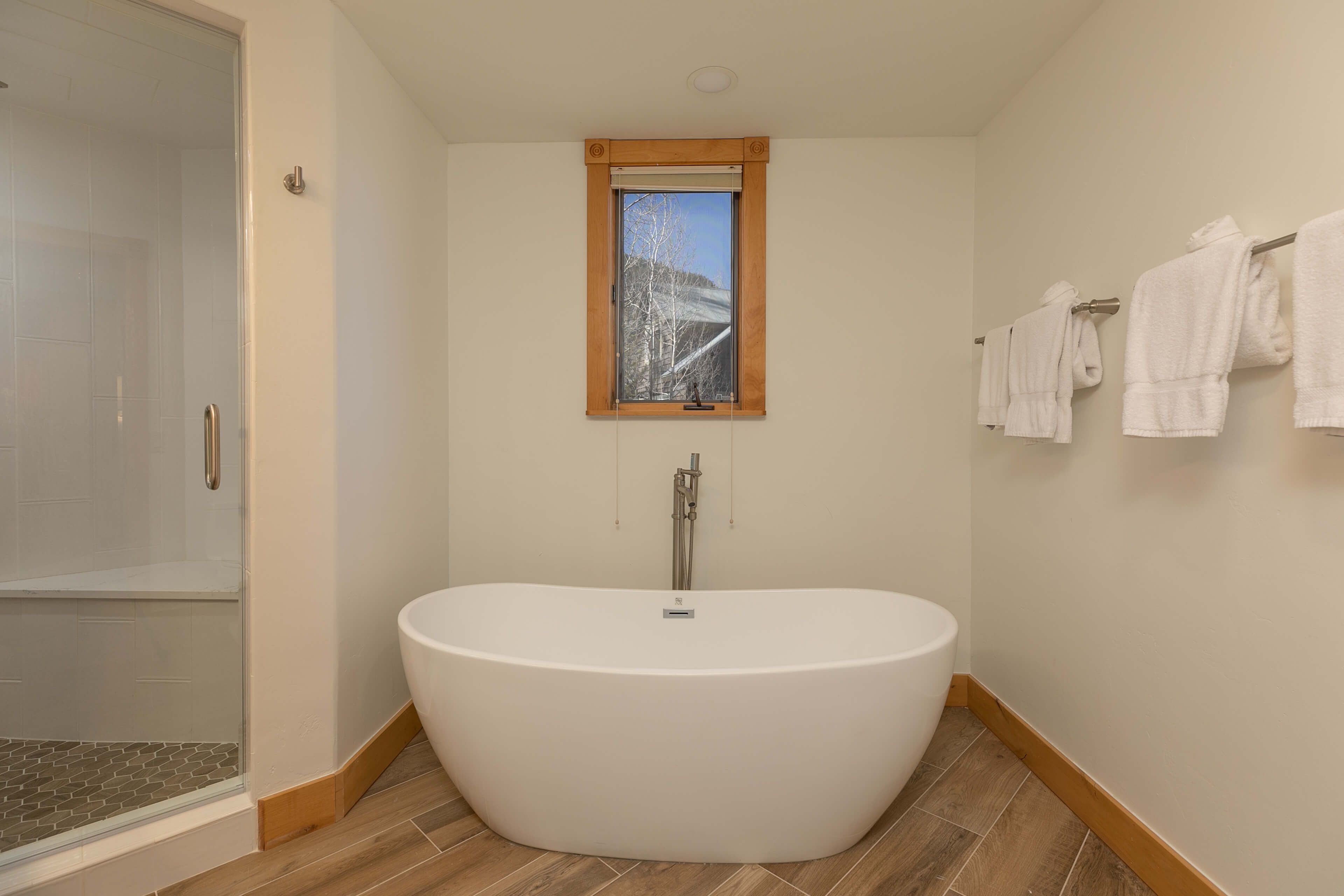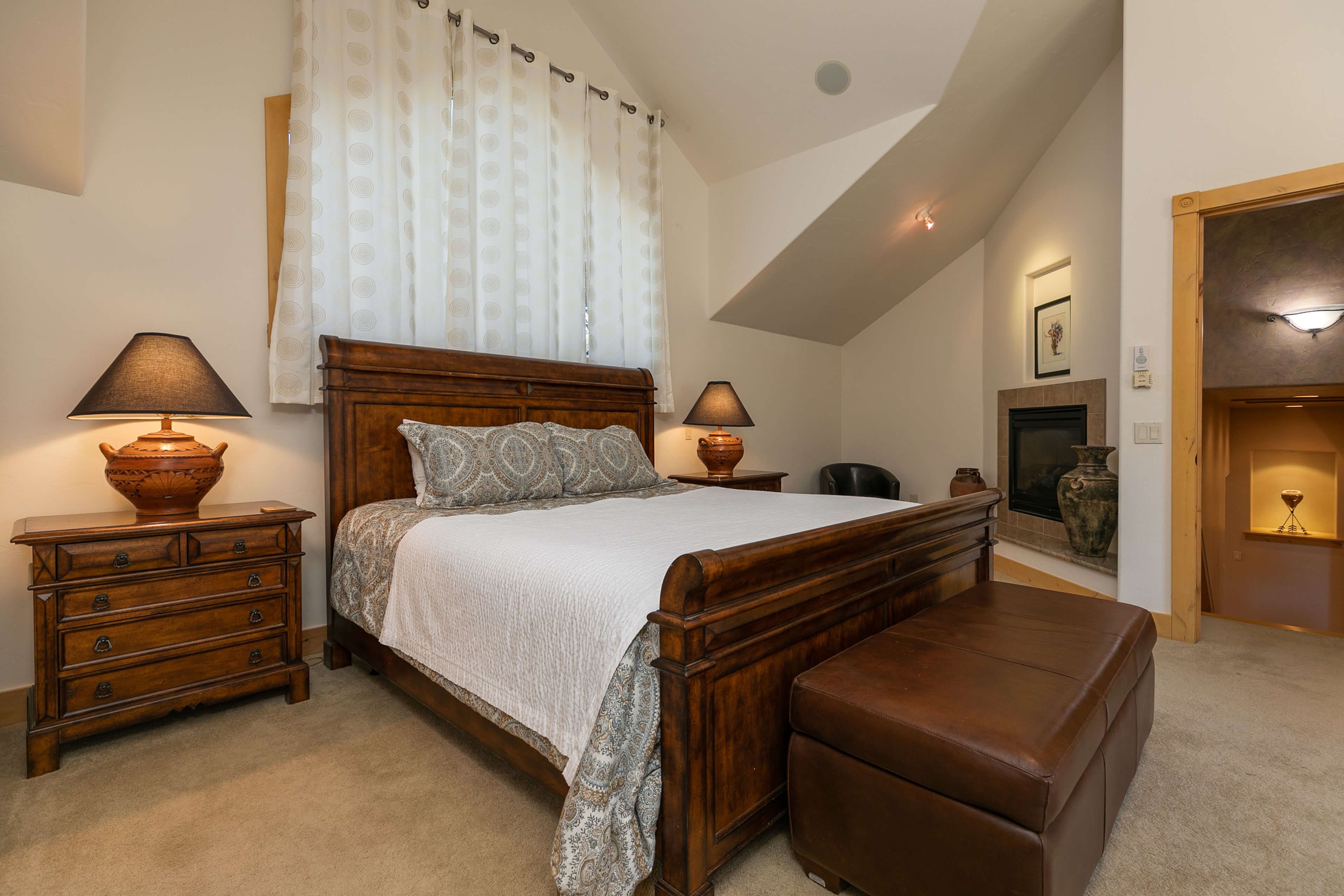 - King master suite: large room with beautiful views, walk-in closet, gas fireplace, and flat screen TV with private attached bathroom with walk-in tile shower, large soaking tub, and two sinks. (sleeps 2)