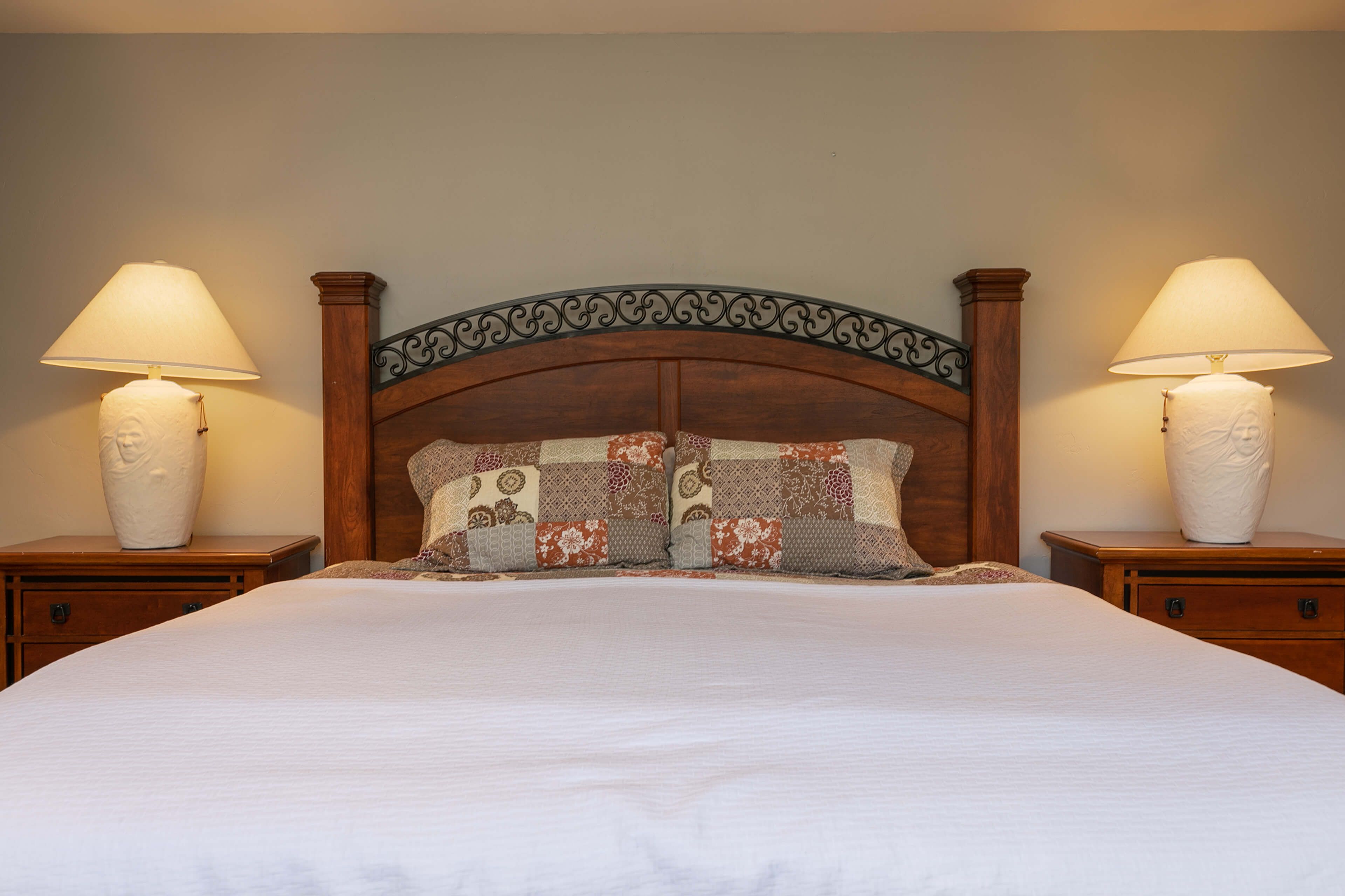 - King suite: king bed with private attached bathroom with large soaking tub and walk-in tile shower. (sleeps 2)