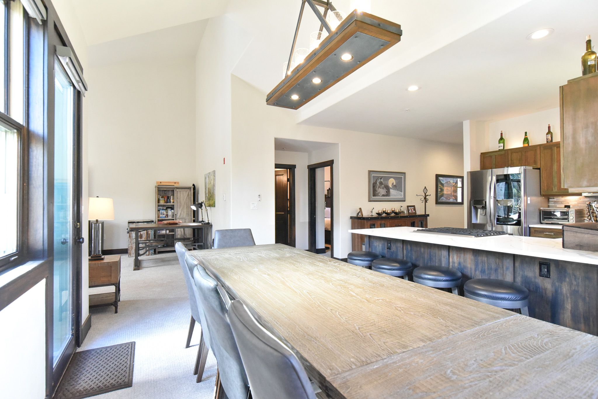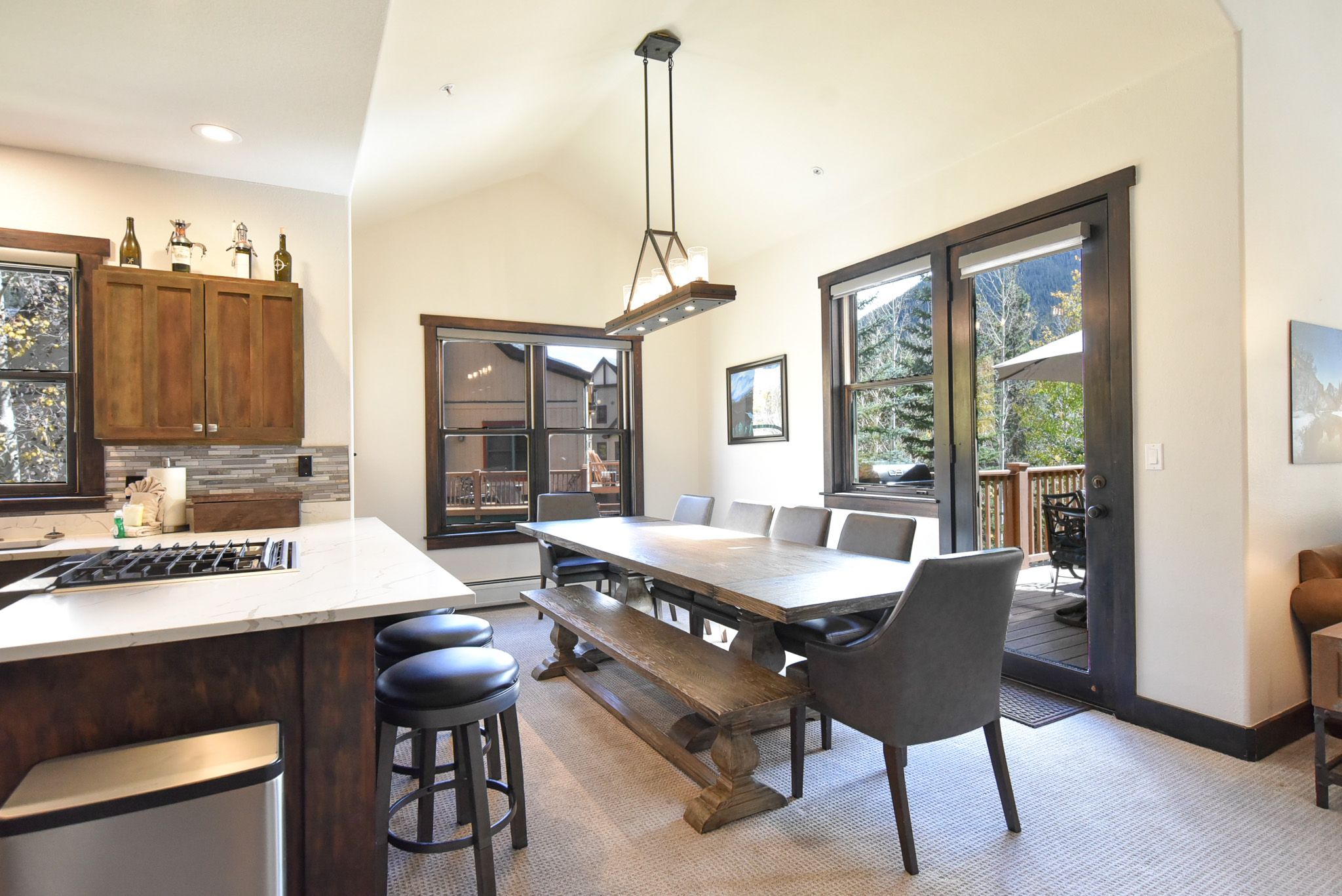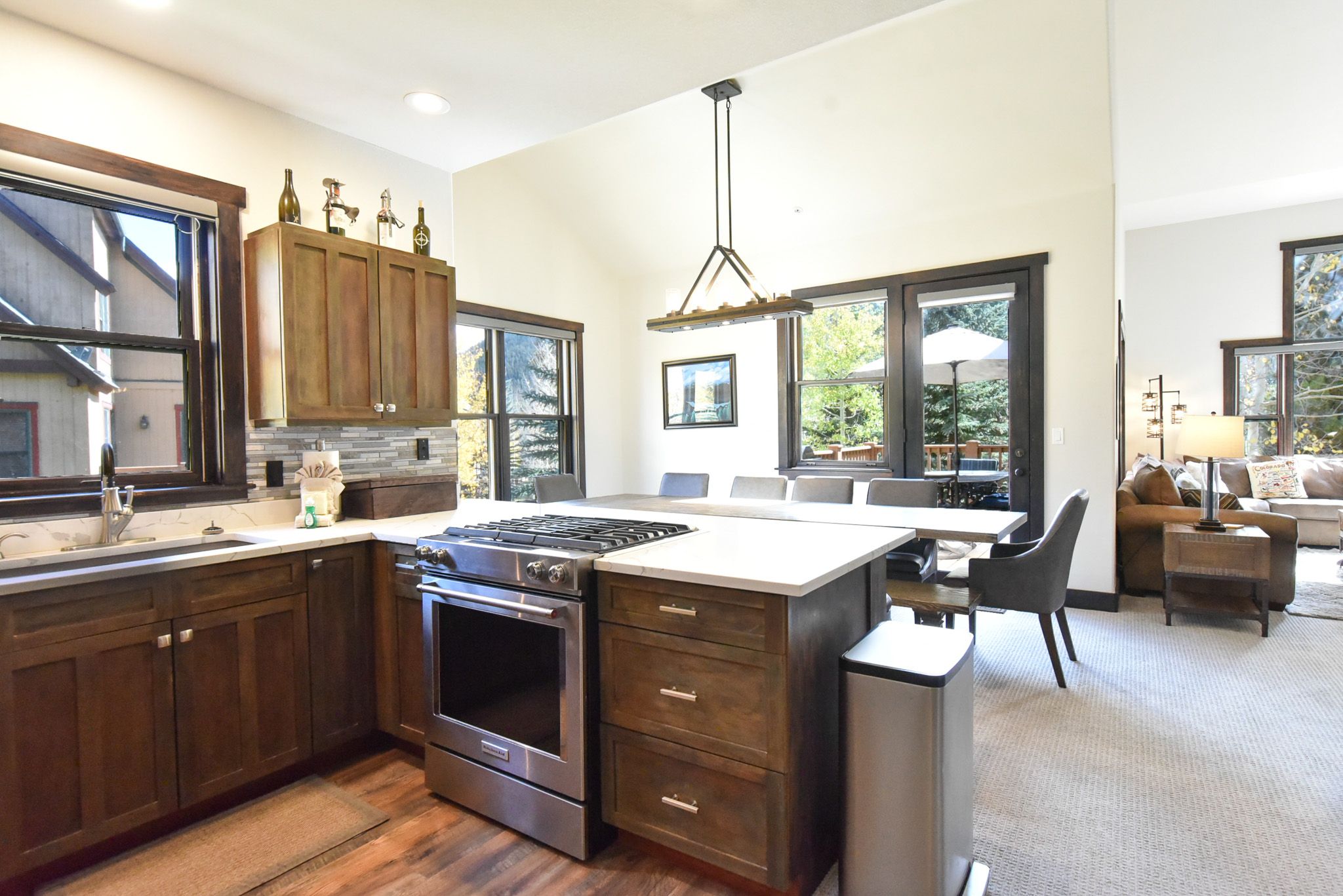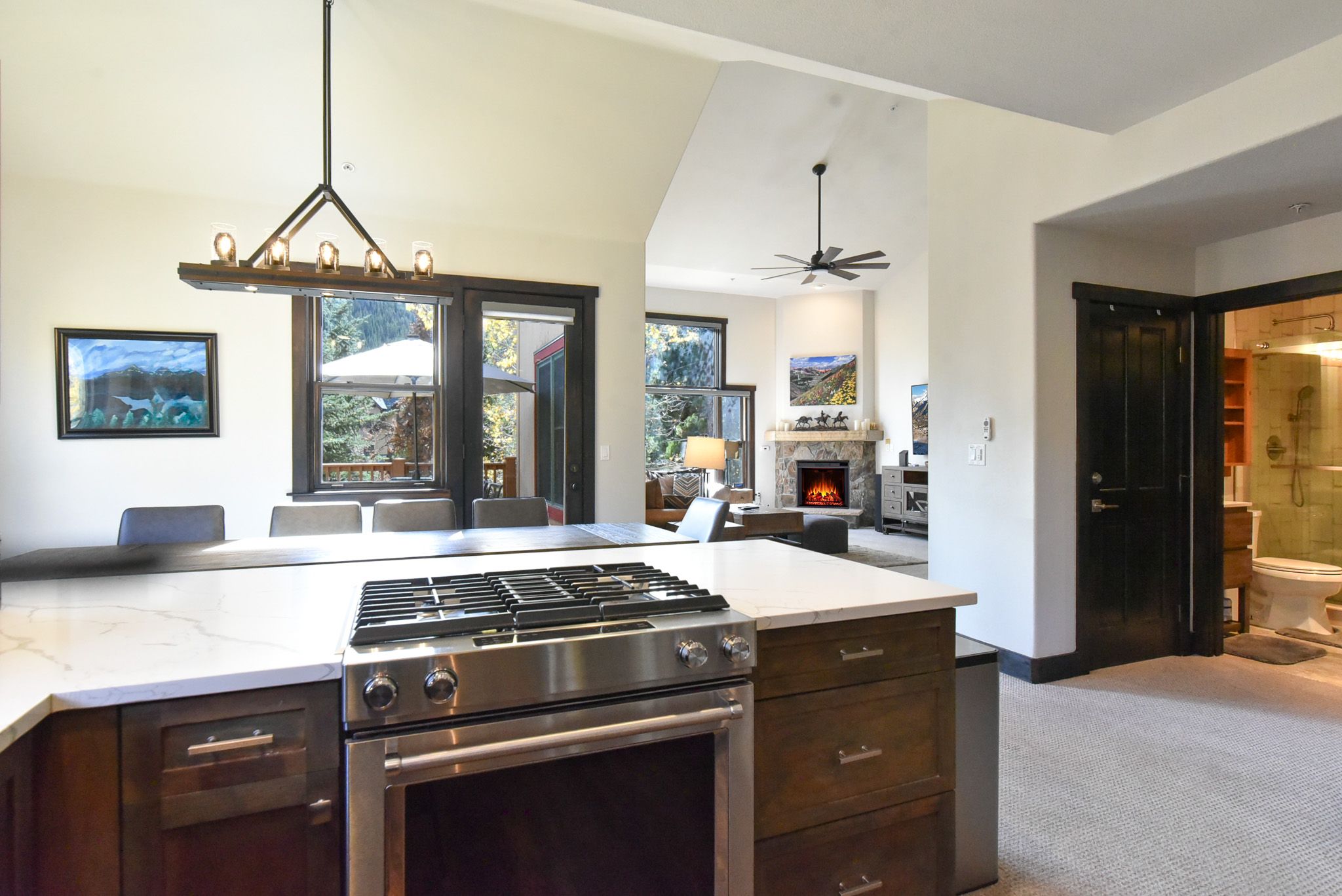 Inside, you’ll find a beautifully designed open-concept living space with vaulted ceilings and plenty of natural light. The main living area features a gas fireplace, large sectional sofa, and smart TV — perfect for relaxing after a day on the slopes. The kitchen is fully equipped with stainless-steel appliances, marble countertops, a gas range, and generous counter space for meal prep. Gather around the breakfast bar or the large dining table, then step outside to the private patio to enjoy a meal on the grill or unwind in the crisp mountain air.
