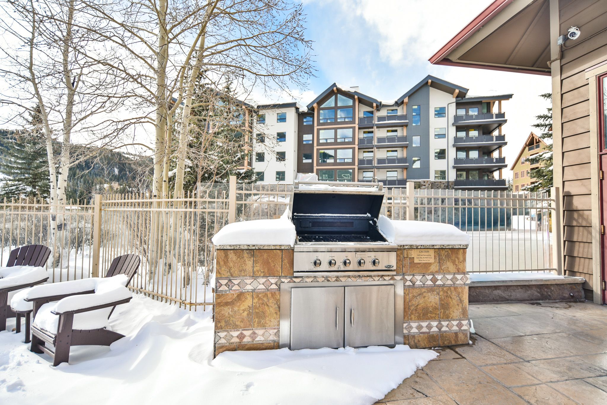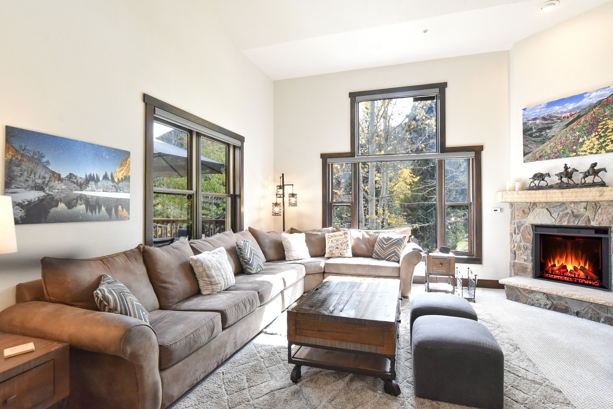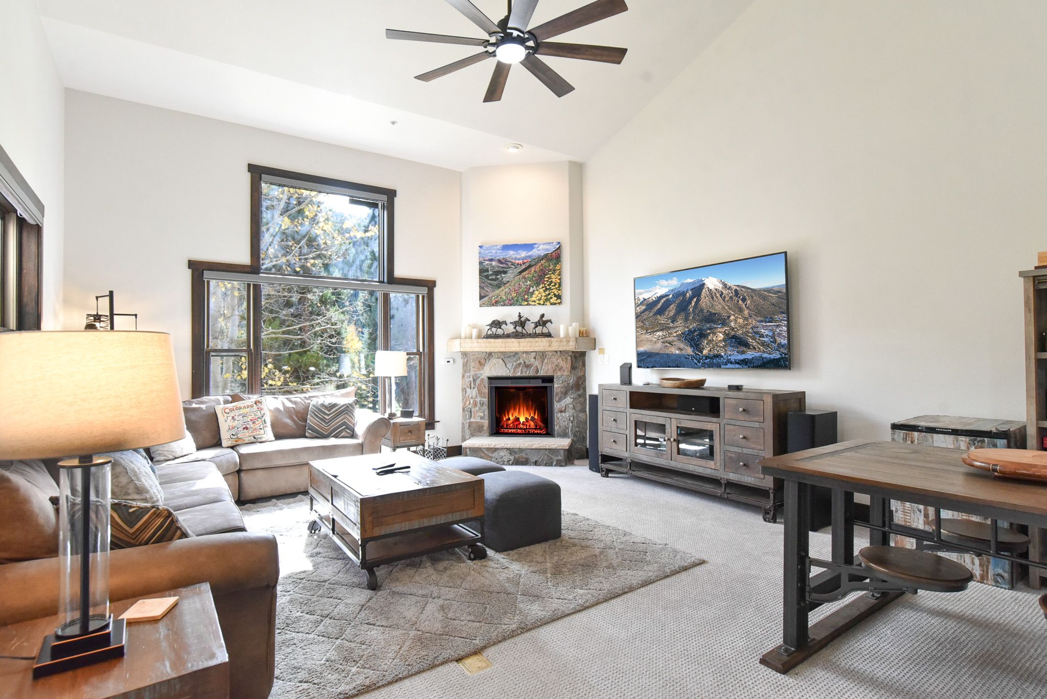 Inside, you’ll find a beautifully designed open-concept living space with vaulted ceilings and plenty of natural light. The main living area features a gas fireplace, large sectional sofa, and smart TV — perfect for relaxing after a day on the slopes. The kitchen is fully equipped with stainless-steel appliances, marble countertops, a gas range, and generous counter space for meal prep. Gather around the breakfast bar or the large dining table, then step outside to the private patio to enjoy a meal on the grill or unwind in the crisp mountain air.