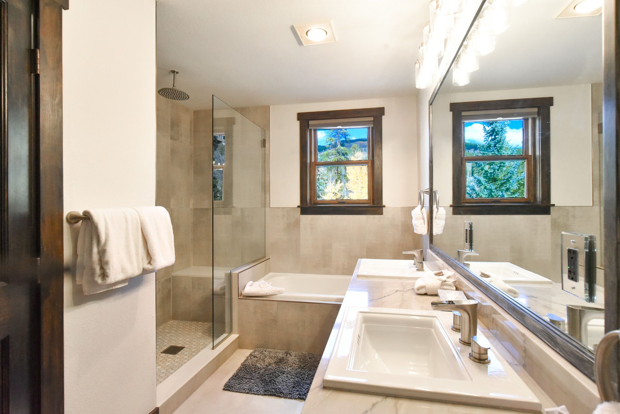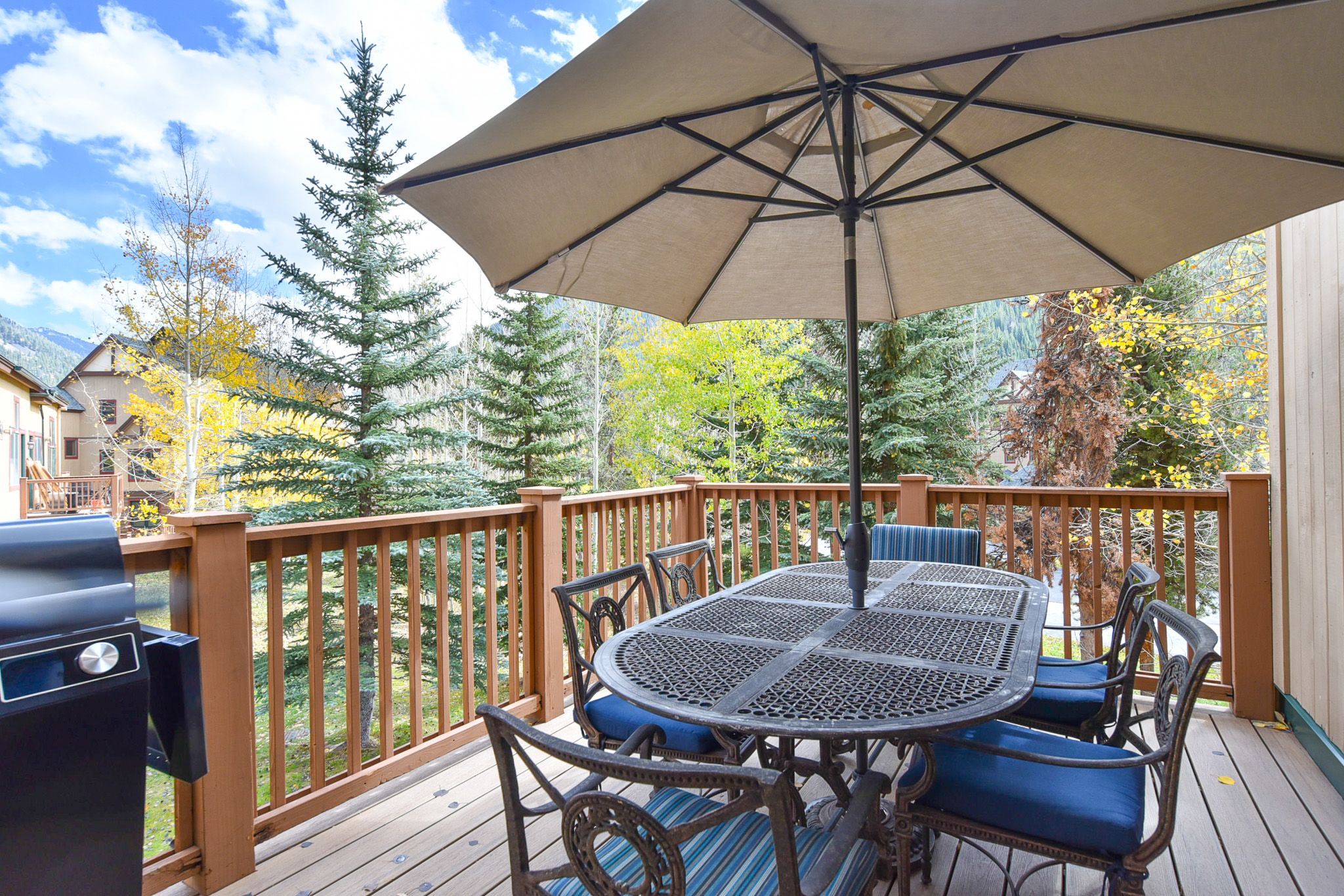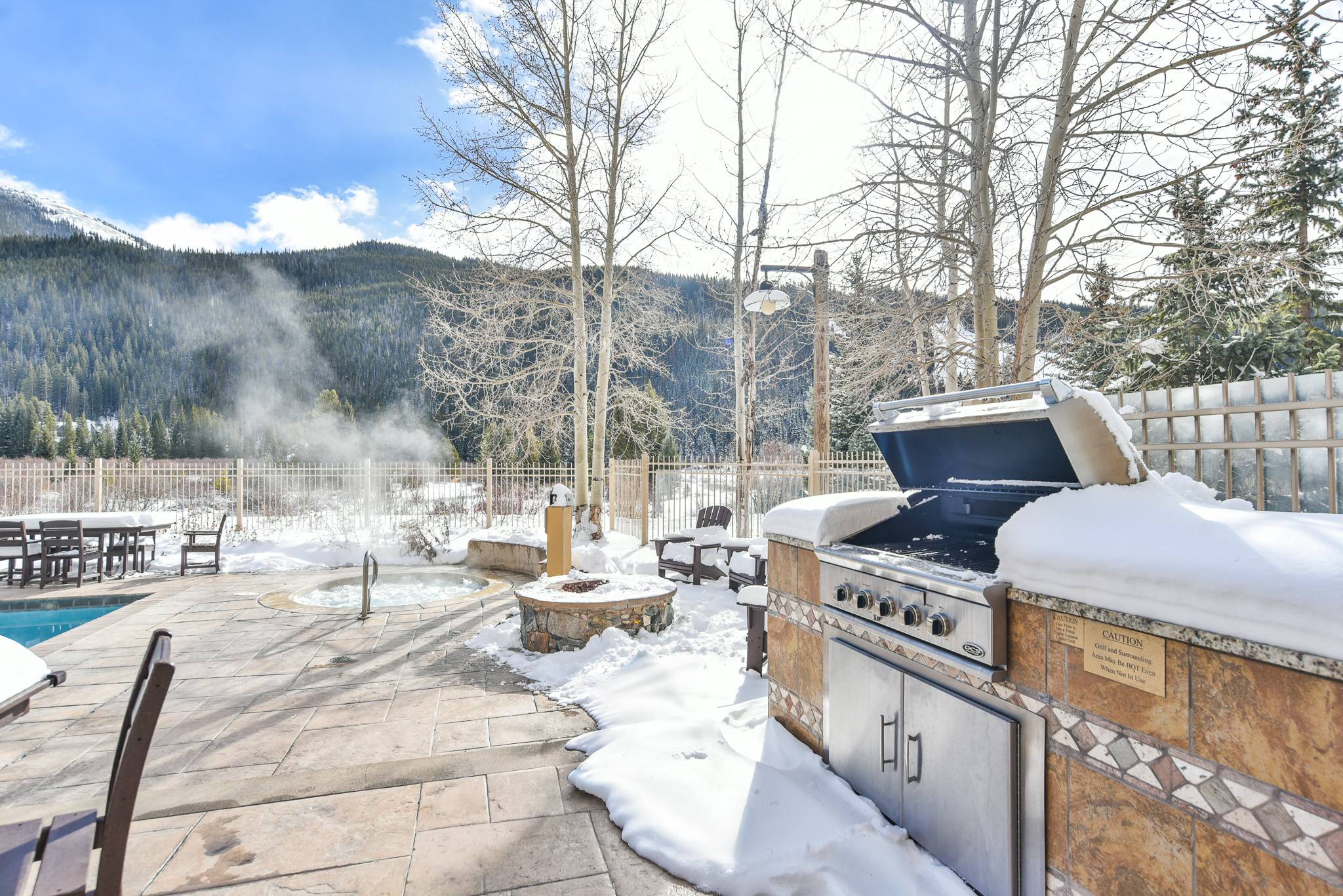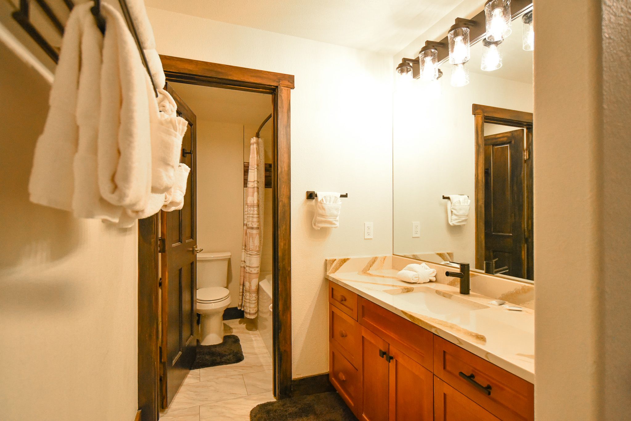 Inside, you’ll find a beautifully designed open-concept living space with vaulted ceilings and plenty of natural light. The main living area features a gas fireplace, large sectional sofa, and smart TV — perfect for relaxing after a day on the slopes. The kitchen is fully equipped with stainless-steel appliances, marble countertops, a gas range, and generous counter space for meal prep. Gather around the breakfast bar or the large dining table, then step outside to the private patio to enjoy a meal on the grill or unwind in the crisp mountain air.