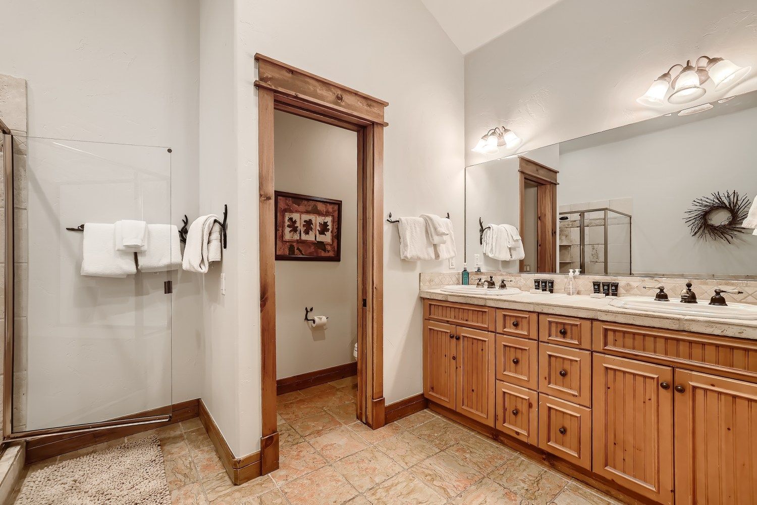 - Master suite 2: king bed, private attached bathroom with a jetted soaking tub, walk-in tile shower and 2 sinks, gas fireplace, flat-screen TV. (sleeps 2)