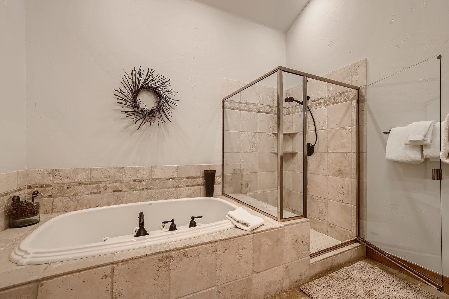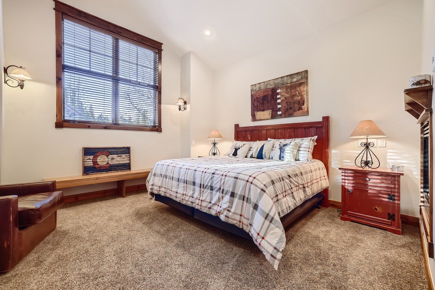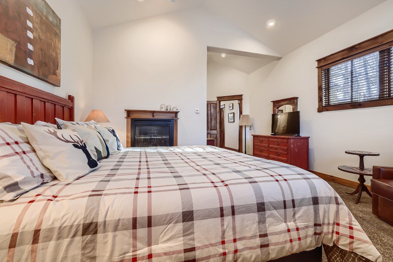 - Master suite 1: king bed, private attached bathroom with a jetted soaking tub, walk-in tile shower and 2 sinks, gas fireplace, flat-screen TV. (sleeps 2)