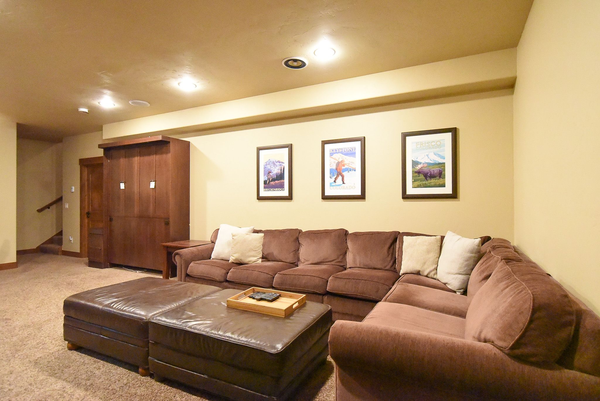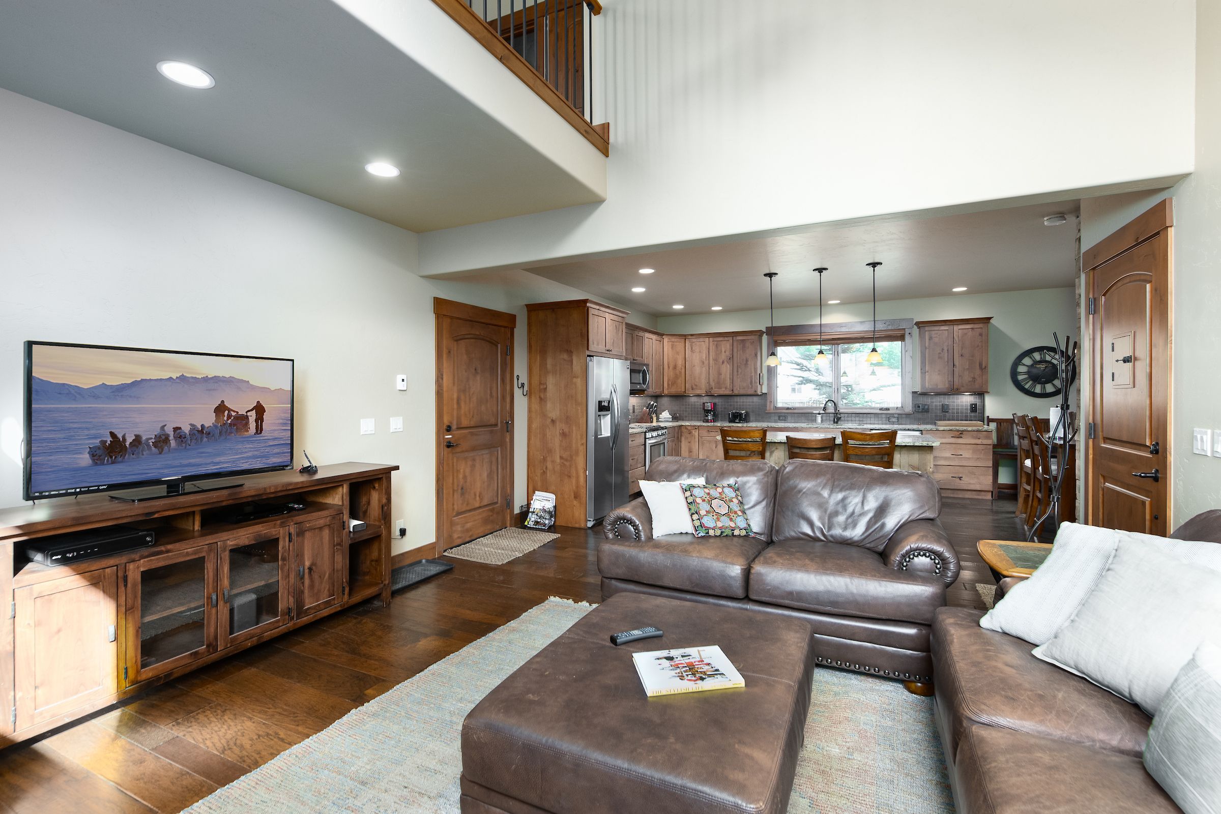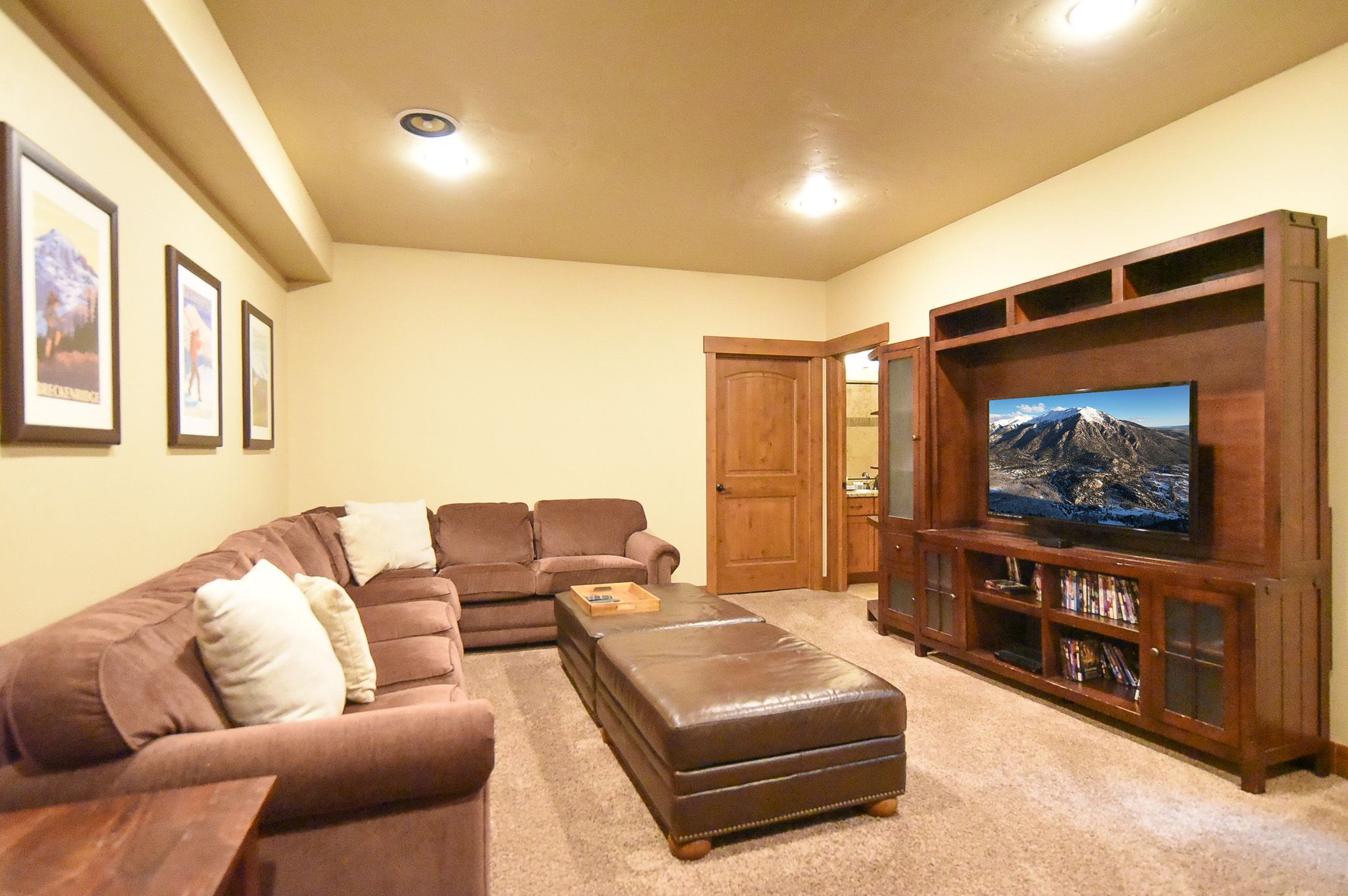 The main living area features a floor to ceiling rock gas fireplace and vaulted ceilings. The comfortable sofas provide an excellent place to unwind and enjoy a movie or the game on the large flat-screen TV. The lower additional living space that’s a perfect place for the kids to enjoy their favorite show or play a board game (a nice selection of games can be found in the closet).