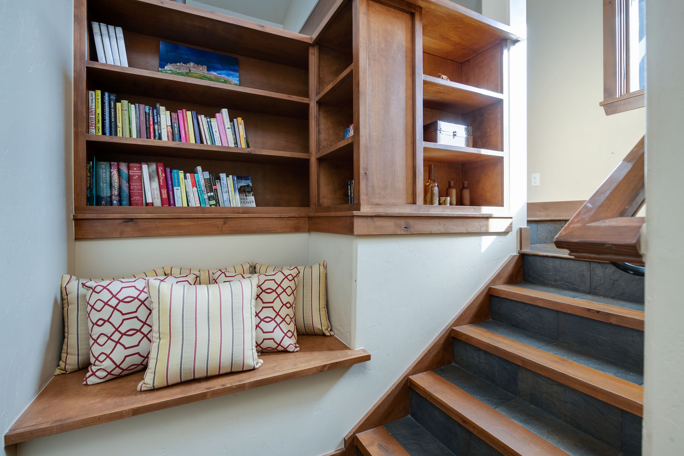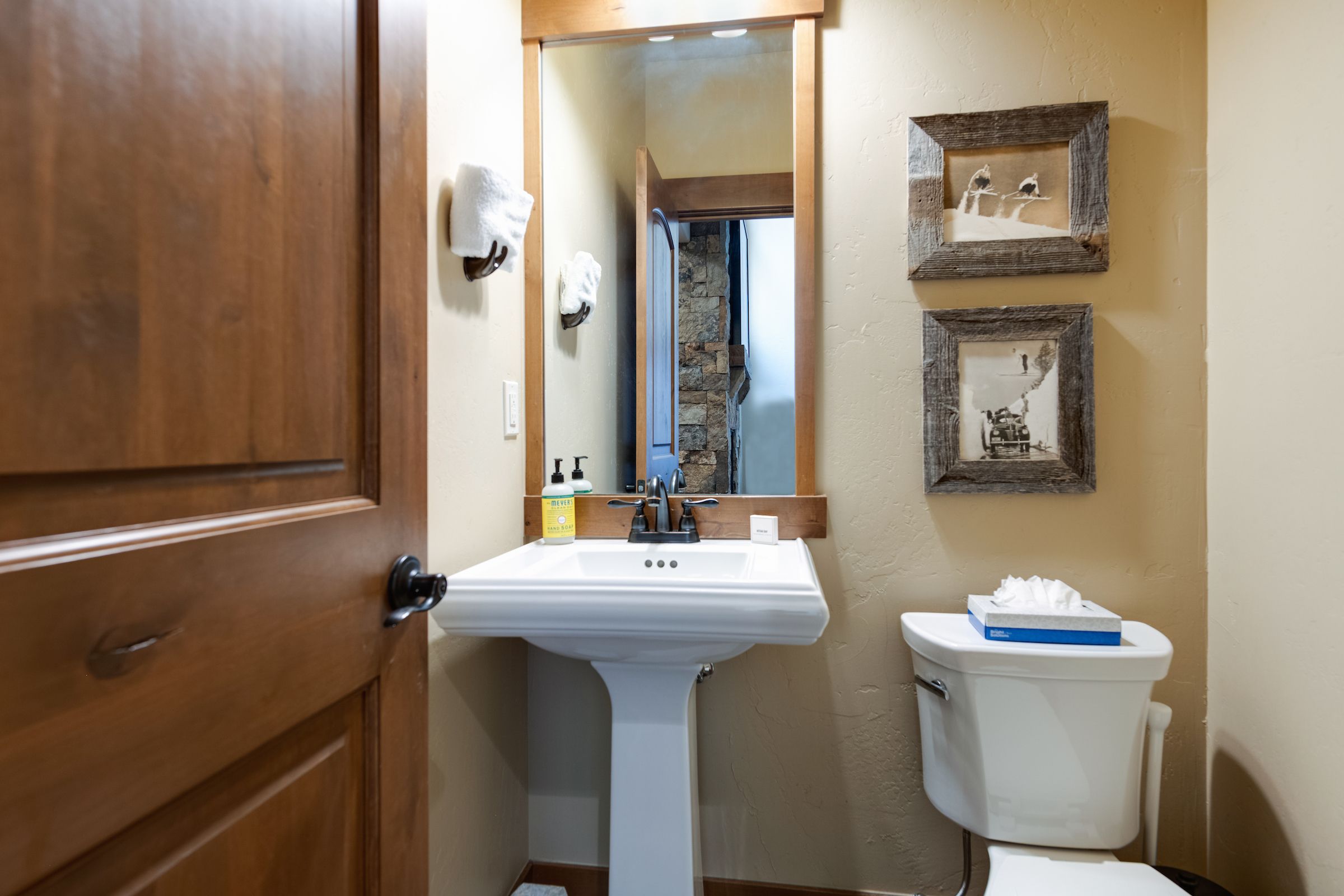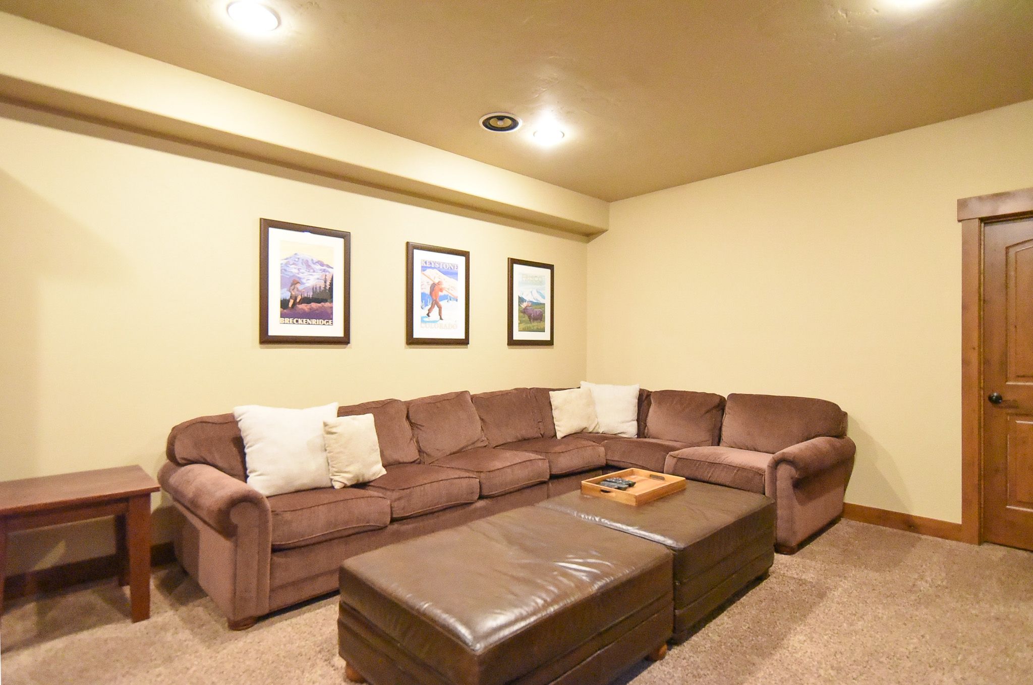 The main living area features a floor to ceiling rock gas fireplace and vaulted ceilings. The comfortable sofas provide an excellent place to unwind and enjoy a movie or the game on the large flat-screen TV. The lower additional living space that’s a perfect place for the kids to enjoy their favorite show or play a board game (a nice selection of games can be found in the closet).
