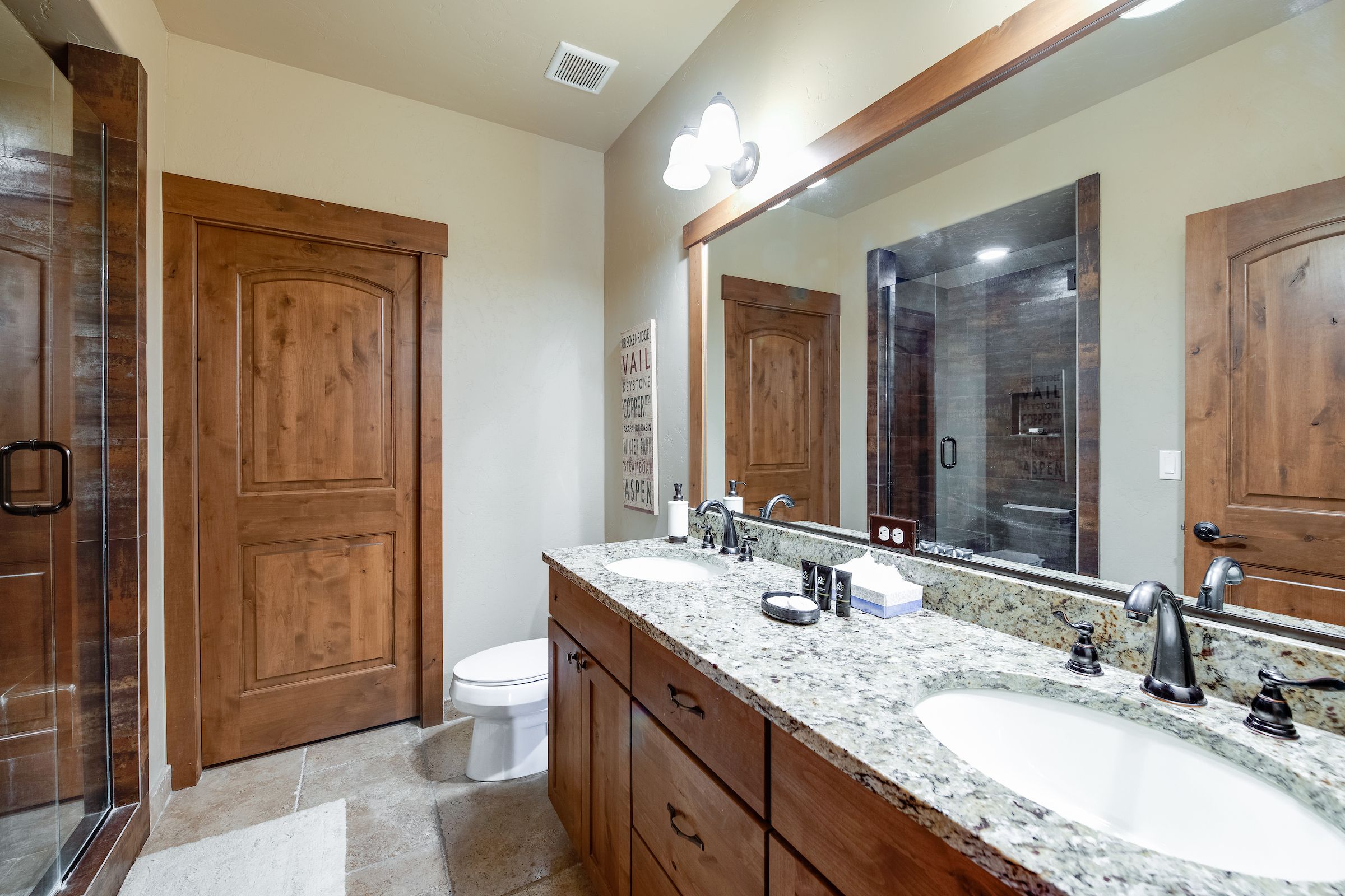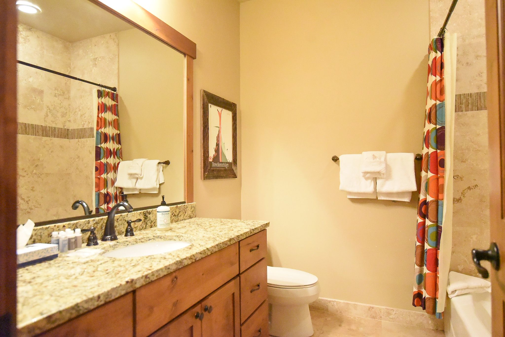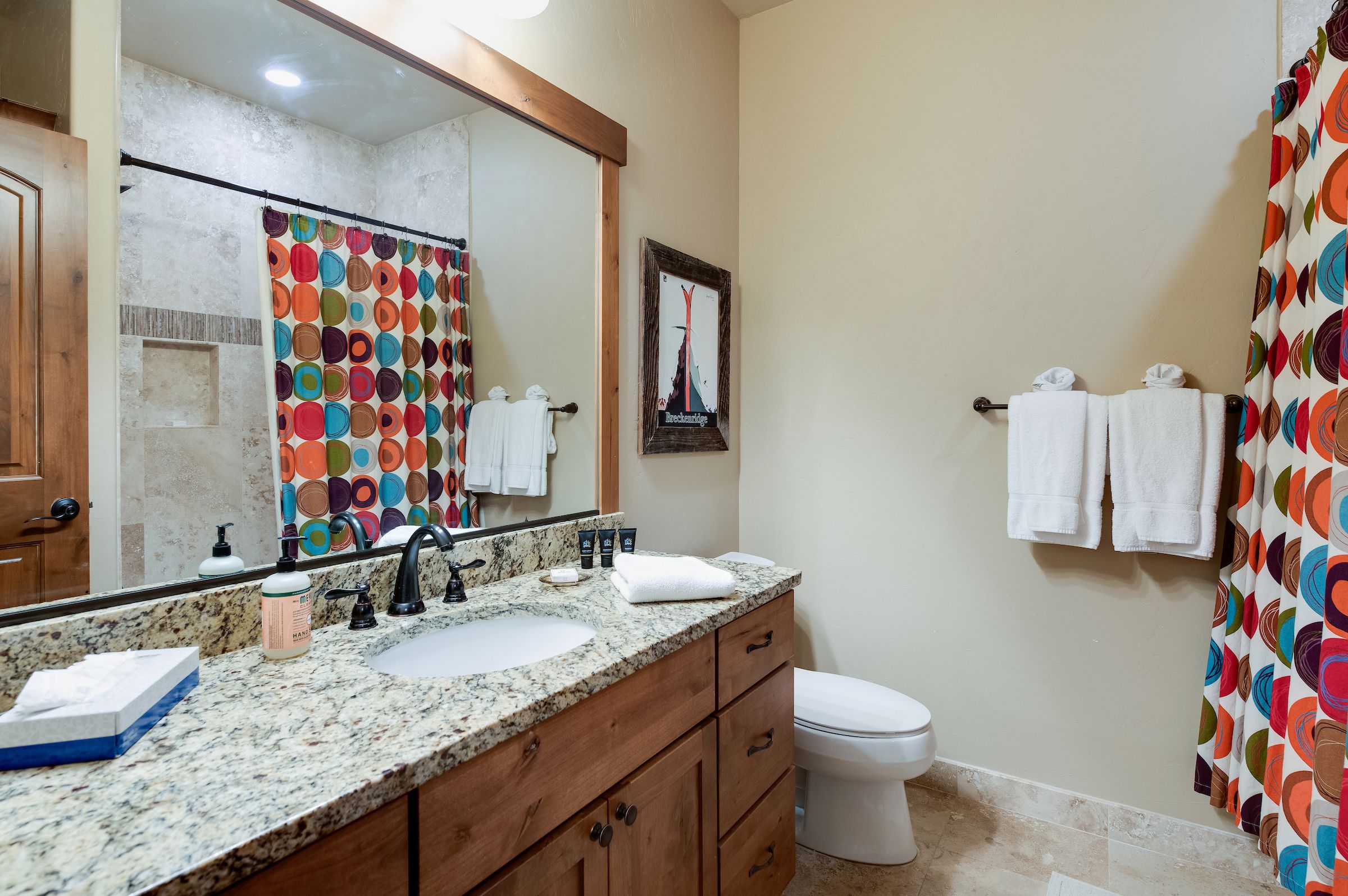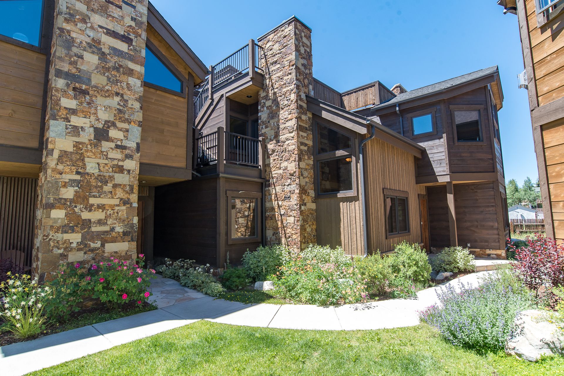 Ridgeview Court Townhome is a well-appointed premium vacation home that comfortably accommodates up to 8 people. With 2 bedrooms, 2 living spaces and 3.5 bathrooms, there’s plenty of room for your group to spread out. Located at the base of Mount Royal and about 5 blocks from downtown Frisco (easily walkable on a warm summer’s night), it’s also a short drive from three of Colorado’s most famous ski resorts. You’ll love the rooftop deck with a gas fireplace, two living areas with flat-screen TVs, and gorgeous kitchen with granite counters and stainless-steel appliances.