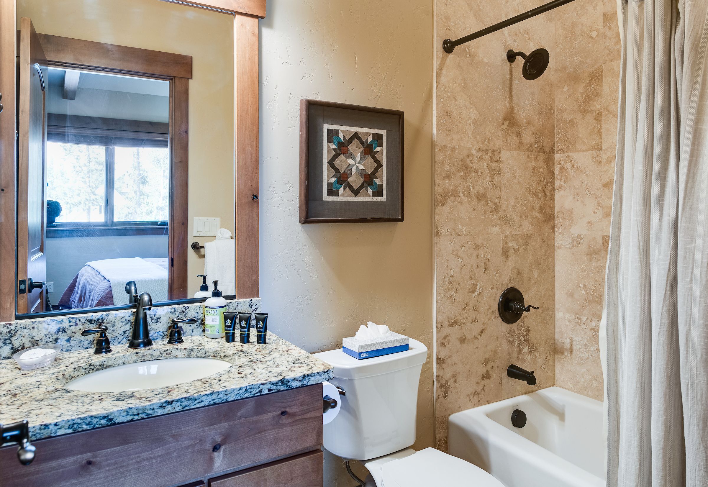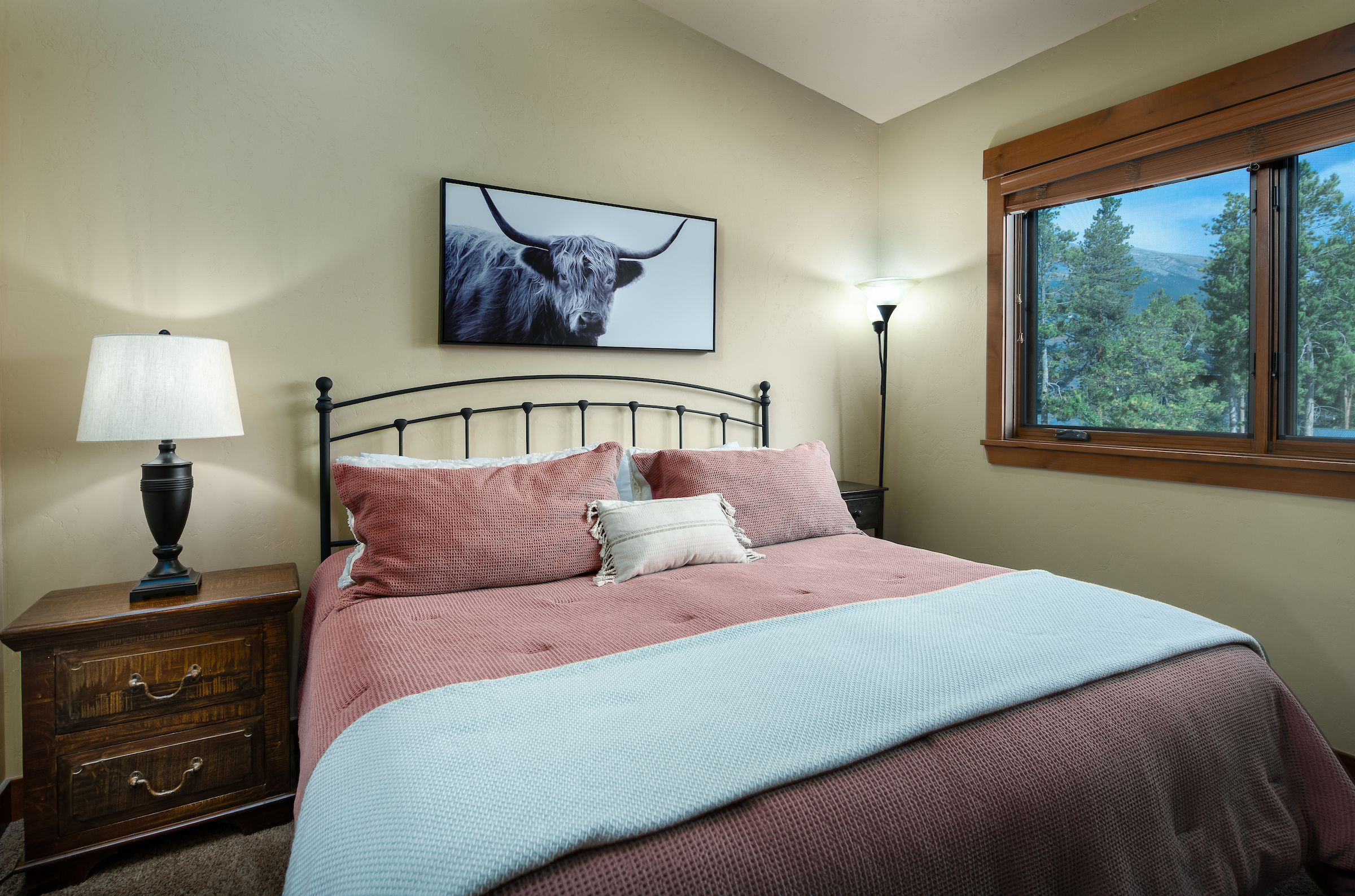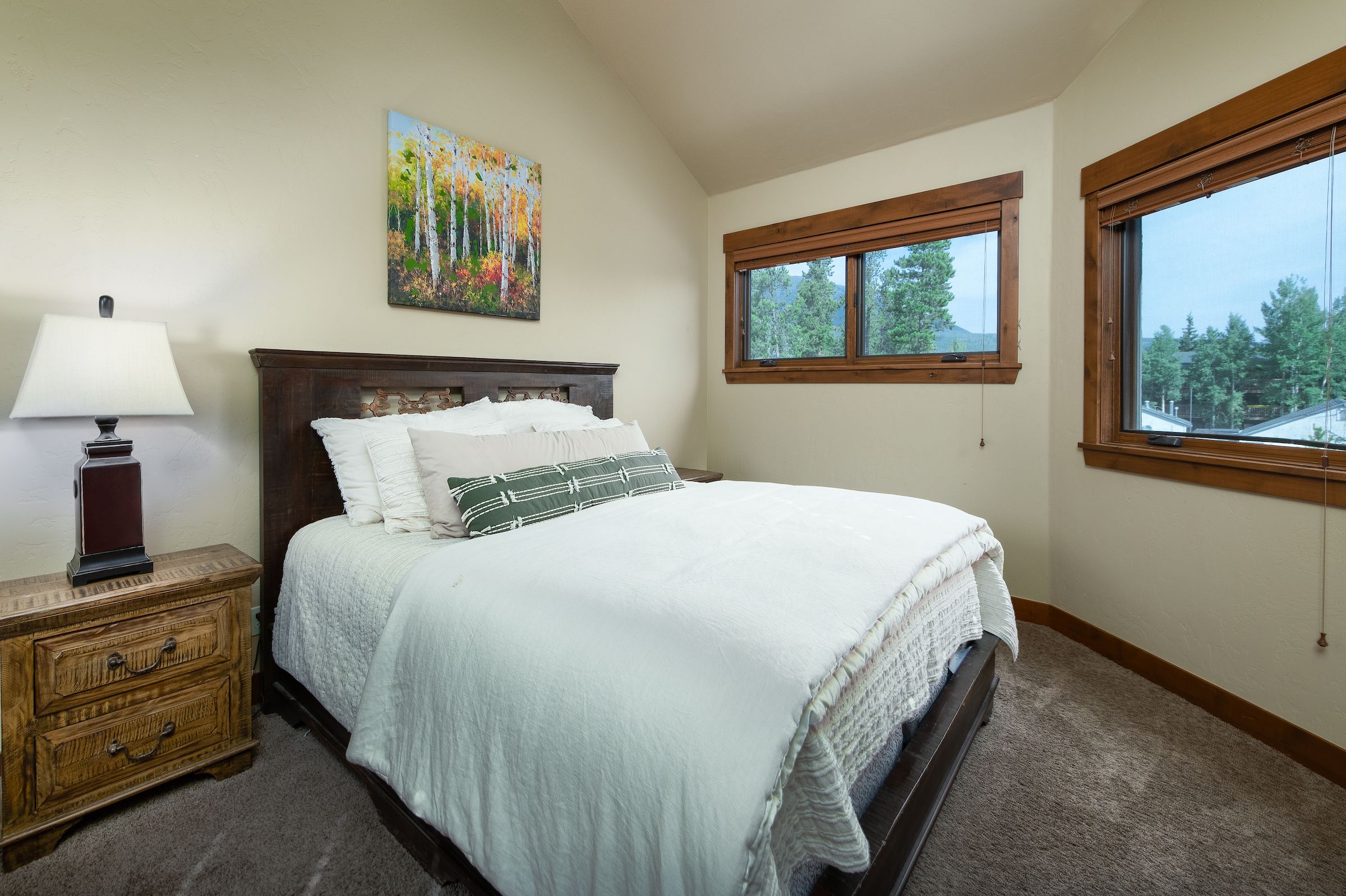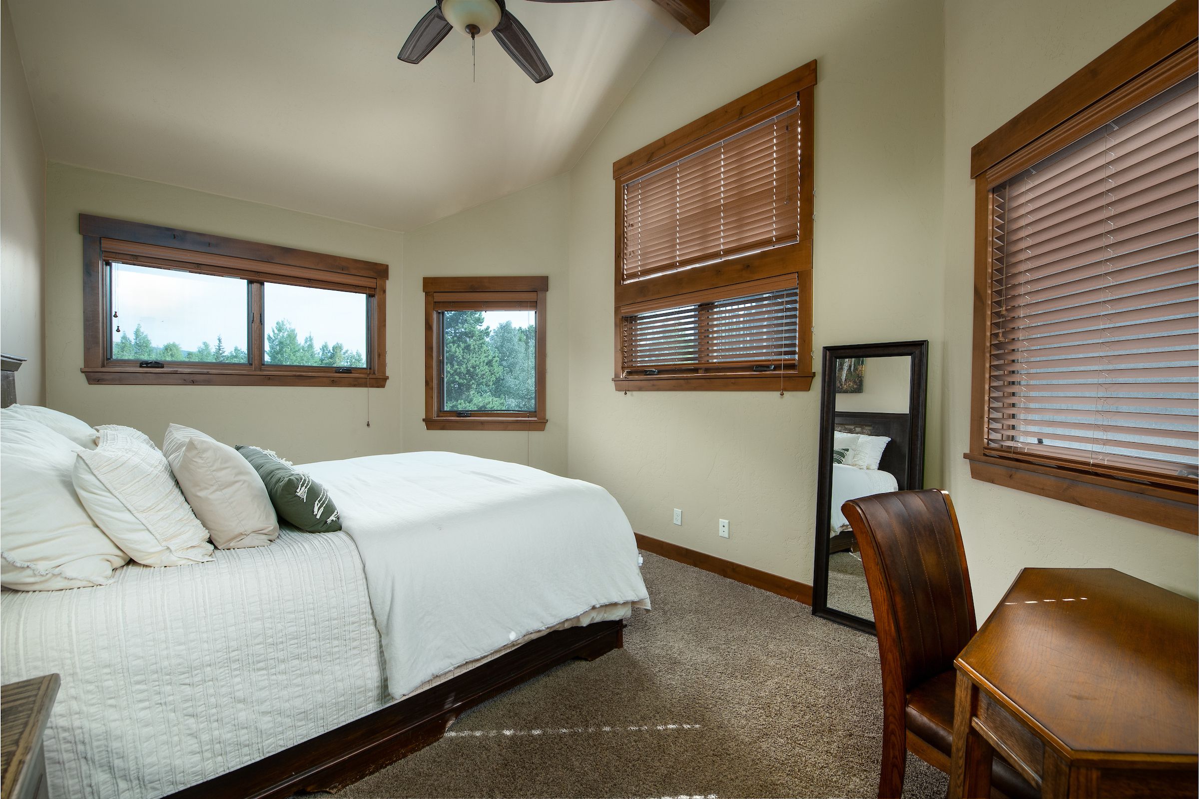 - King master suite: beautiful room with vaulted ceilings and king bed with private attached bathroom with dual sinks and spacious walk-in tile shower. (sleeps 2)