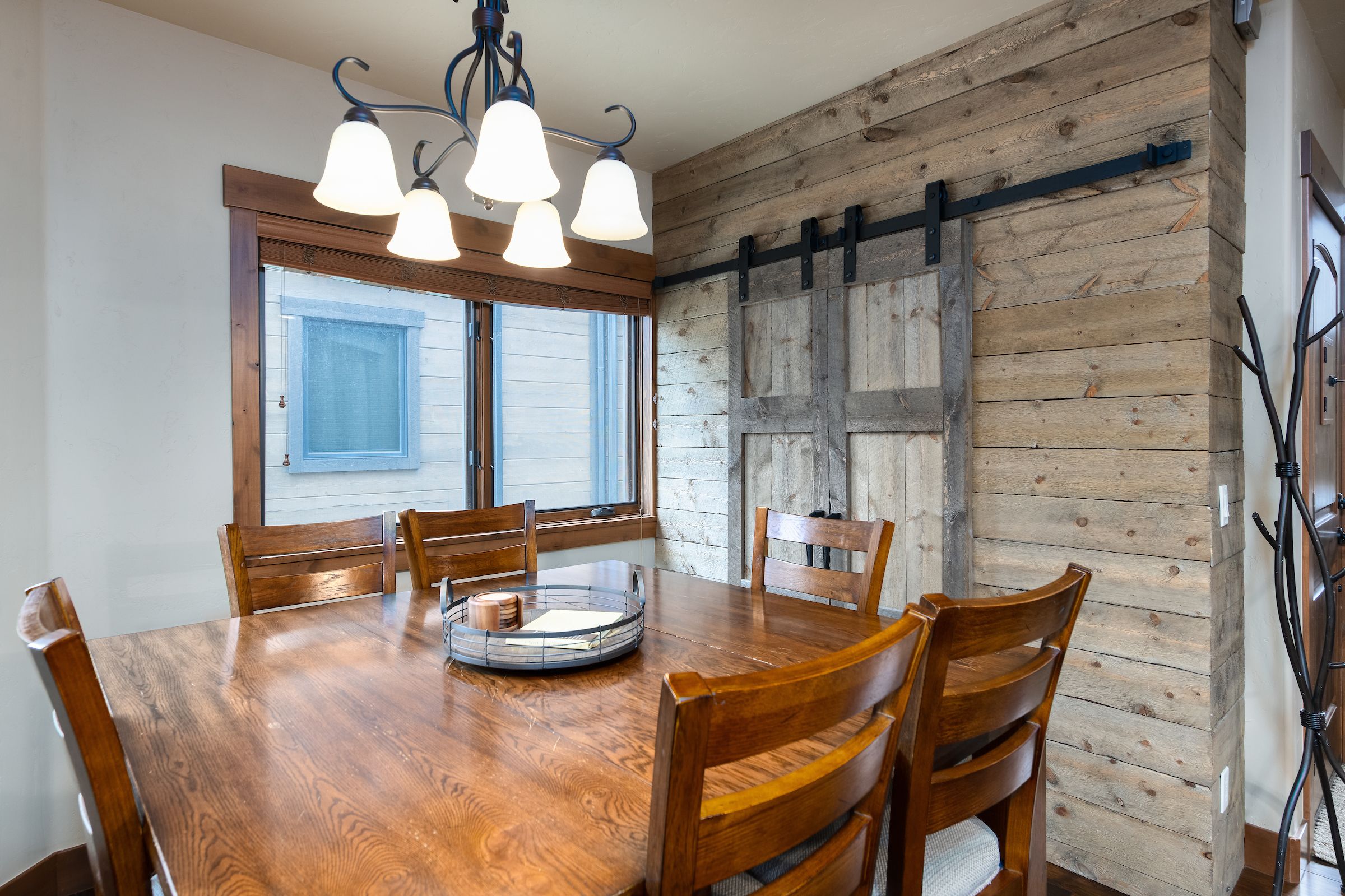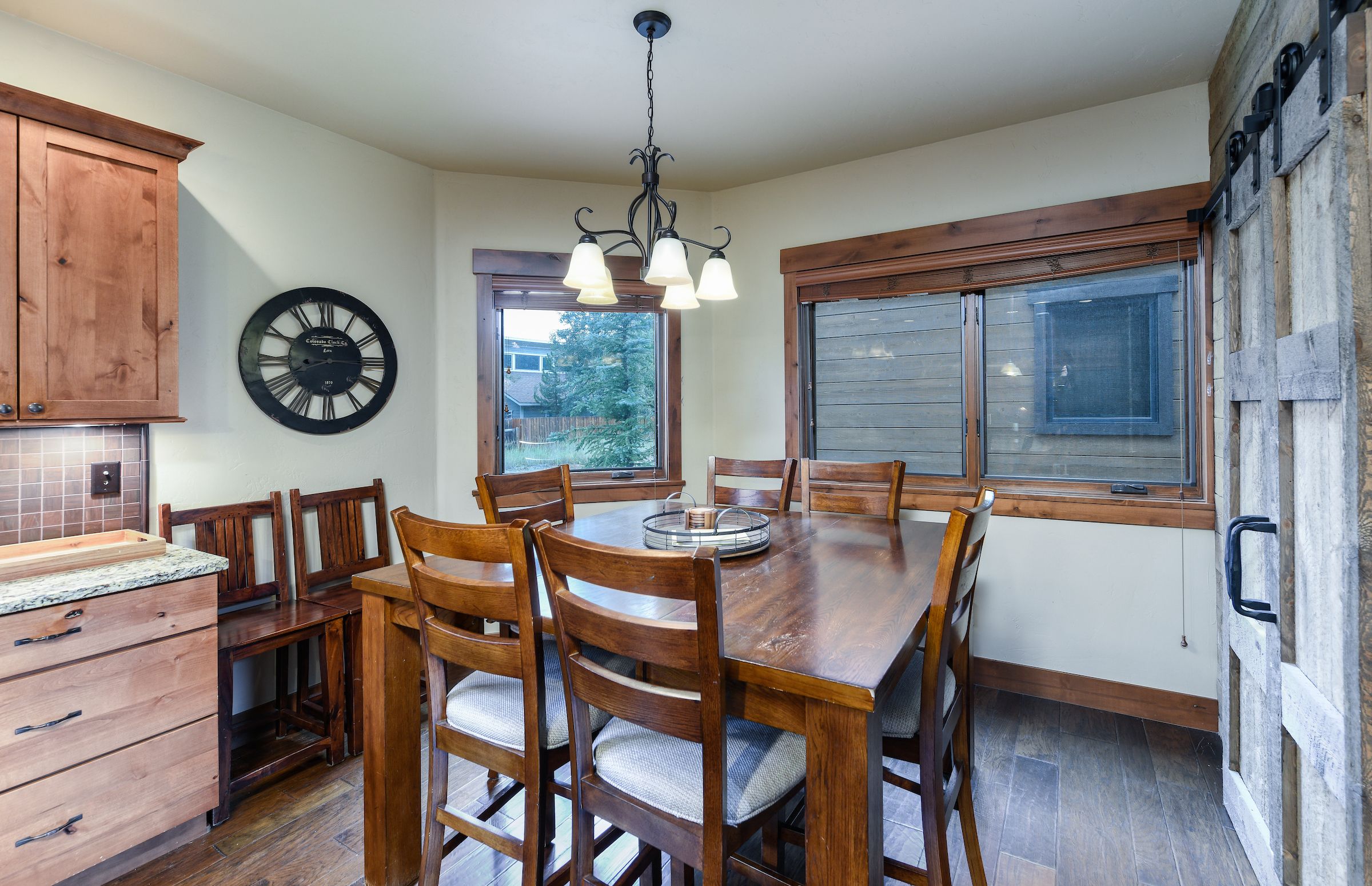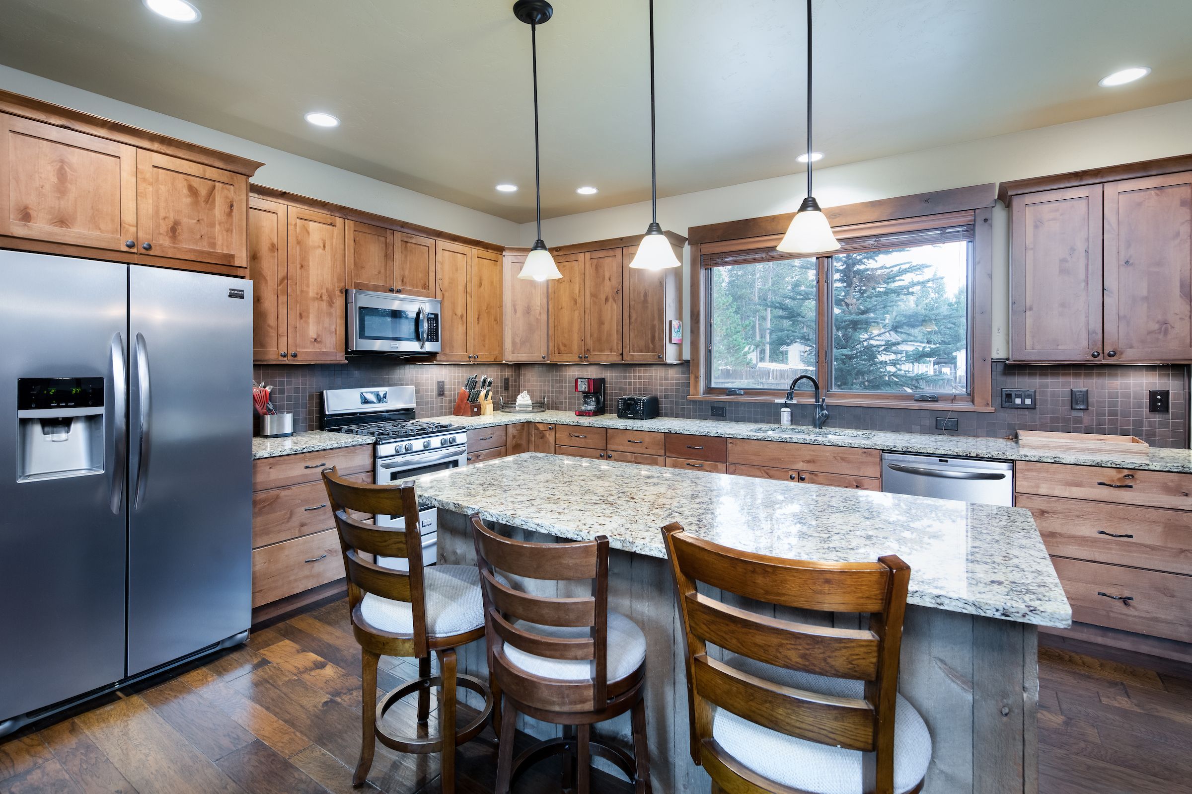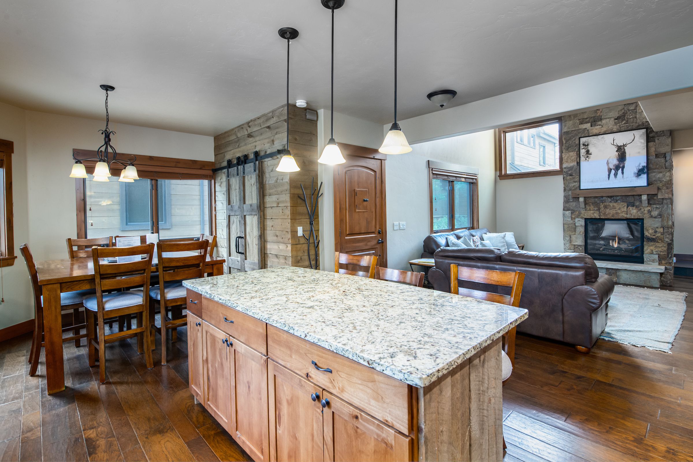 Just off the main living area is the spacious kitchen complete with granite counters and stainless-steel appliances, a chef’s delight! The large island makes for a perfect place to enjoy a quick breakfast before heading out the door for the day or to place out some hours devours before you hit the town for the night. The kitchen comes fully equipped with everything you need to create a memorable mountain meal. The dining room table that is just off the kitchen seats 8 and there are 3 stools at the island.