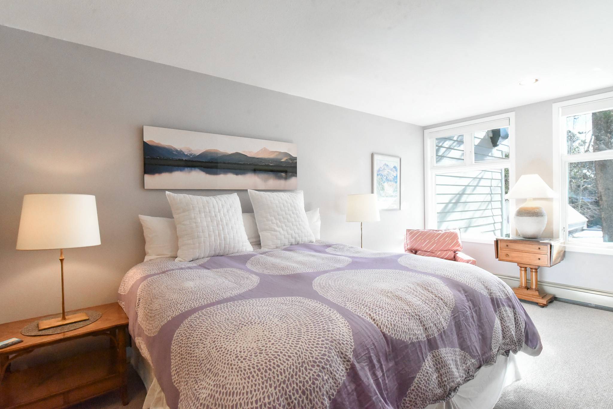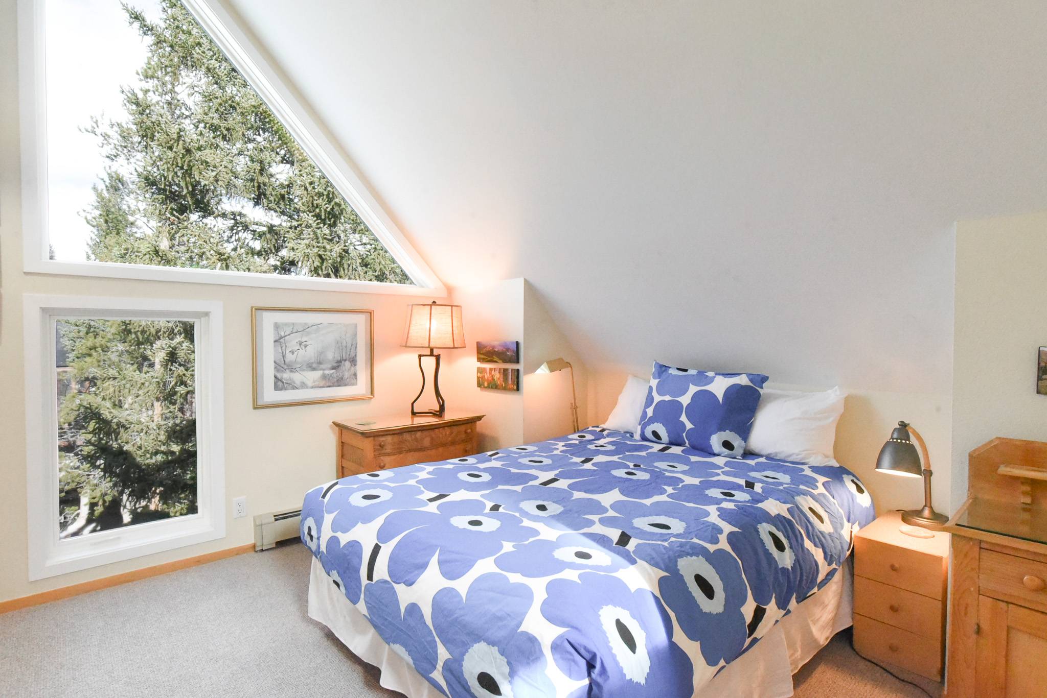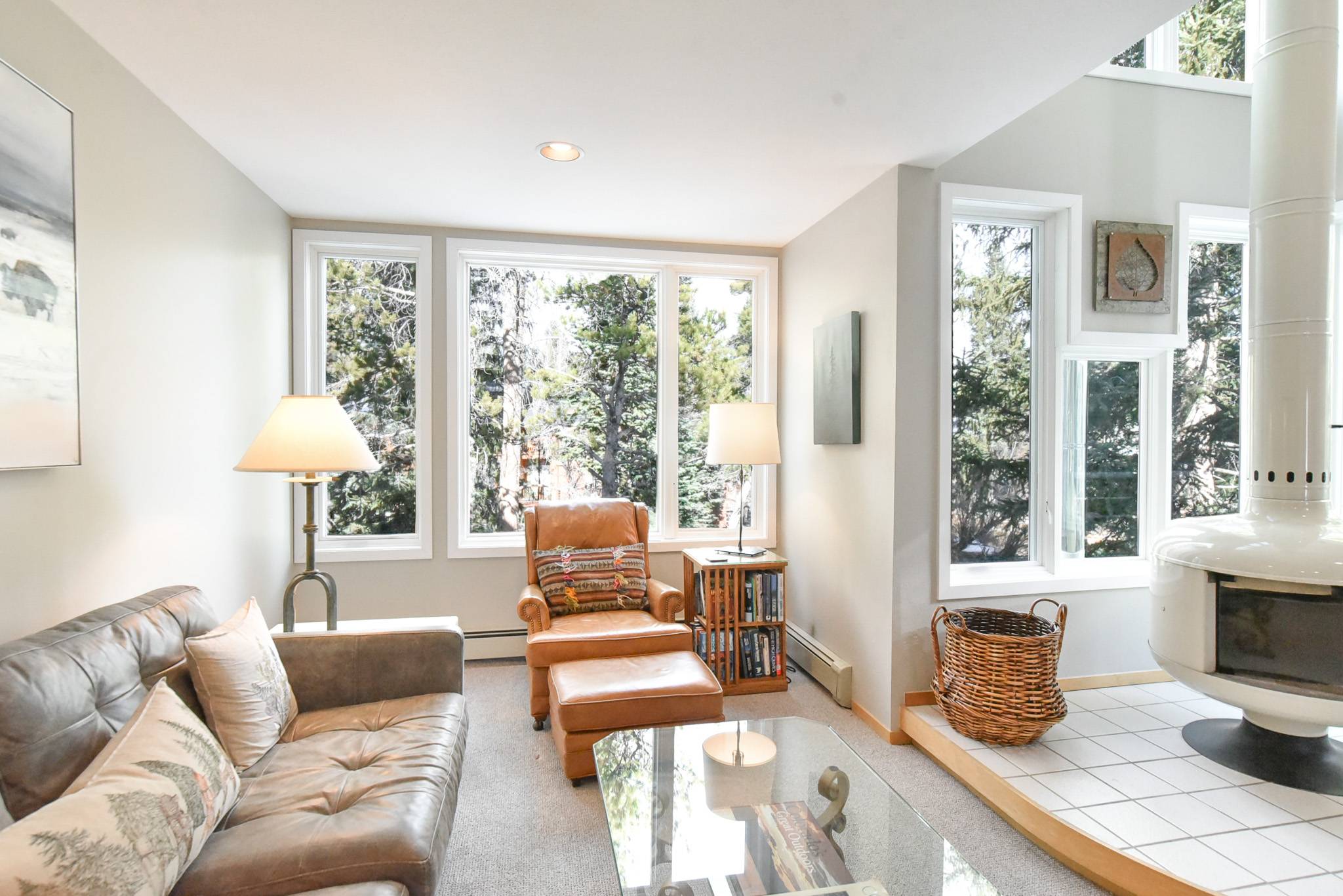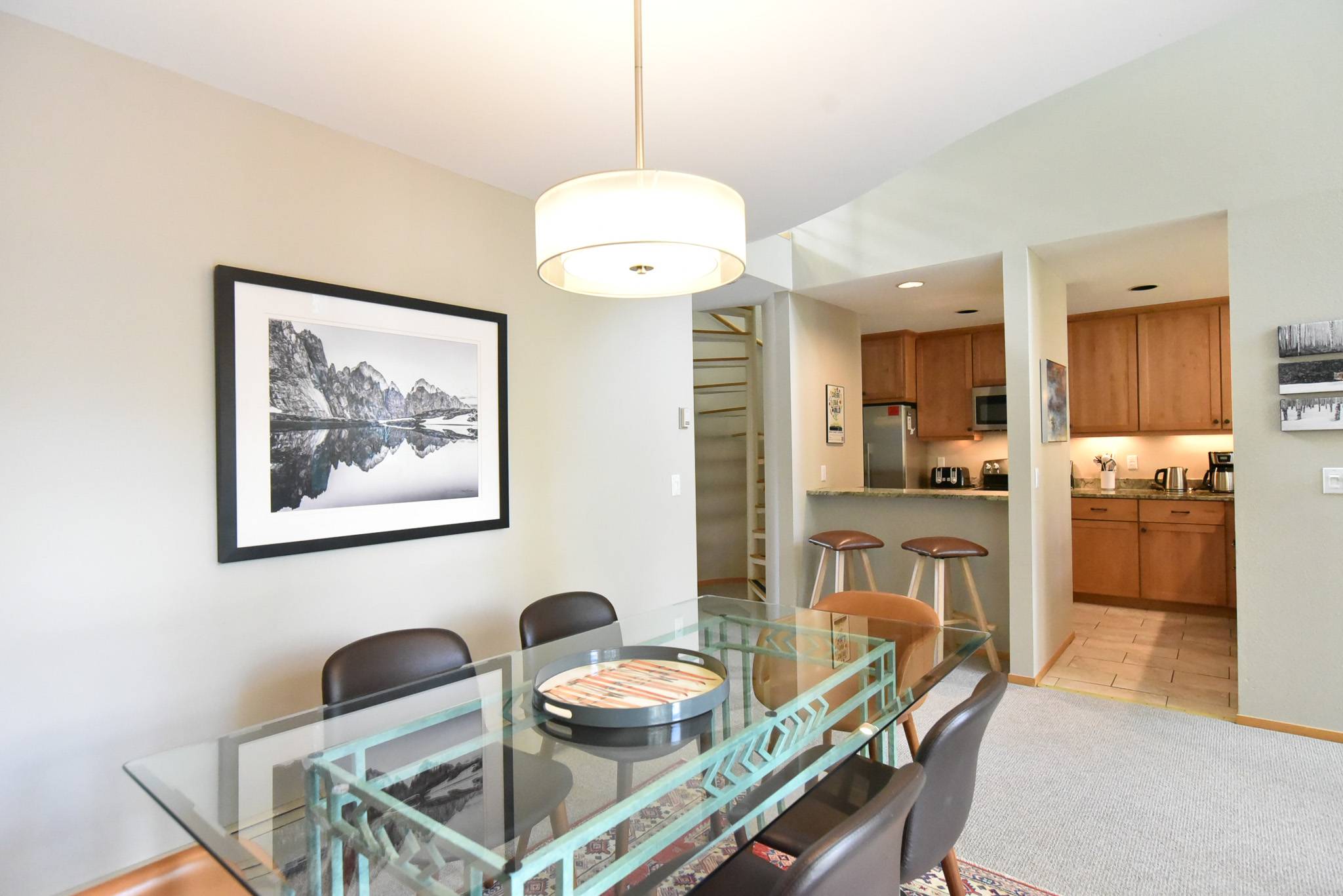 The living area features a woodburning stove centered below floor-to-ceiling windows. It’s a great place to relax and take in the soothing sounds of Ten Mile Creek running just outside, or catch the game (or the morning snow report) on the flat-screen TV. The fully equipped kitchen is nicely updated with granite counters and stainless-steel appliances, and there’s room for six at the dining room table and two more at the breakfast bar.