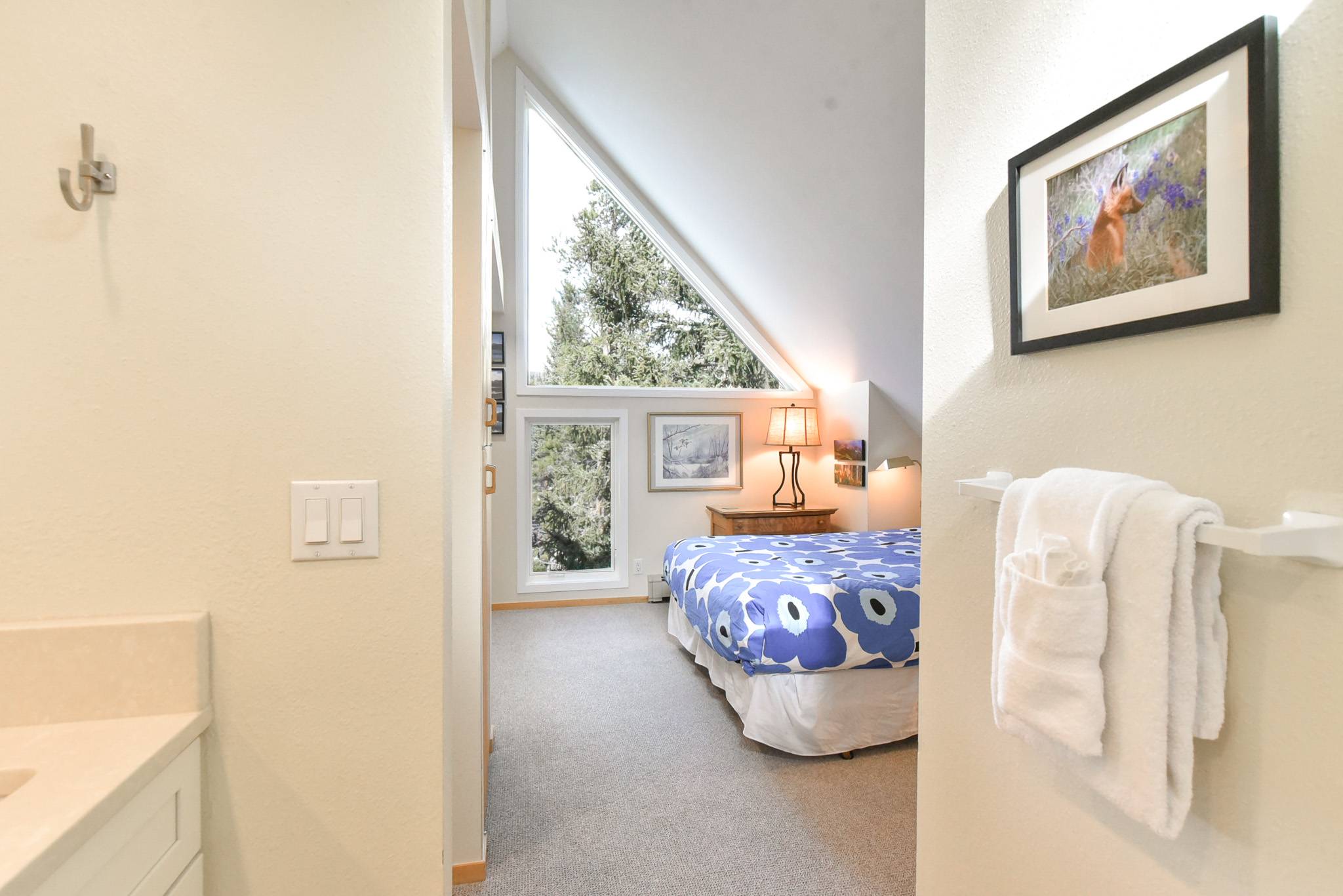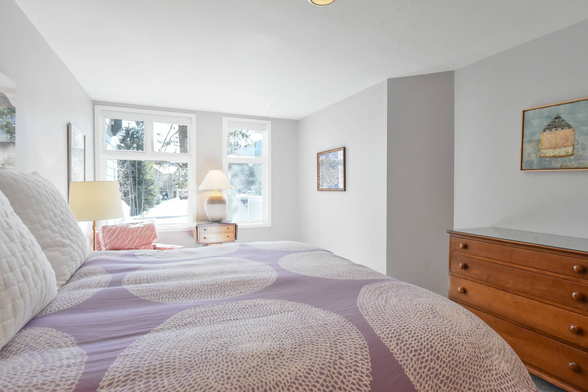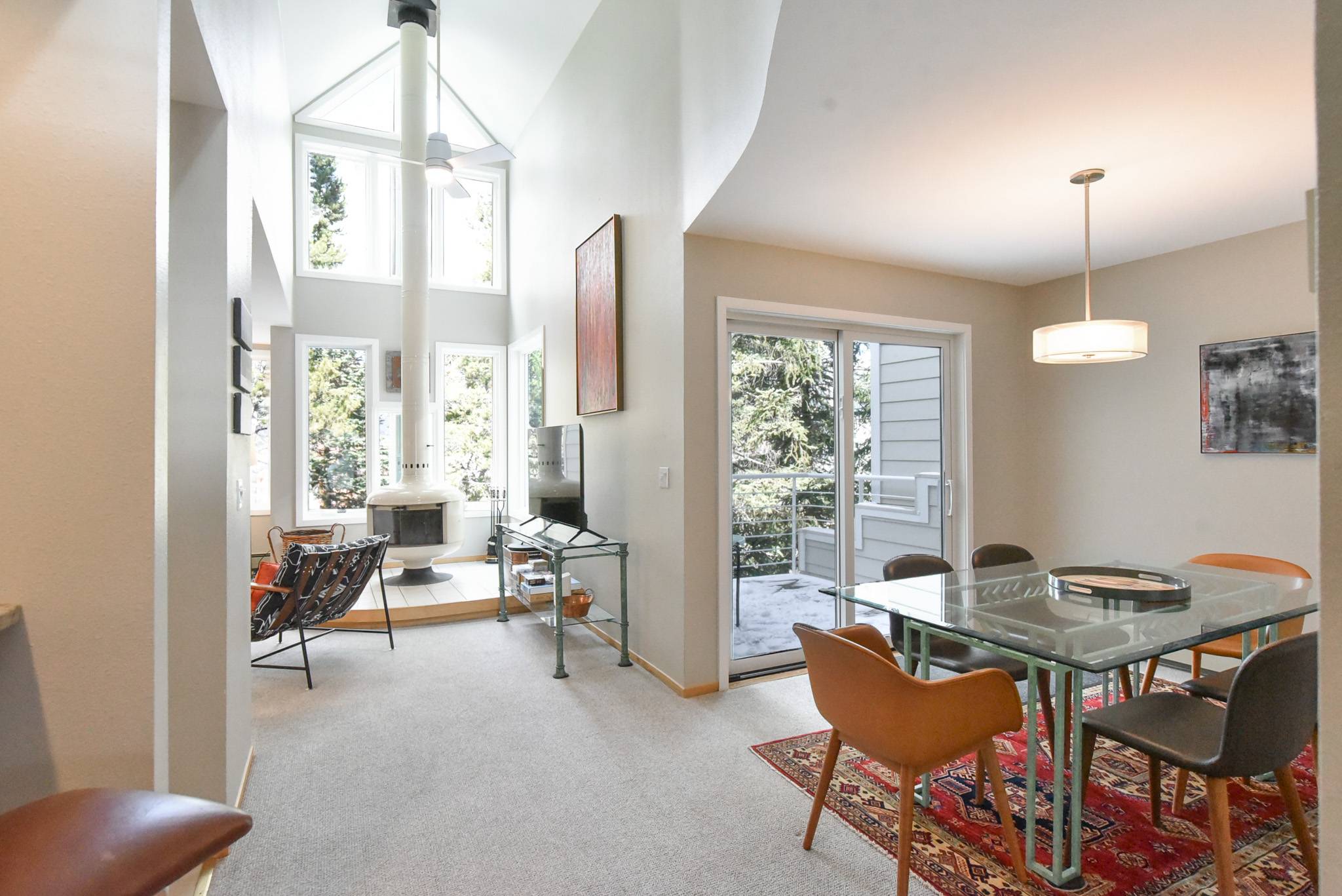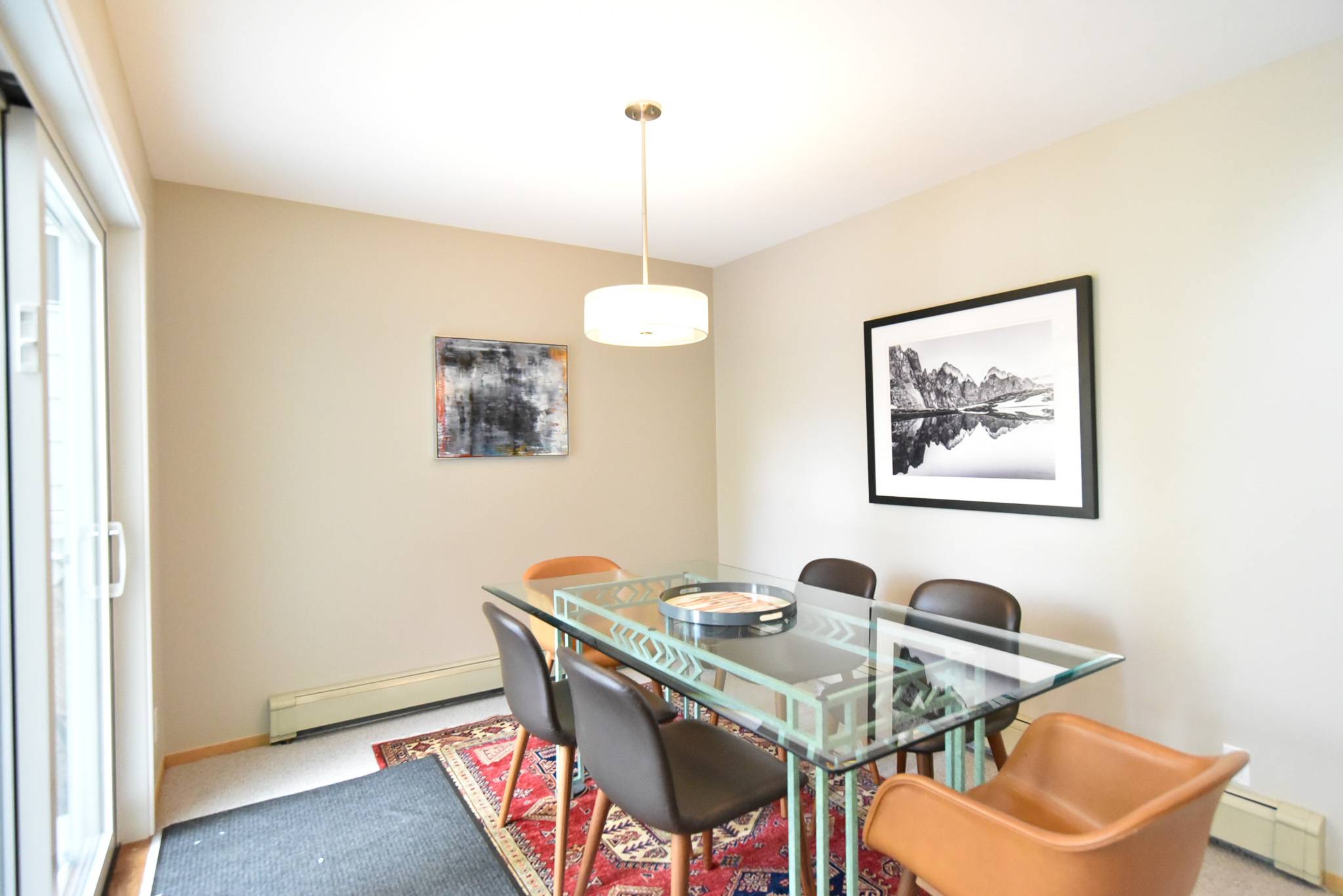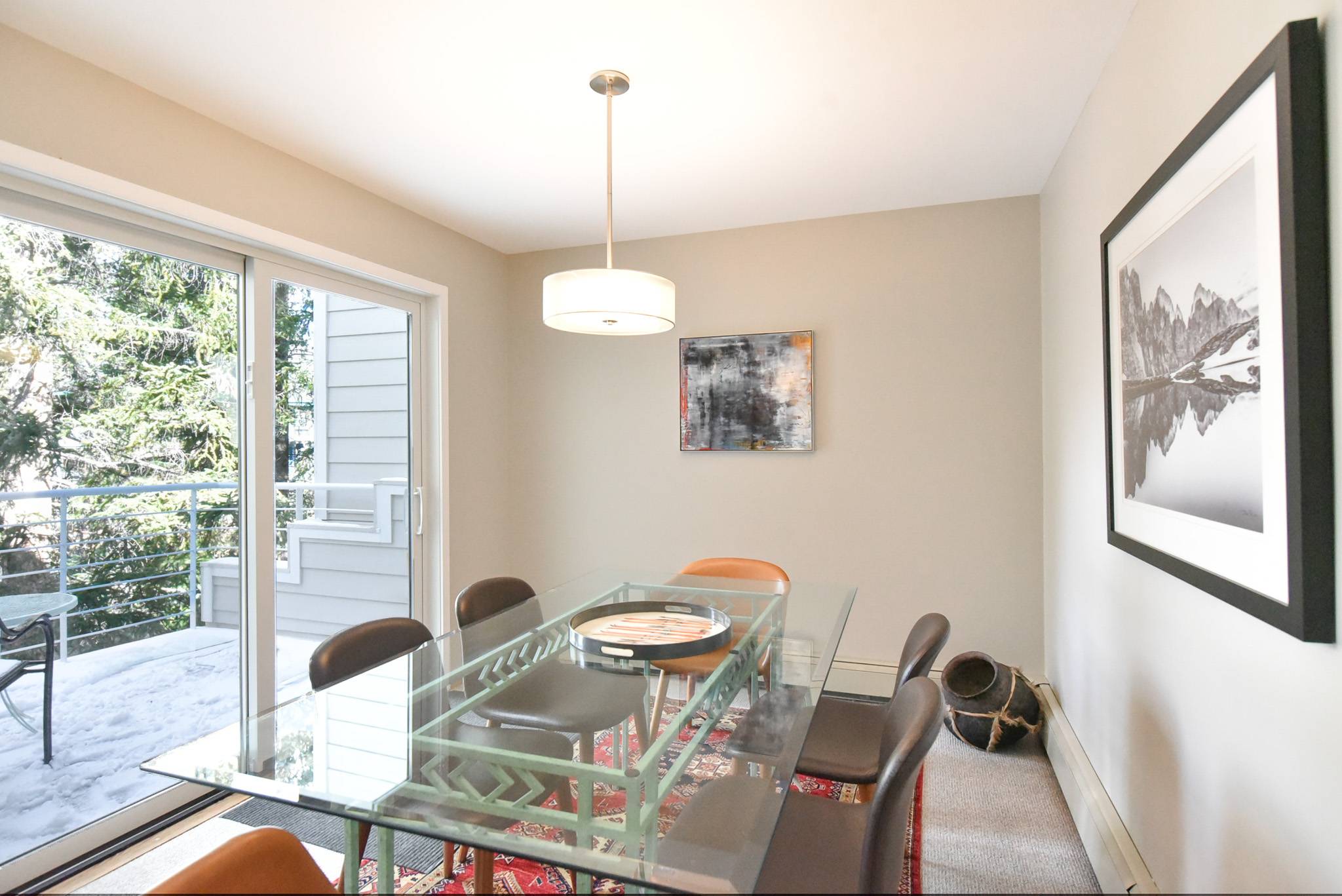 The living area features a woodburning stove centered below floor-to-ceiling windows. It’s a great place to relax and take in the soothing sounds of Ten Mile Creek running just outside, or catch the game (or the morning snow report) on the flat-screen TV. The fully equipped kitchen is nicely updated with granite counters and stainless-steel appliances, and there’s room for six at the dining room table and two more at the breakfast bar.