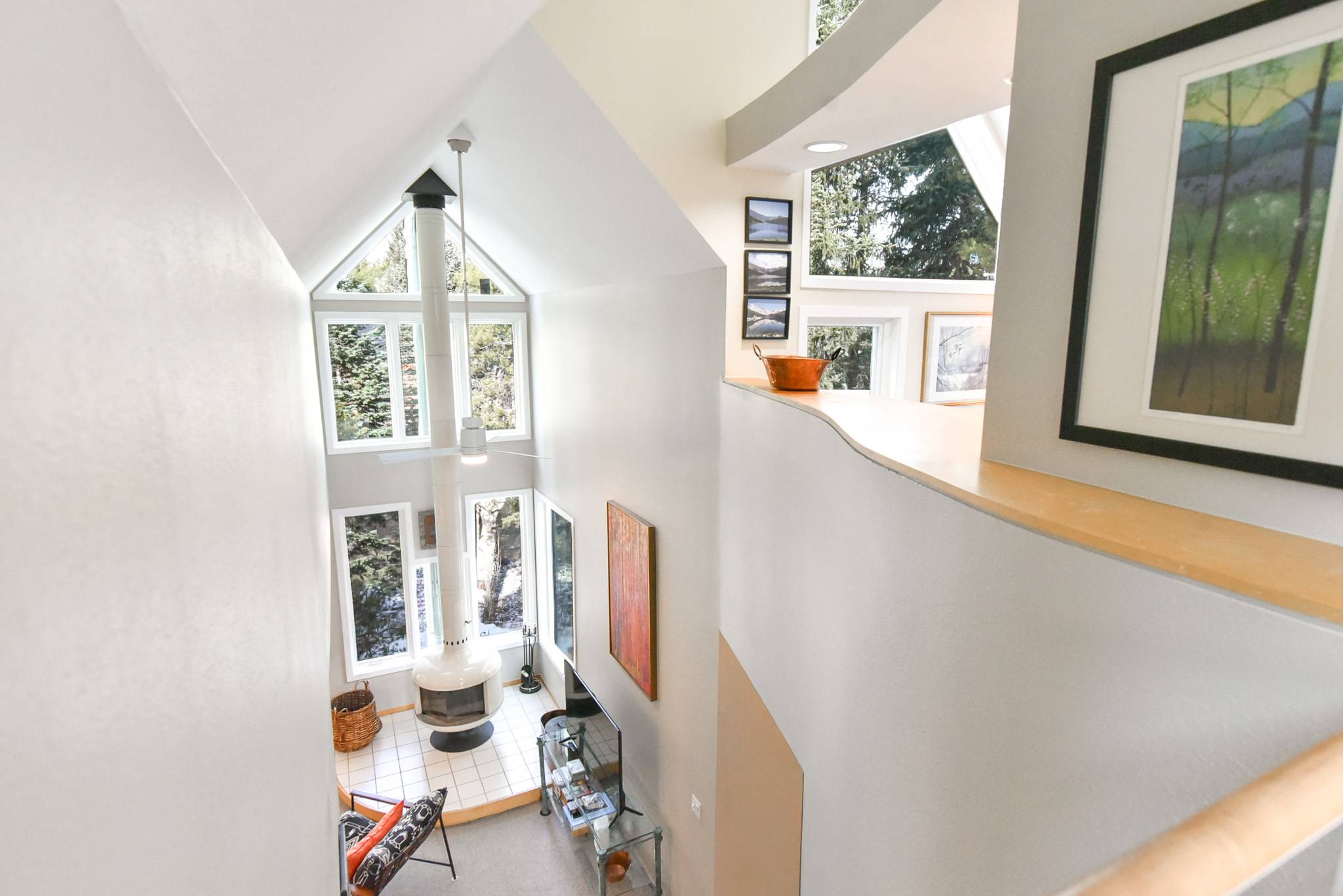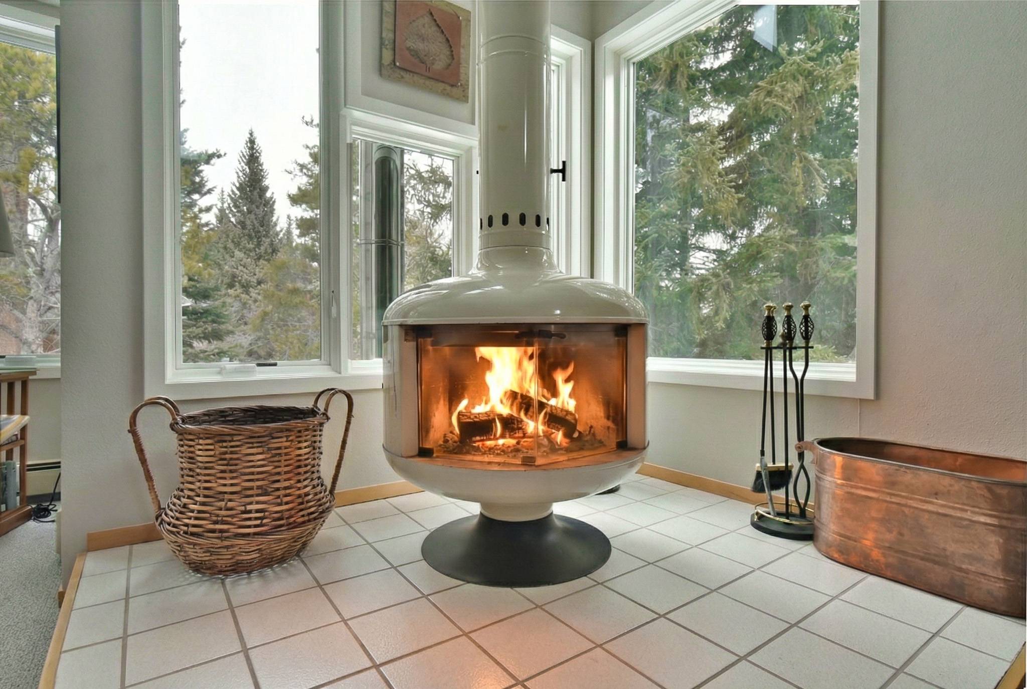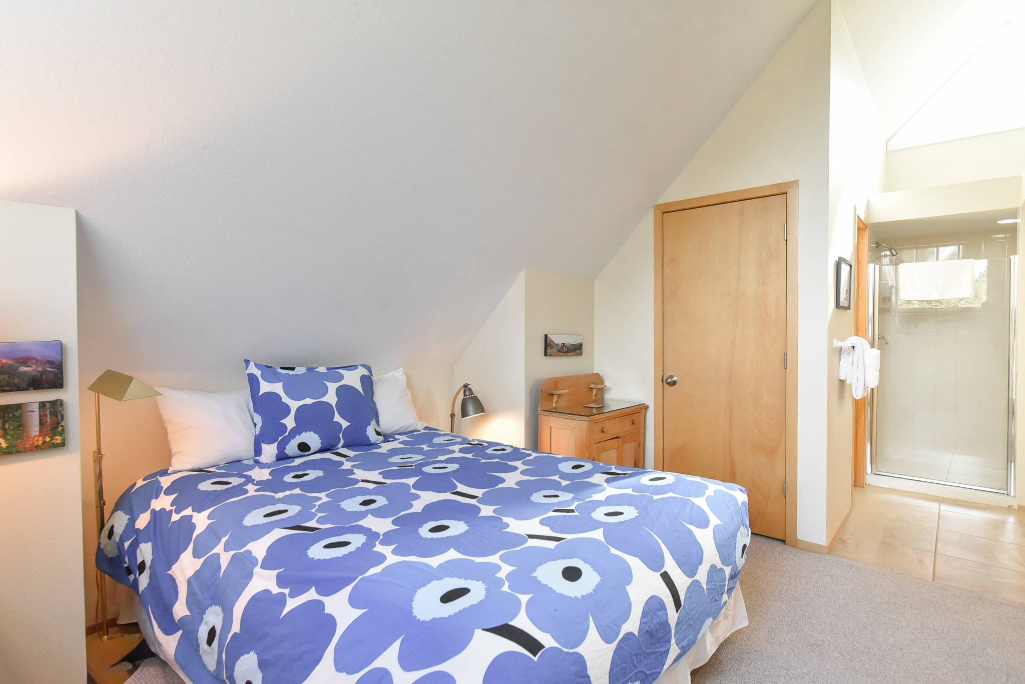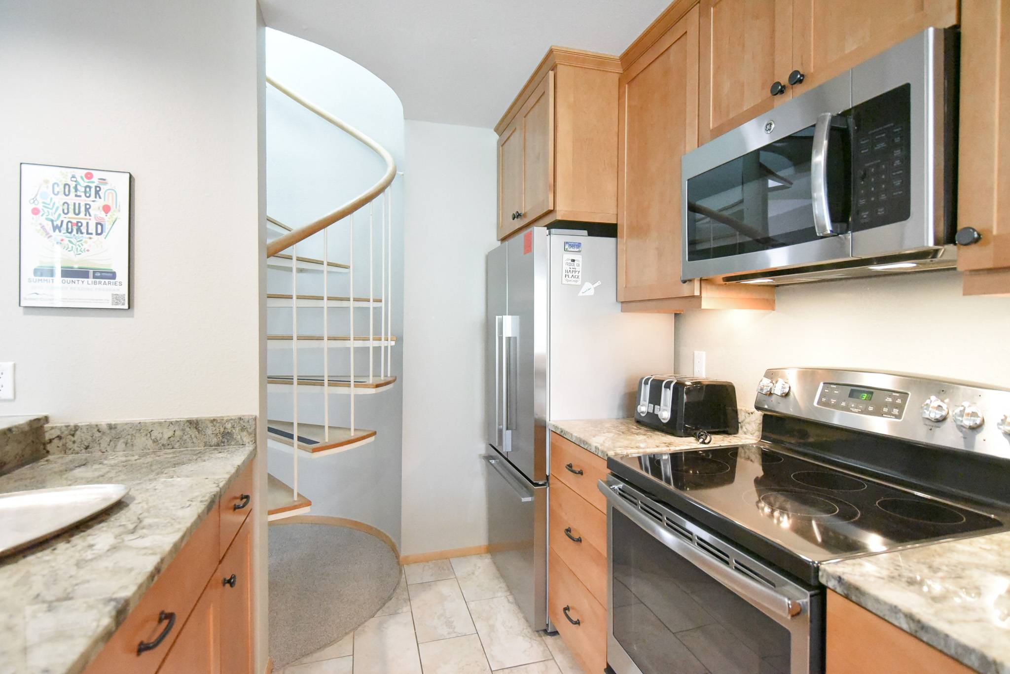 The living area features a woodburning stove centered below floor-to-ceiling windows. It’s a great place to relax and take in the soothing sounds of Ten Mile Creek running just outside, or catch the game (or the morning snow report) on the flat-screen TV. The fully equipped kitchen is nicely updated with granite counters and stainless-steel appliances, and there’s room for six at the dining room table and two more at the breakfast bar.