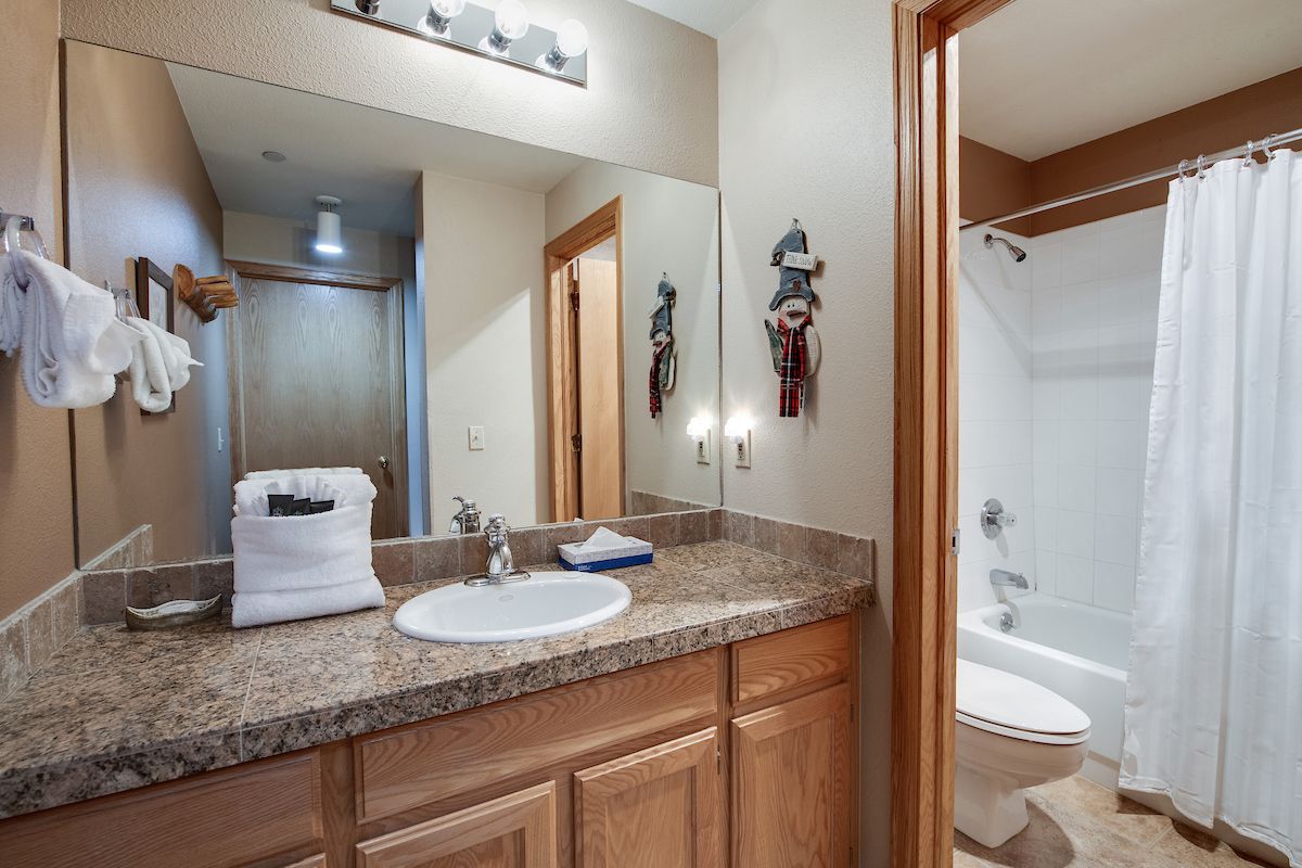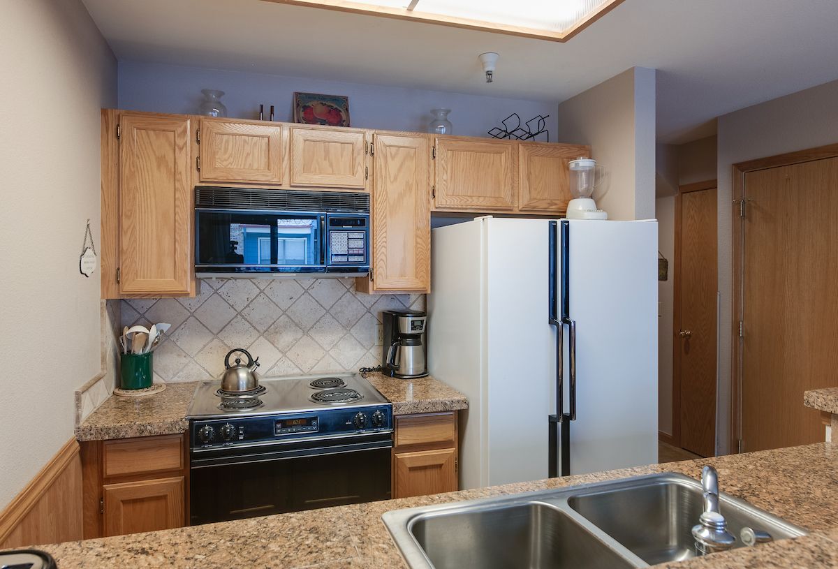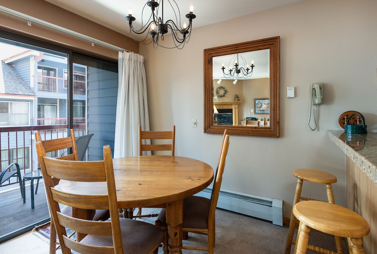 River Mountain Lodge Peaks Trail Condo is a comfortable two-level deluxe condo with excellent proximity to everything you are looking for in a Breckenridge ski vacation. All the comforts of home are here, including a full kitchen, two full bathrooms, an LCD TV, and a gas fireplace to lounge by after skiing. The dining table seats four, and there’s room for three at the counter for a quick breakfast or après-ski snack.