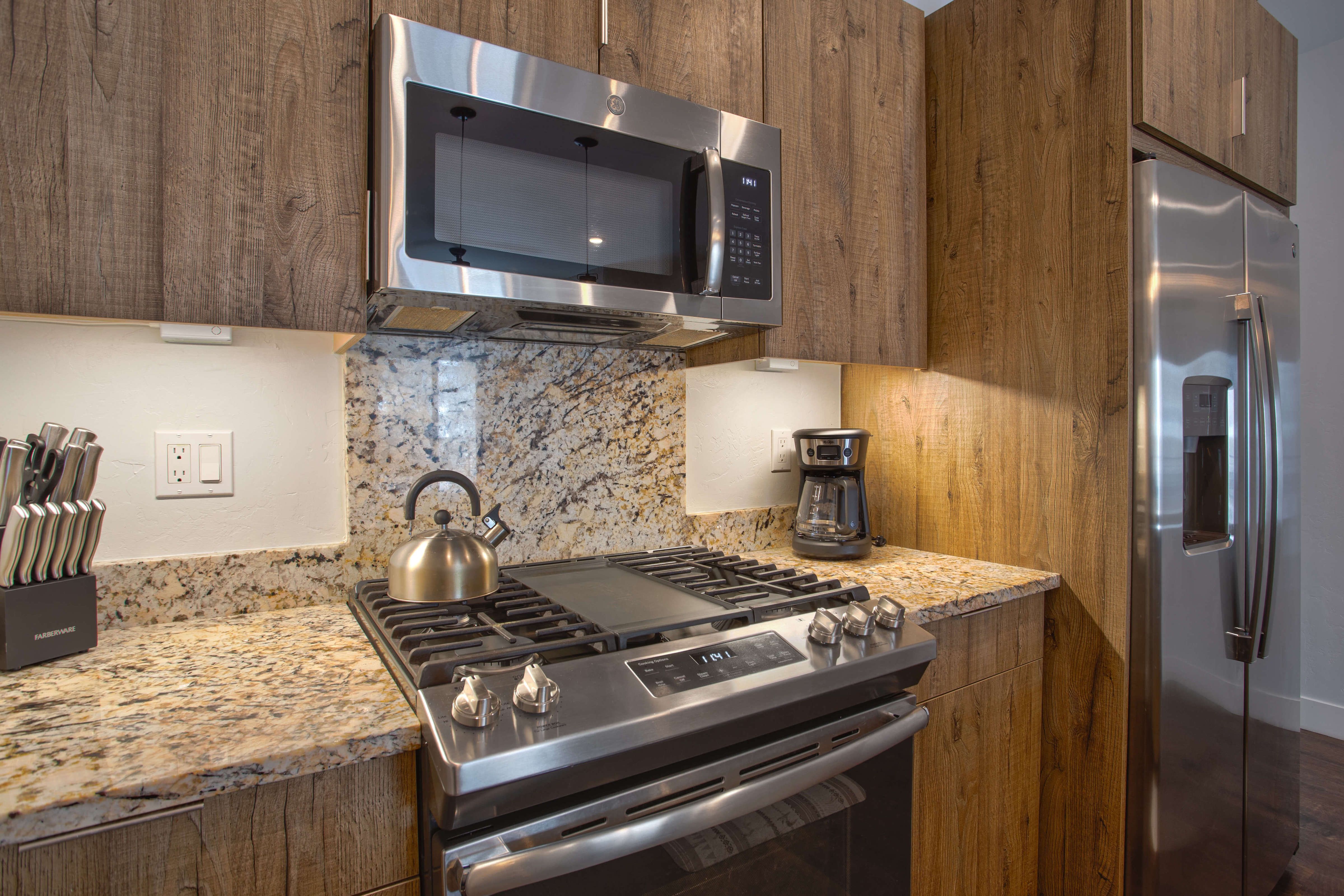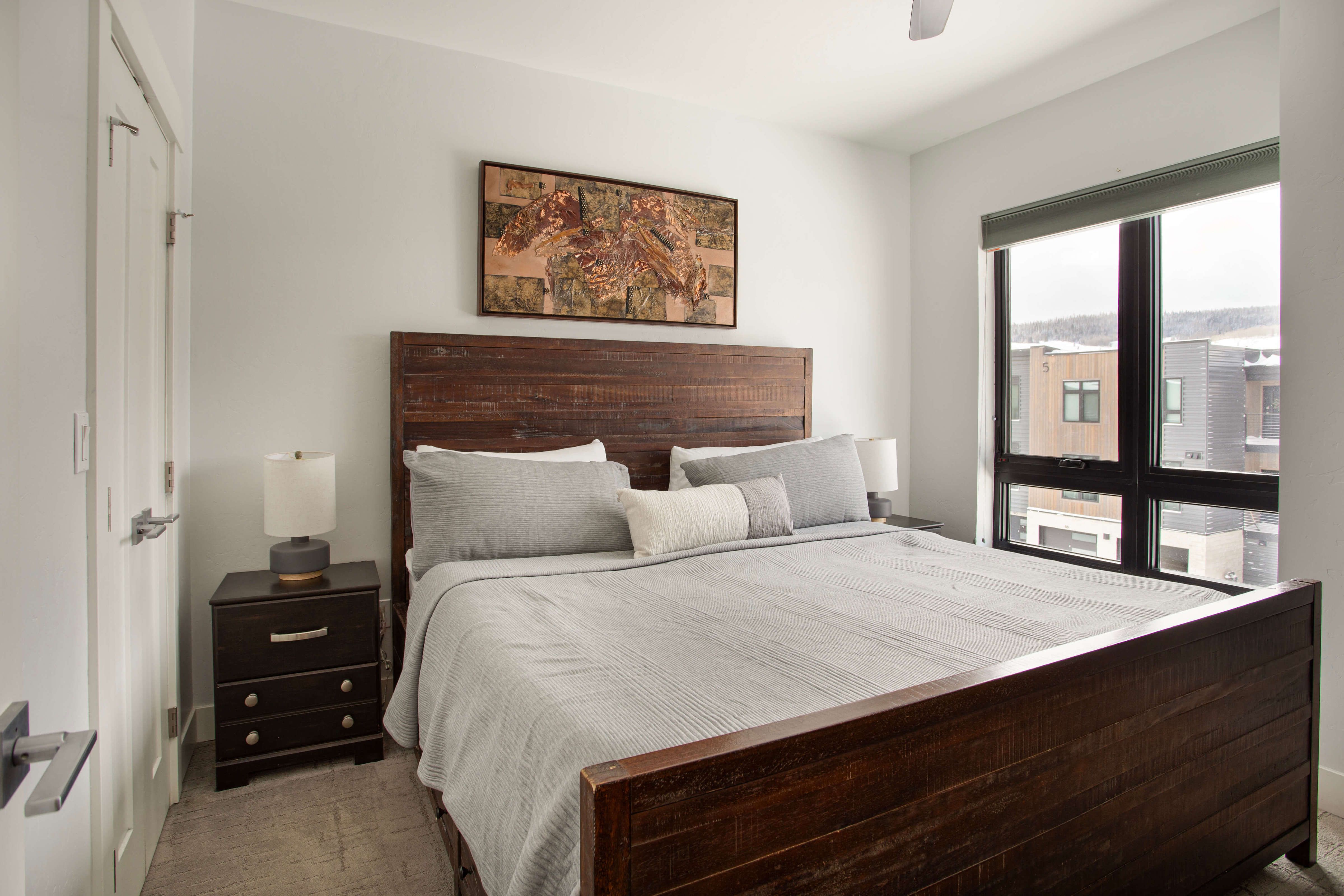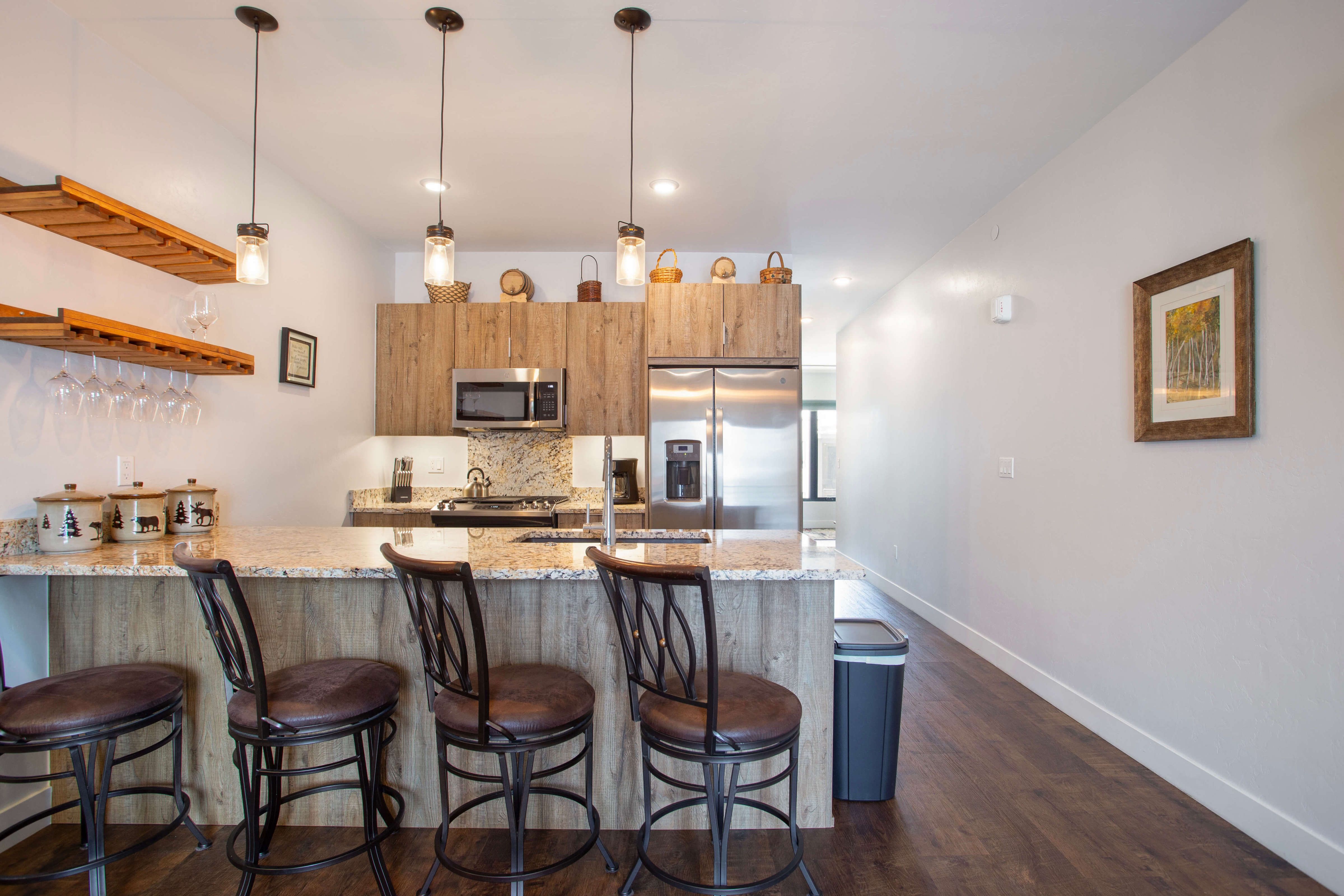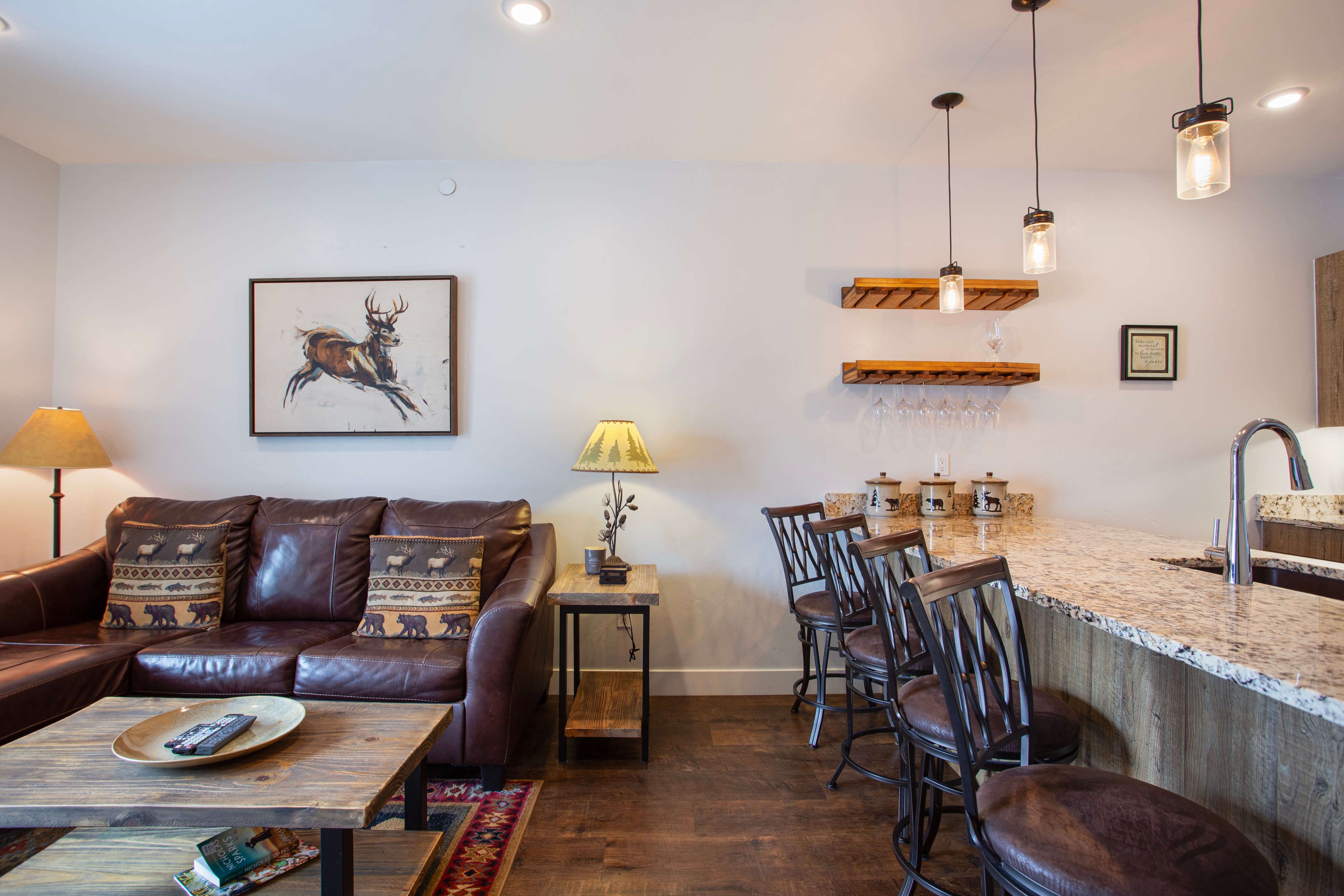 River West Buffalo Mountain Condo is a premium 1-bedroom, 1-bathroom condo that’s fantastic for groups of up to four. The living area features comfy seating, a gas fireplace, and a flat-screen Smart TV; and just outside, there’s a patio directly overlooking the Blue River and Ptarmigan Peak. The kitchen has granite counters, stainless-steel appliances (including a gas range) and all the gear you’ll need to whip up après-ski snacks or full meals. There’s seating for four at the counter.