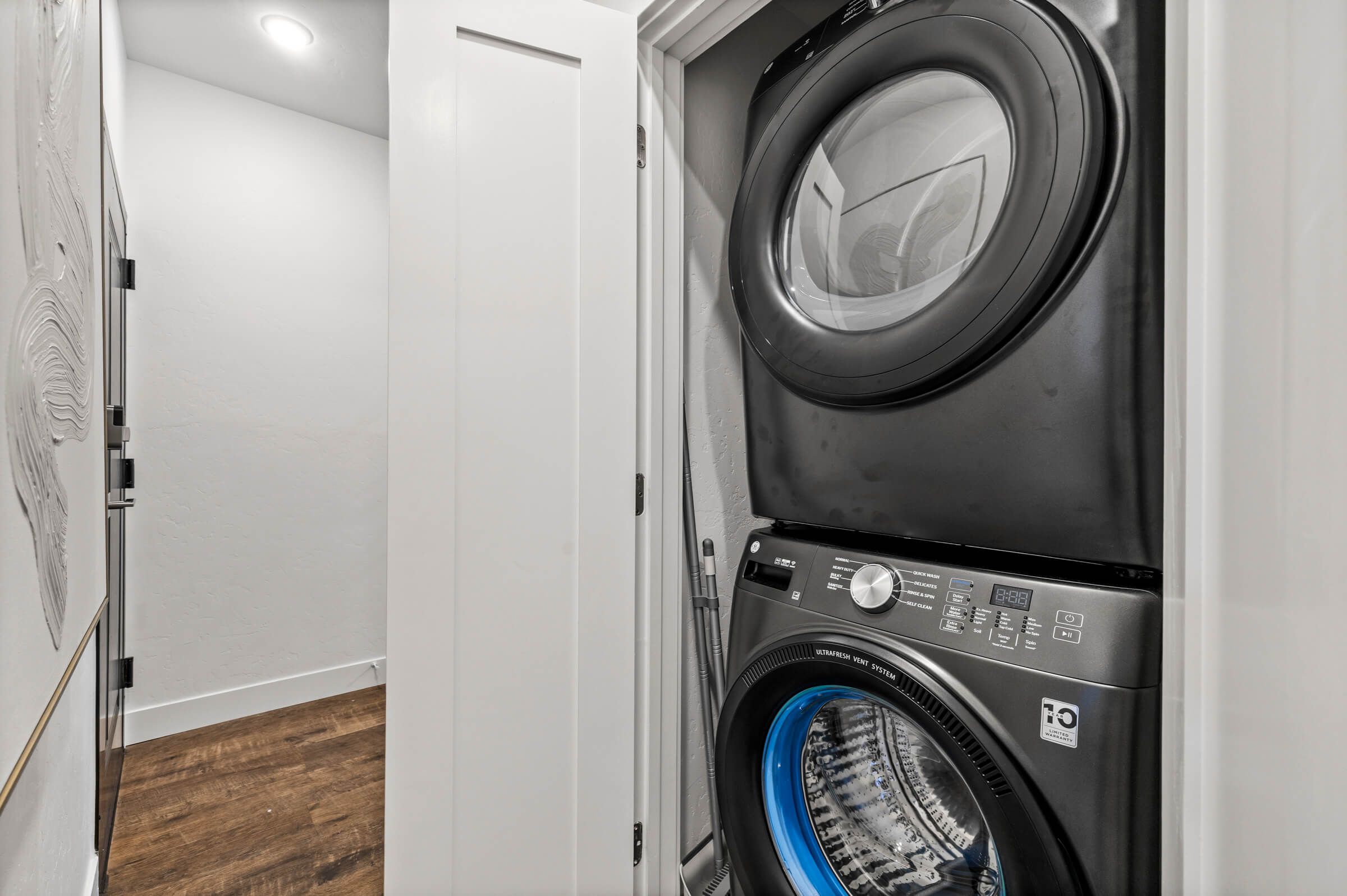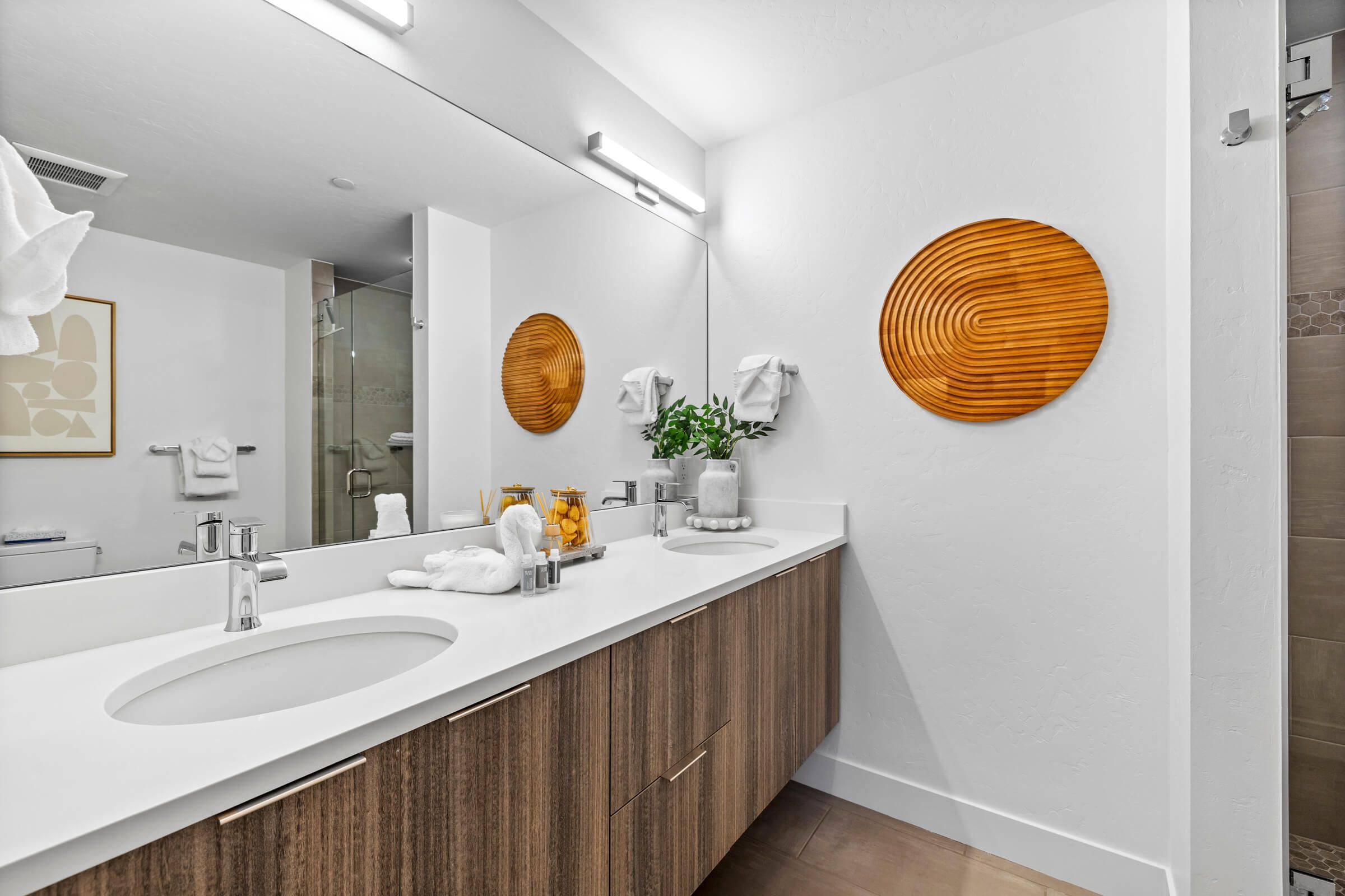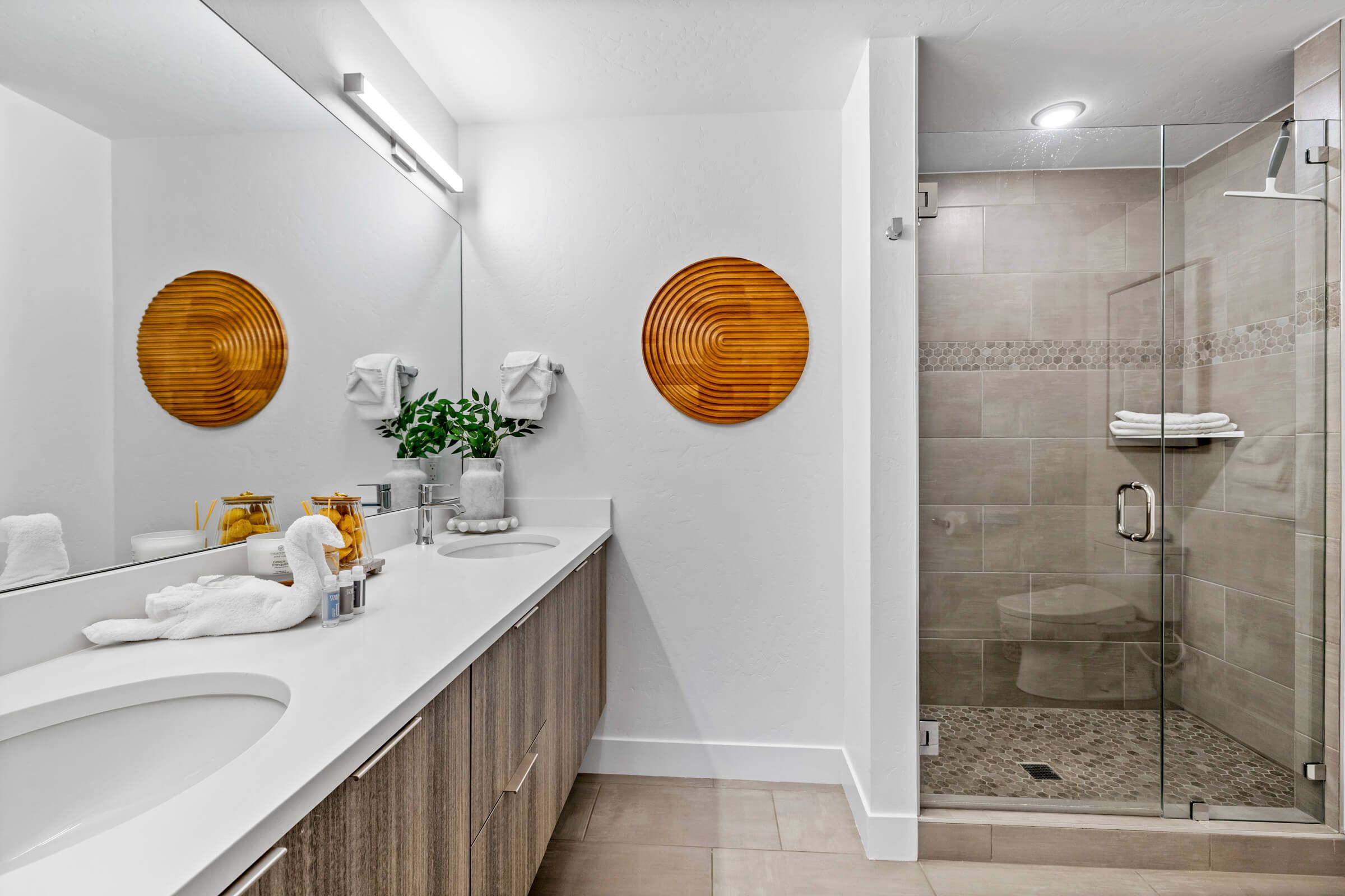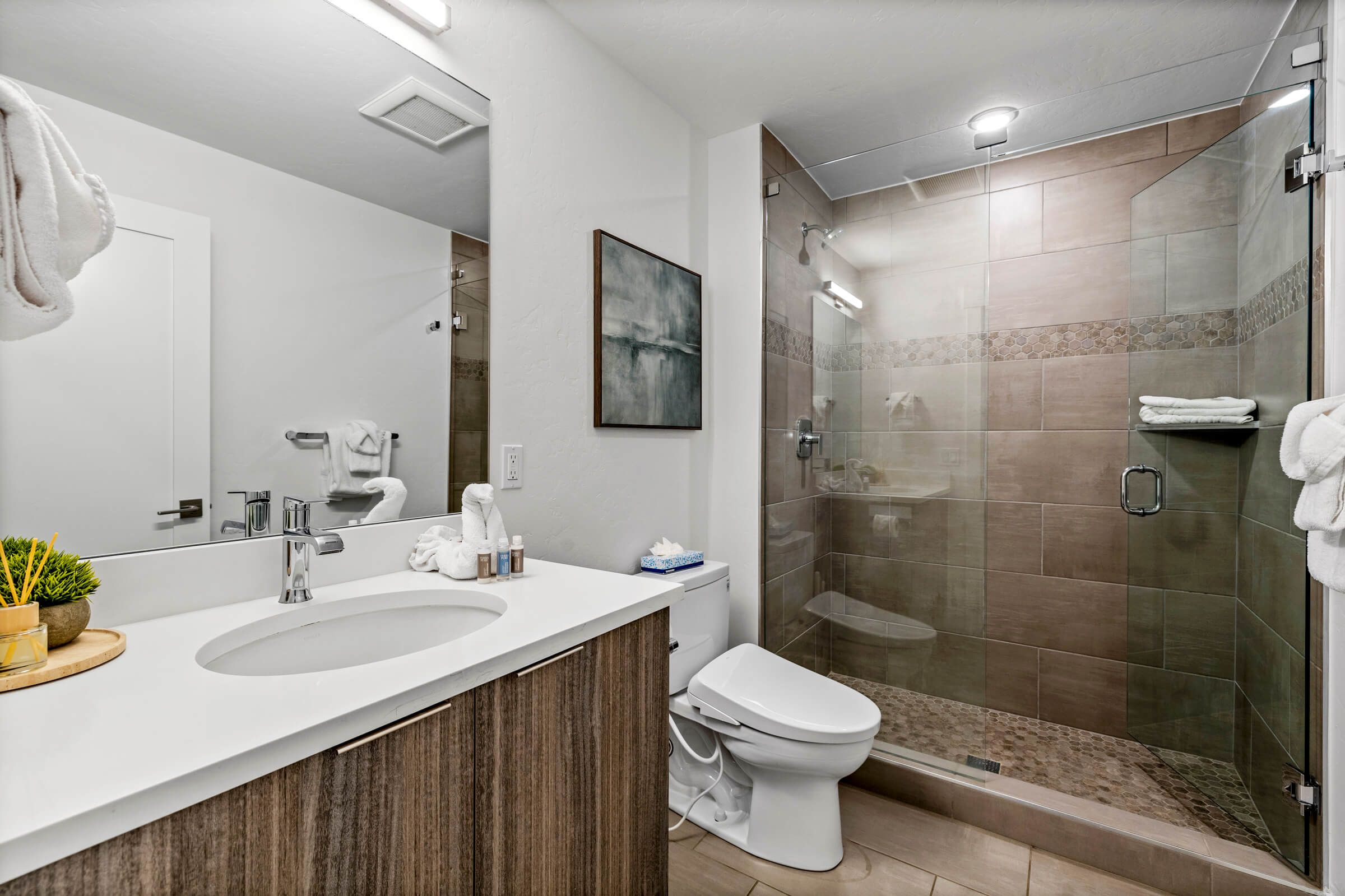 The primary suite is a luxurious retreat with a king bed, Smart TV, and a spa-like ensuite bathroom featuring dual vanities, a walk-in tile shower, and a heated bidet-style toilet. The second bedroom is ideal for kids or young adults with a full-over-full bunk bed, twin trundle, and Smart TV. A second full bathroom off the hallway offers another walk-in shower and heated bidet toilet, while the in-unit washer and dryer add convenience for longer stays.