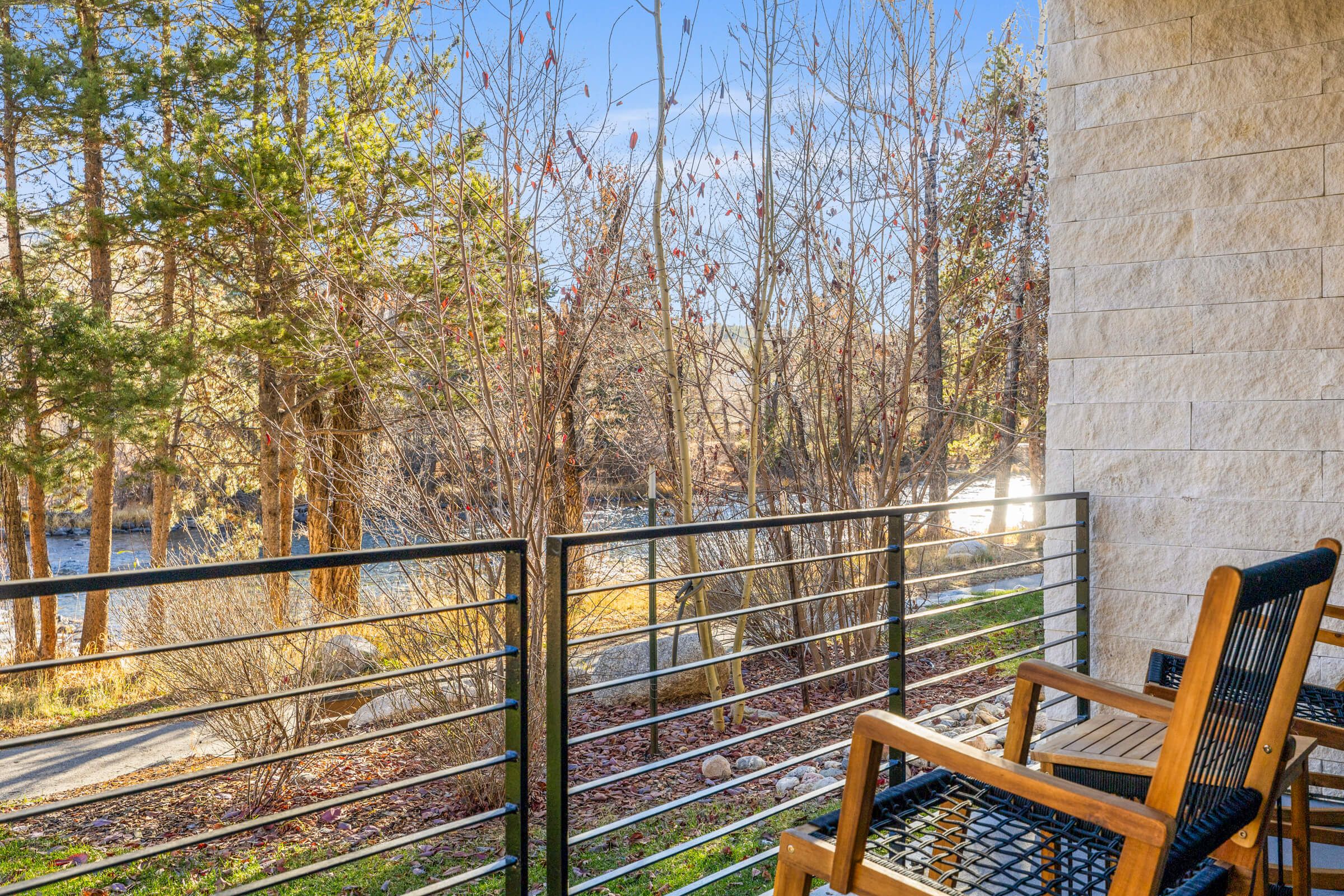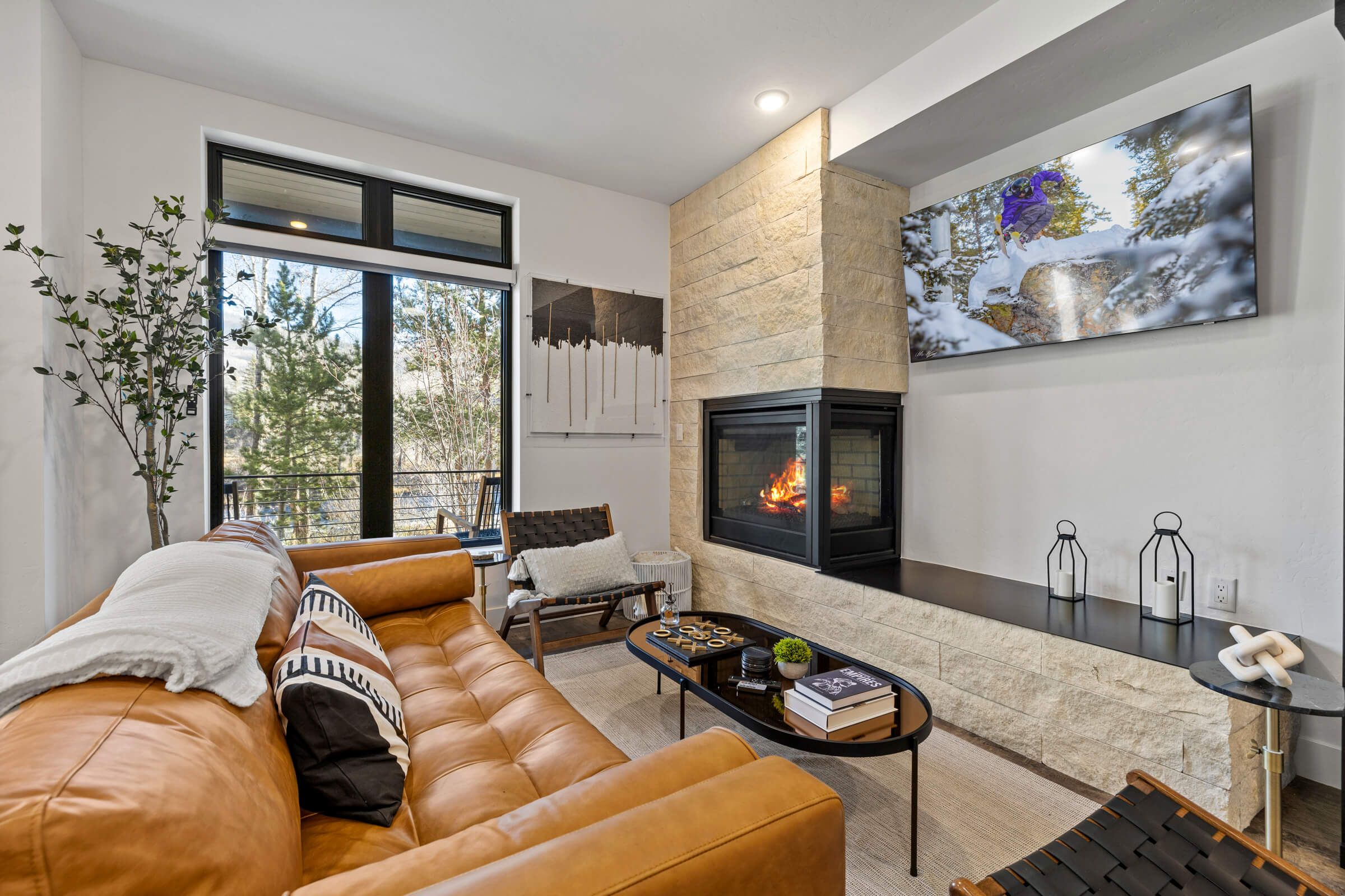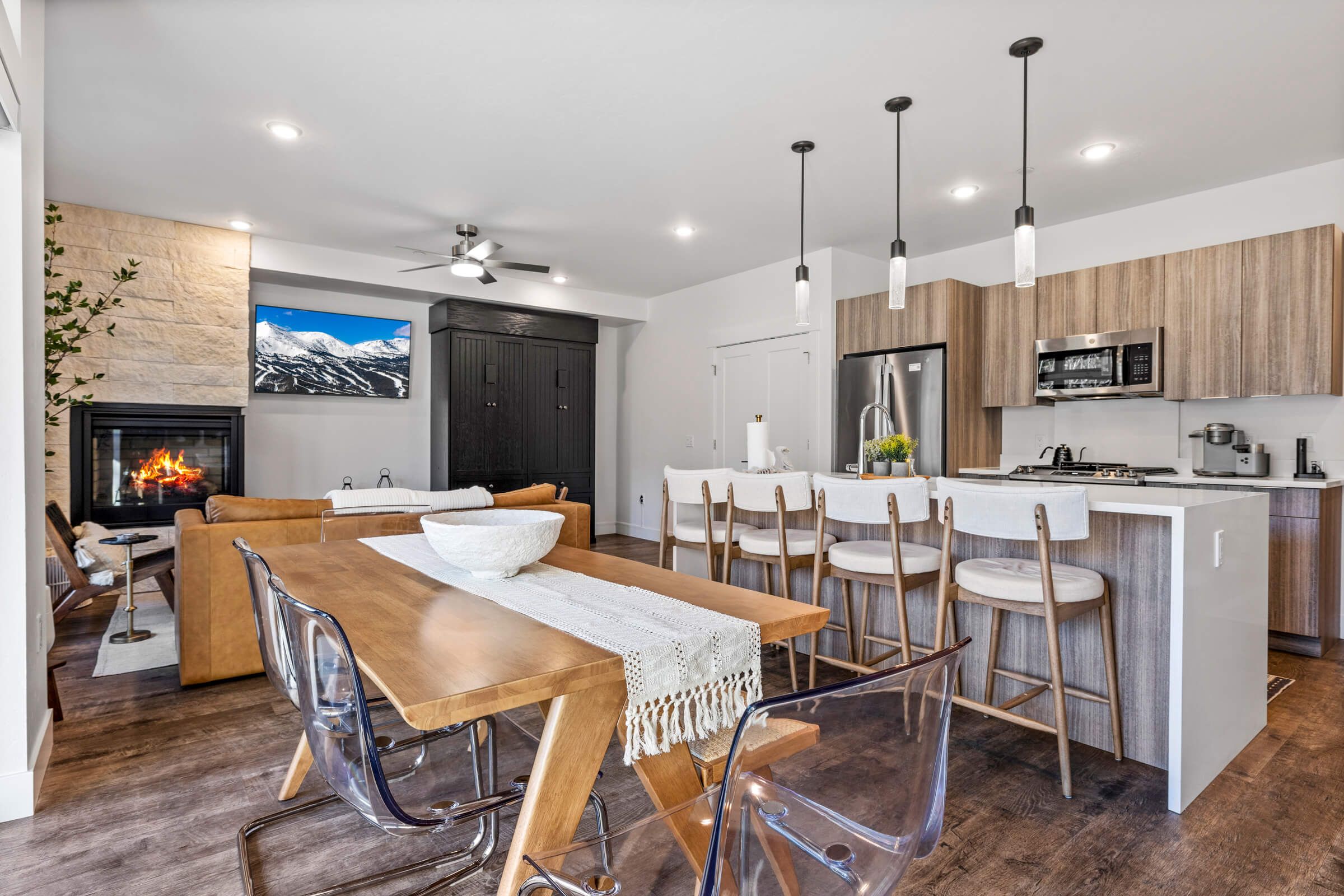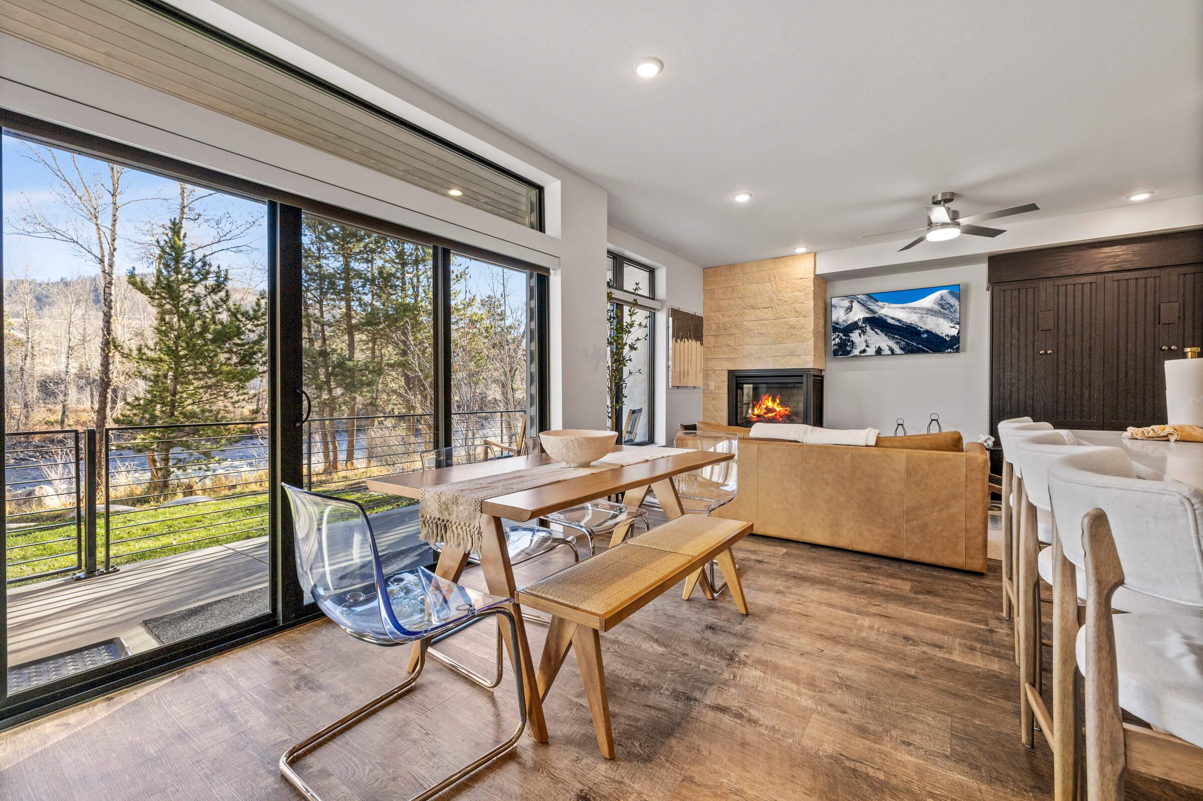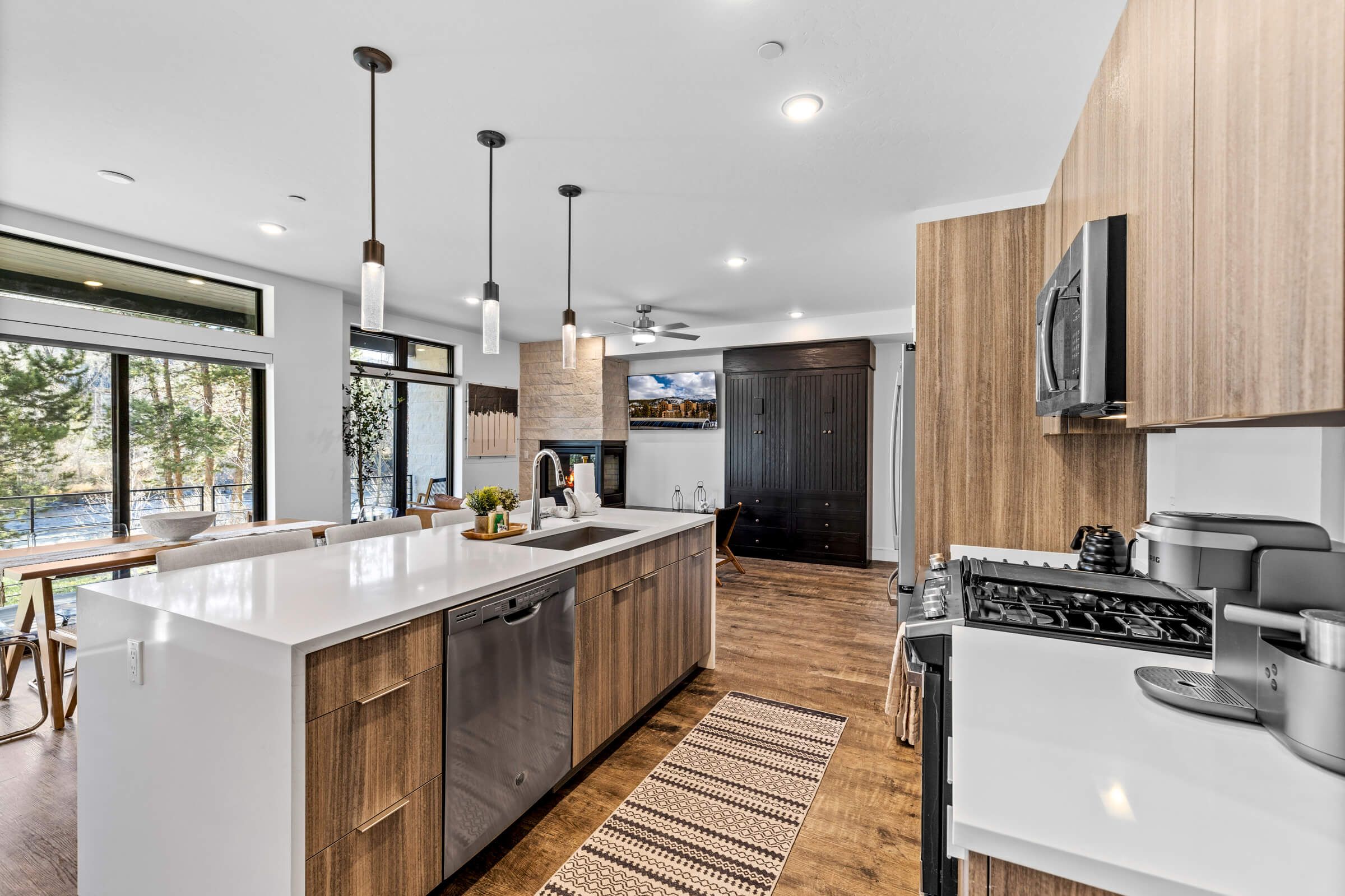 Inside, you’ll find a thoughtfully designed living area featuring warm hardwood floors, a cozy gas fireplace, and comfortable leather seating—including a queen sleeper sofa and a Murphy bed for additional guests. Large windows fill the space with natural light, while the modern Smart TV makes it easy to unwind after a day exploring Summit County. The kitchen is a chef’s delight with granite countertops, stainless steel appliances, a gas range, and a breakfast bar. Gather at the spacious dining table for home-cooked meals before stepping out to your patio to take in the tranquil river views.