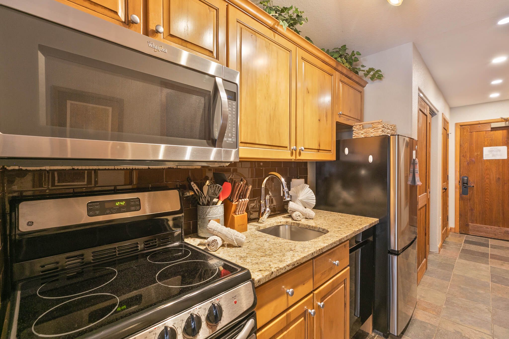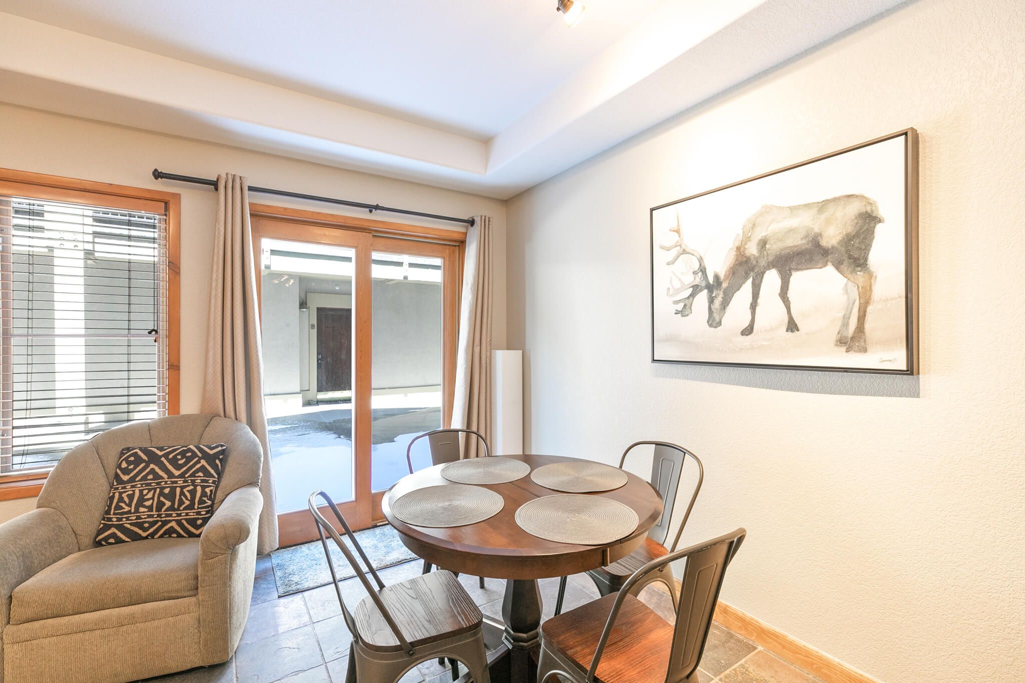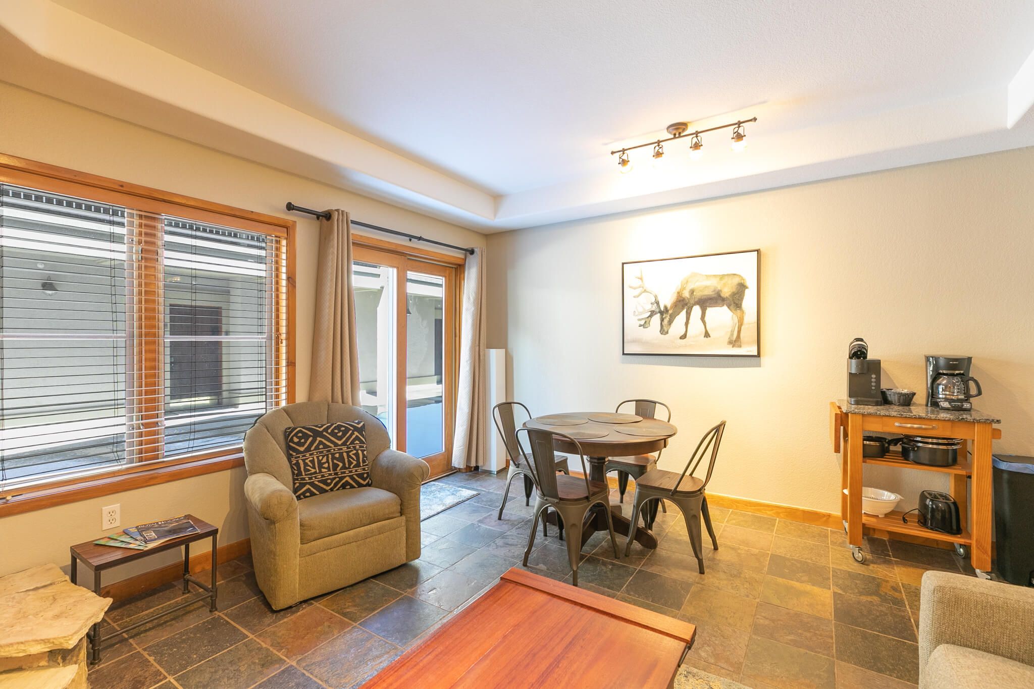 This studio, 1-bathroom ski-in/ski-out condo works perfectly for families and groups up to four. The living area features a gas fireplace, a flat-screen TV, and cozy seating for everyone to relax and trade stories about the day’s adventures. The kitchenette features granite counters and all the appliances and cookware you’ll need to whip up meals and snacks. The dining table seats four.Â