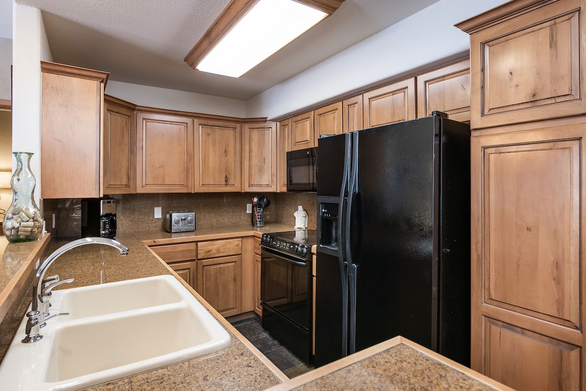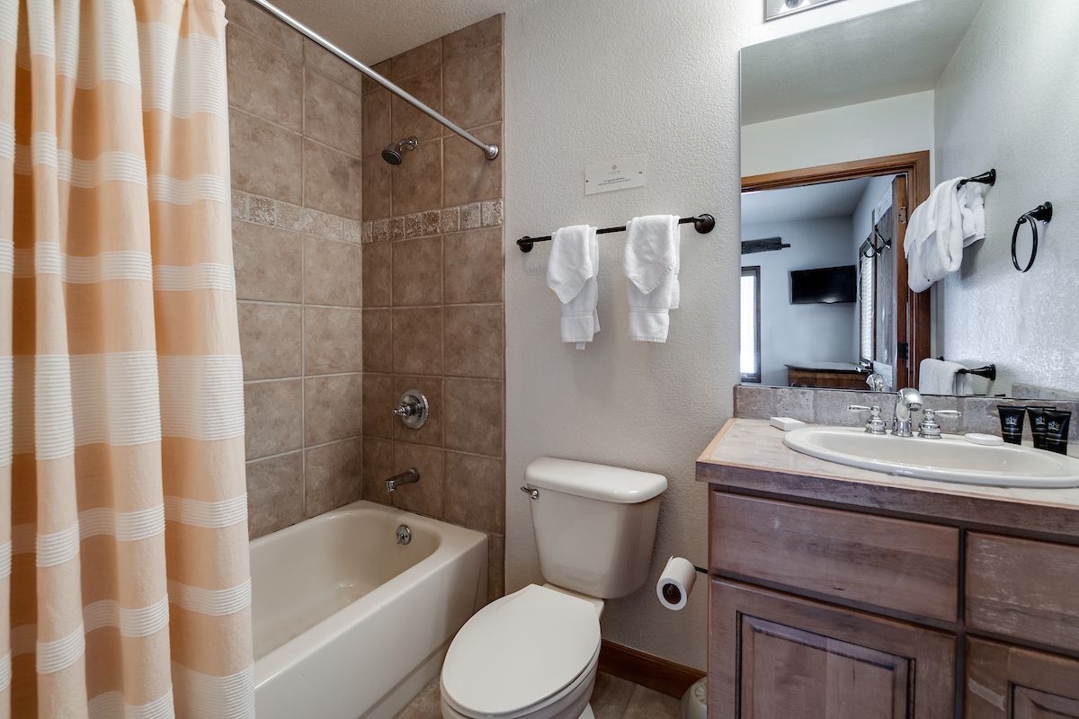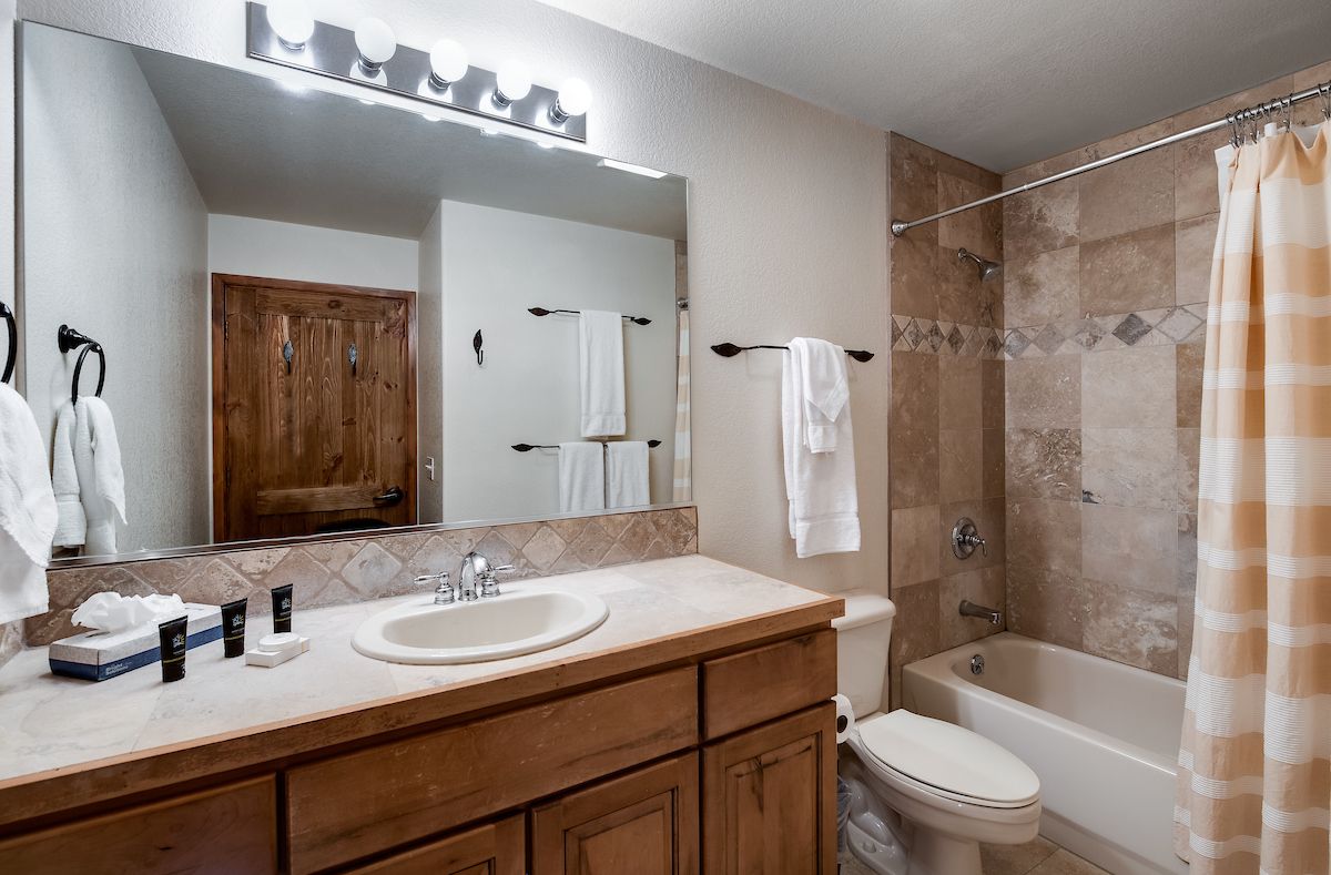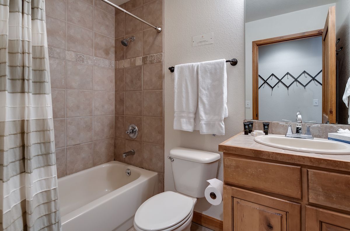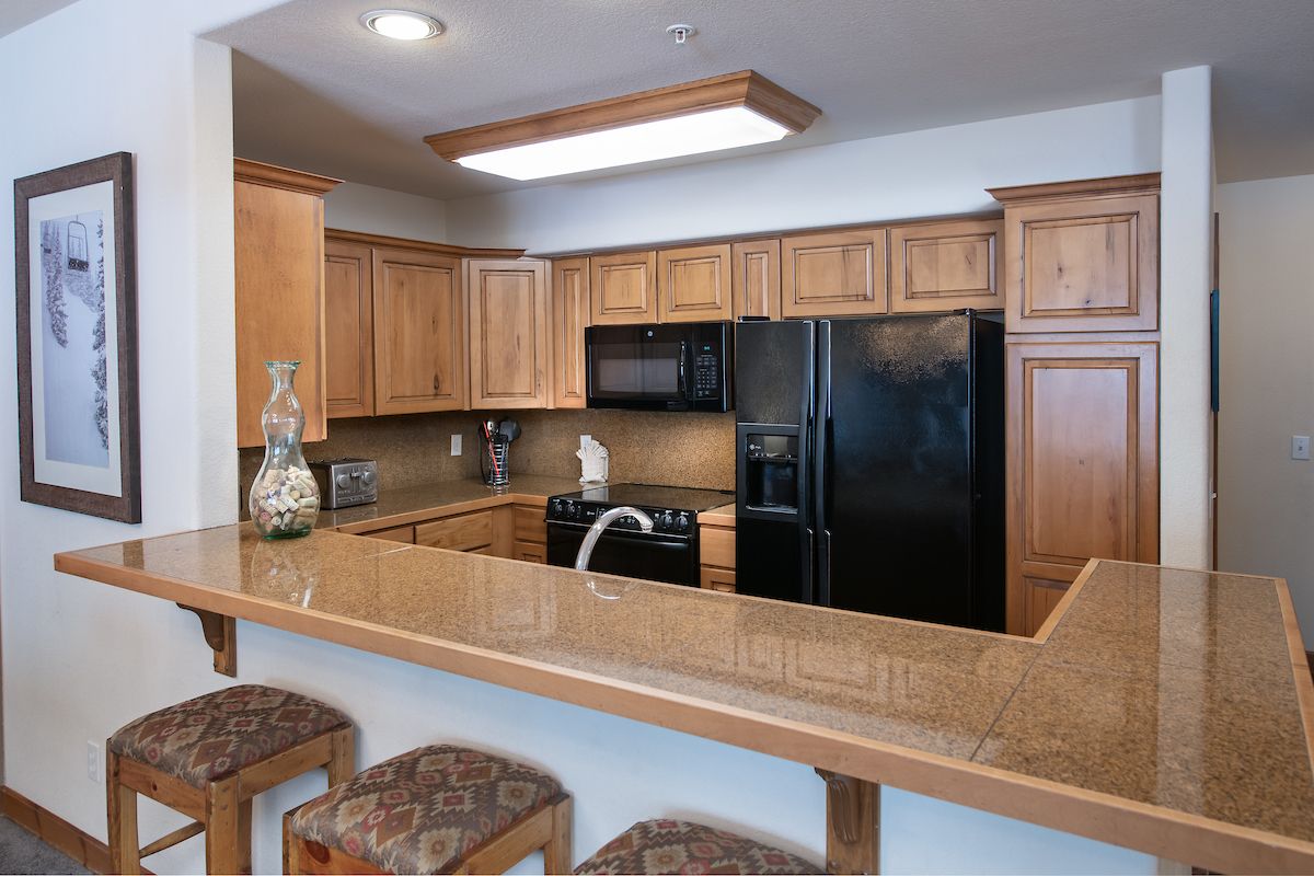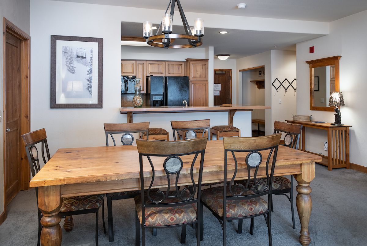 This 3-bedroom, 3-bathroom deluxe ski-in/ski-out condo is a fantastic choice for families and groups up to eight. With two master suites with private bathrooms, it’s also a great condo for two couples/families to share! The living area features a gas fireplace, a flat-screen TV, and plenty of seating for everyone to gather and relax. The kitchen has all the appliances and cookware you’ll need to keep the troops happy and fed. The dining table seats six, and there’s room for three more at the counter. You’ll love the in-unit washer/dryer as well!