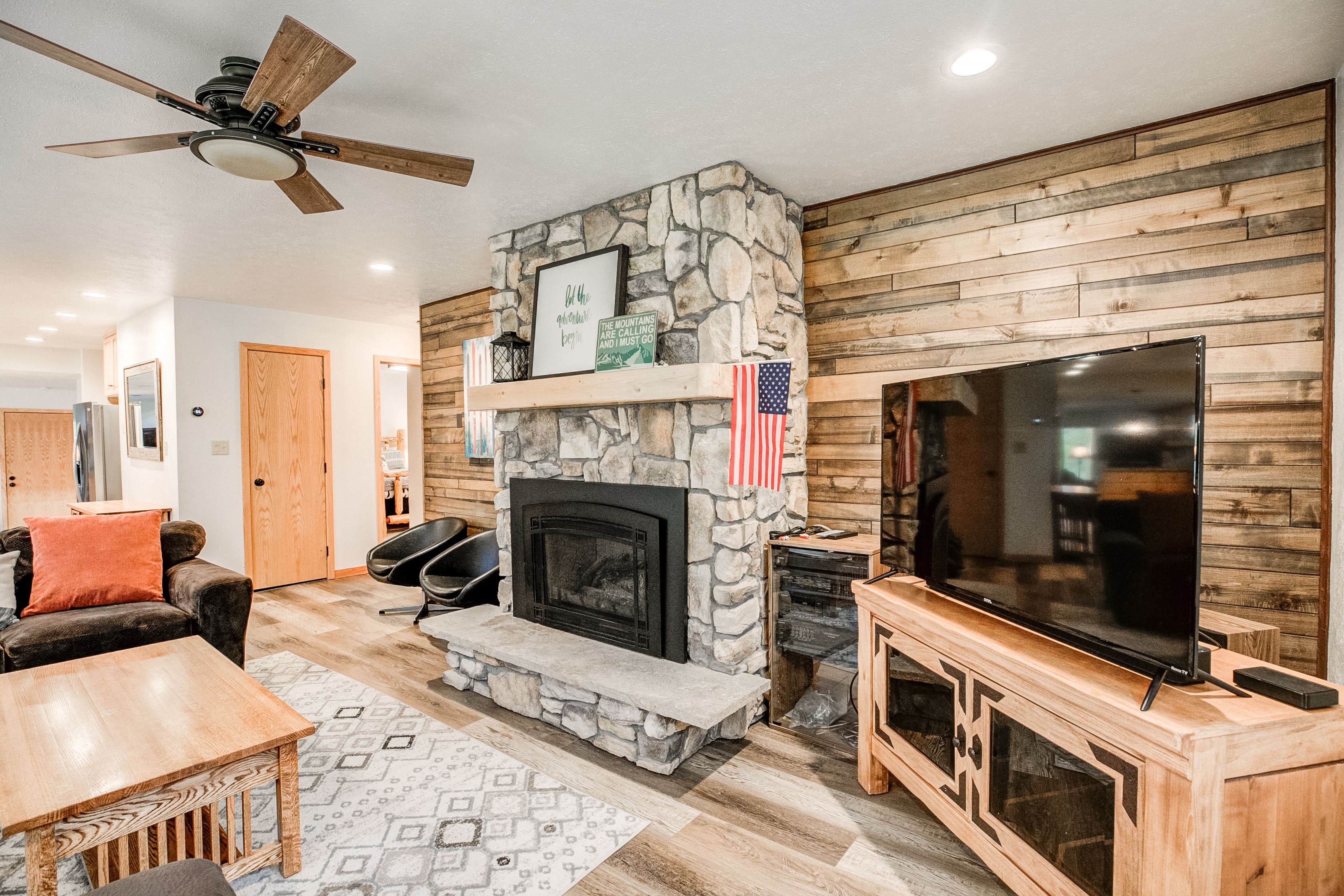 This 4-bedroom, 4-bathroom deluxe home is perfectly set up for groups of up to 12 – and with three master bedroom suites with private bathrooms, it’s great for multiple couples/families to share! In the living area, you’ll find vaulted ceilings, great natural light, a floor-to-ceiling rock gas fireplace, a flat-screen TV and plenty of seating for trading stories after the day’s mountain adventures. There’s also a separate family room area with another gas fireplace and flat-screen TV, so the kids can watch their favorite movie, too.