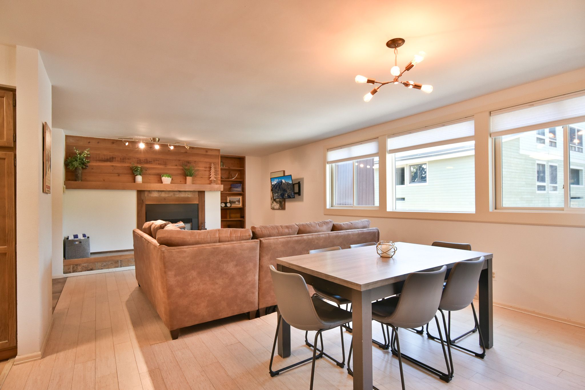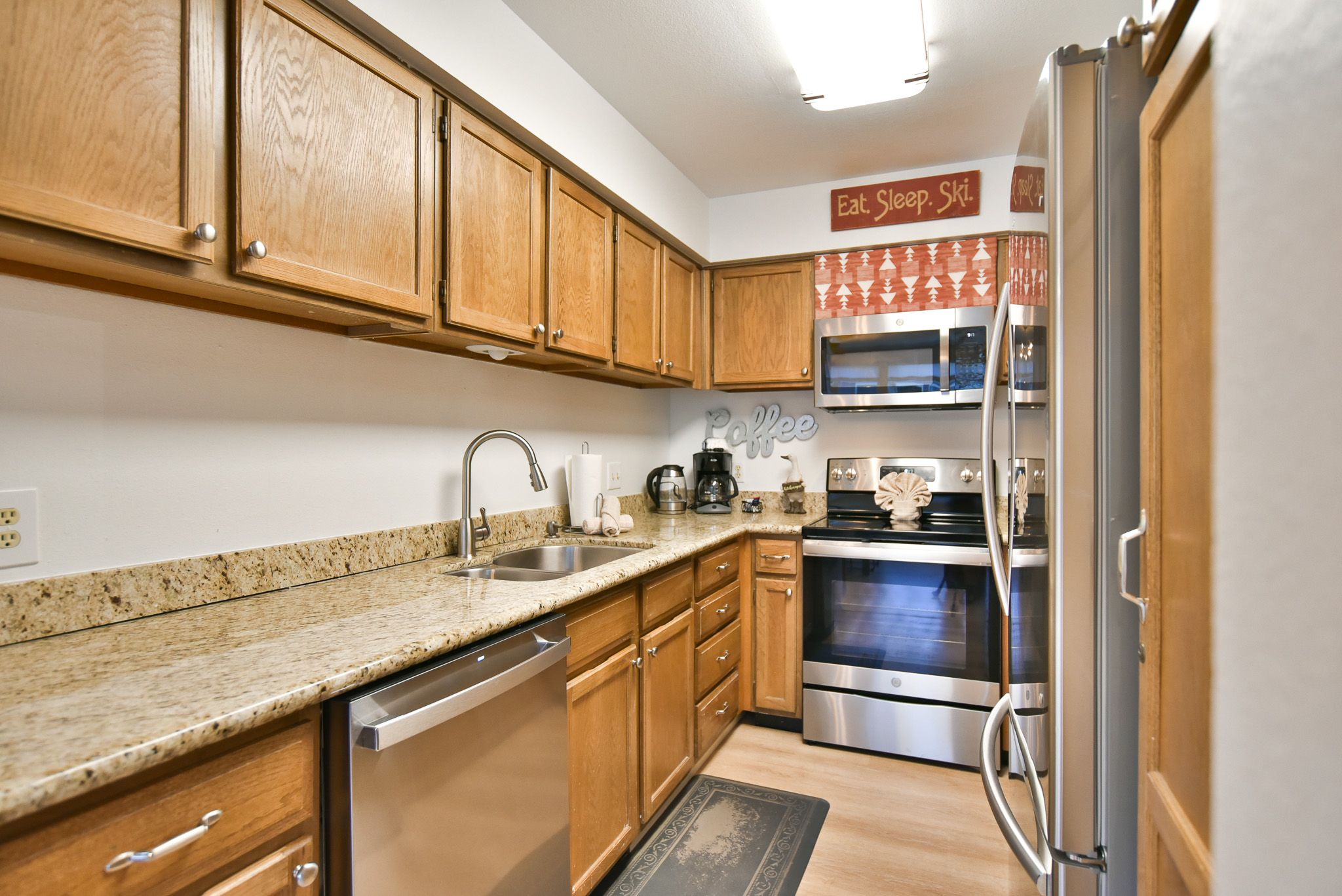 Unwind by the cozy gas fireplace in the spacious living area, complete with ample seating and a Smart TV. The fully equipped kitchen features granite counters, stainless steel appliances, and all the essentials to prepare delicious meals after exhilarating days on the slopes.