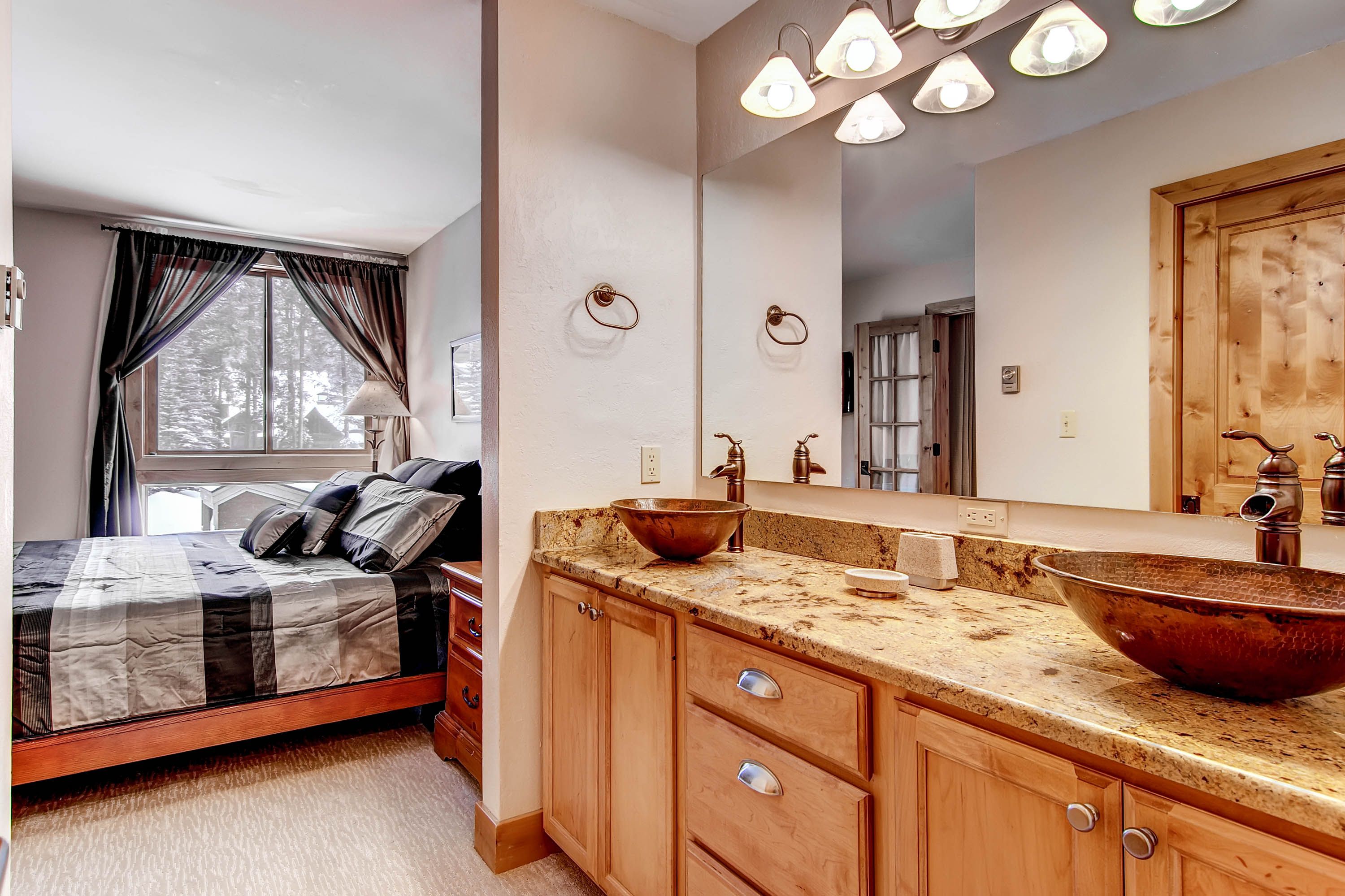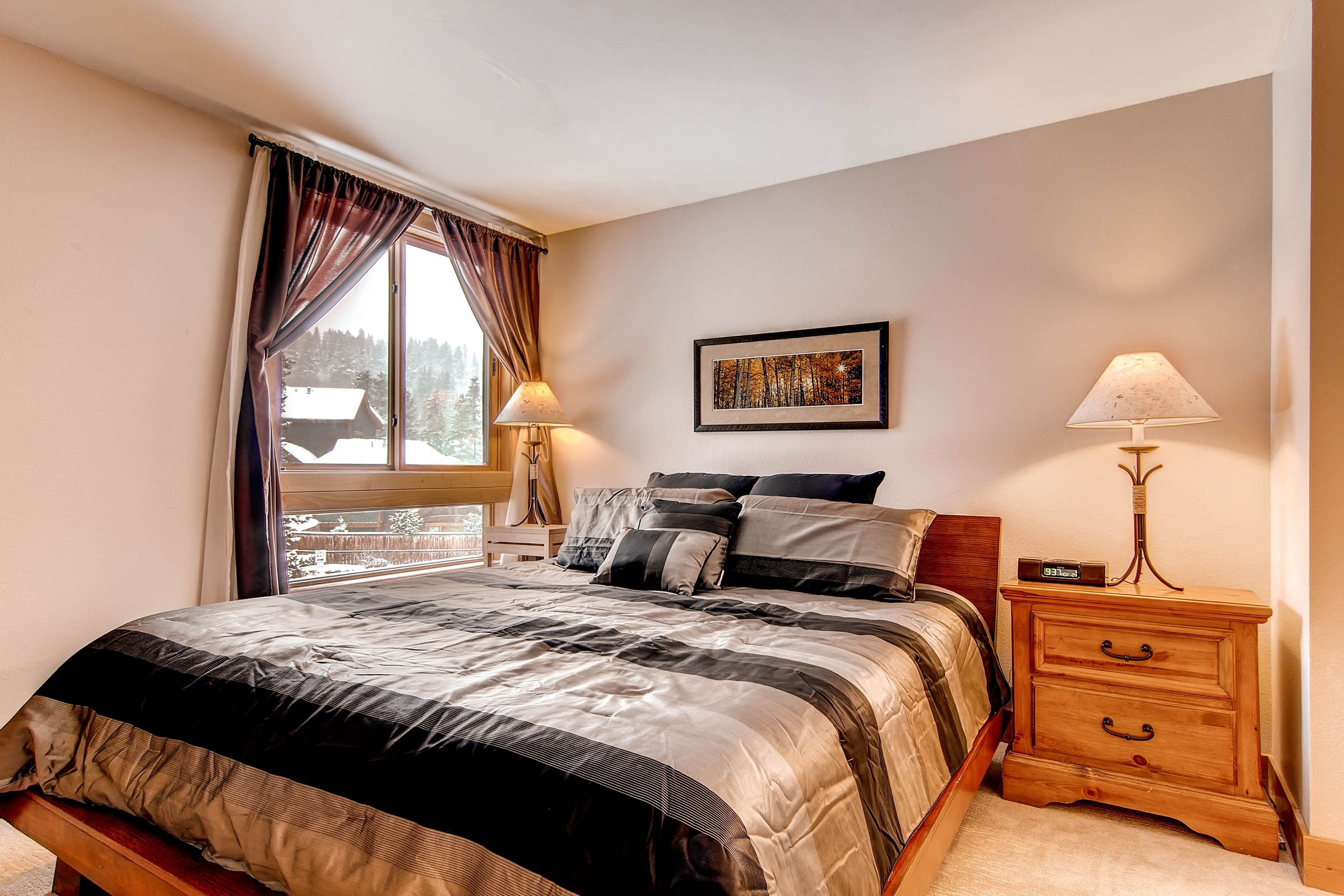 This 2-bedroom, 2-bathroom deluxe condo is the perfect mountain retreat for families or groups of up to eight people. The living area has plenty of seating for the whole gang, a wood-burning fireplace and a flat-screen TV. You’ll love being able to step out onto the balcony and see Peak 8 in the distance. The fully equipped kitchen features granite counters, stainless steel appliances and all the gear you’ll need to feed the troops after a long day on the slopes. The dining table seats six, and there’s room for two more at the breakfast bar.