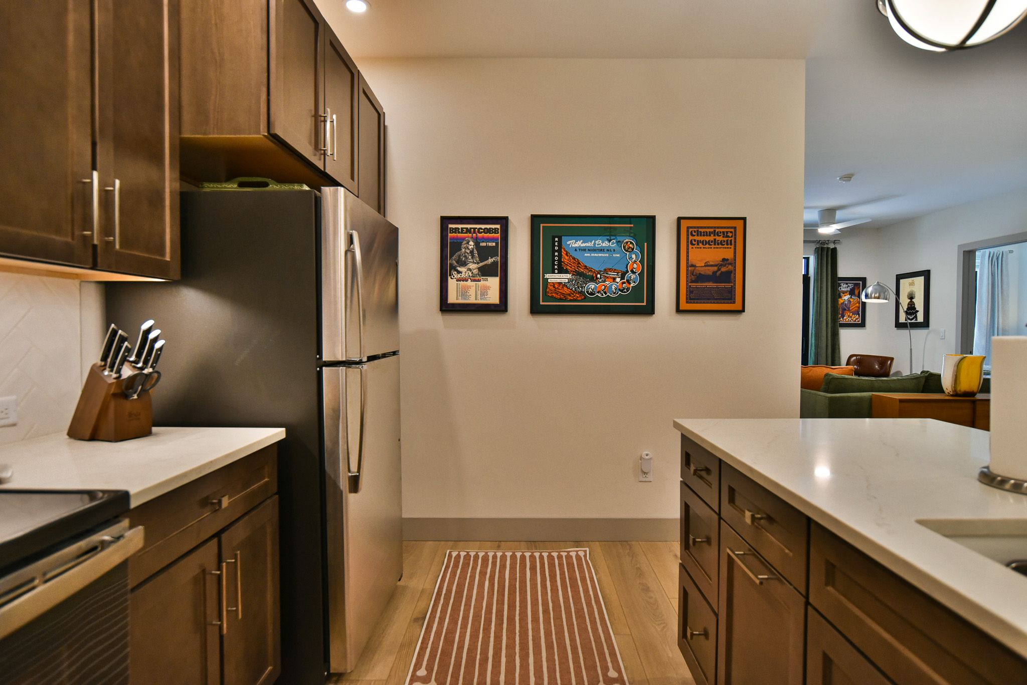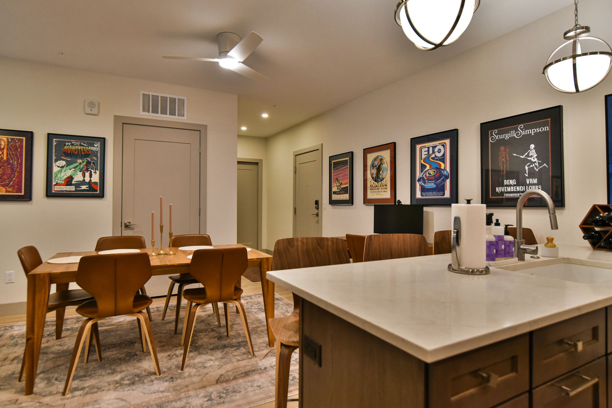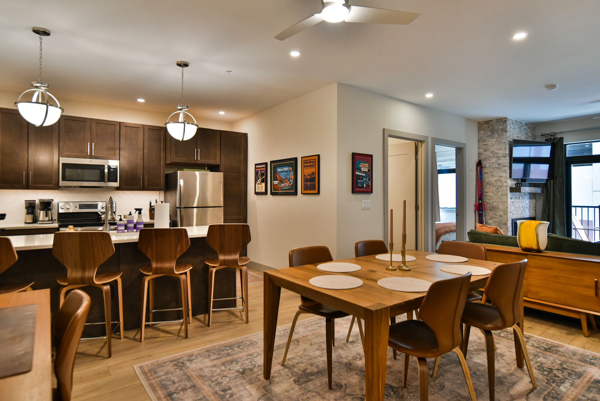 Skywalk Flats Amphitheater Retreat is a premium 2-bedroom, 2-bathroom condo perfect for up to four guests. The living area boasts large windows letting in plenty of natural light, comfortable seating, a gas fire place and a large flat screen Smart TV for entertainment. The kitchen features large marble counters, stainless-steel appliances, and all the necessary equipment to keep your group happy and well-fed. Seating for six at the dining table and four at the counter ensures everyone has a place to gather.