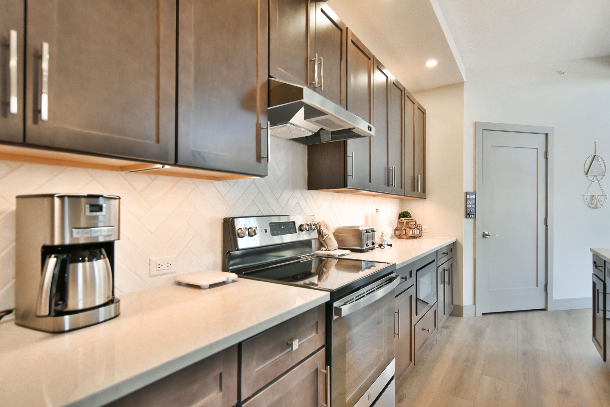 Skywalk Flats Downtown Condo is a premium 3-bedroom, 2-bathroom retreat perfect for up to eight guests. The living area boasts large windows framing mountain views, vaulted ceilings, comfortable seating, a floor-to-ceiling rock gas fireplace, and a large flat-screen Smart TV for entertainment. The kitchen features large marble counters, stainless-steel appliances, and all the necessary equipment to keep your group happy and well-fed. Seating for four at the dining table and four at the counter ensures everyone has a place to gather.