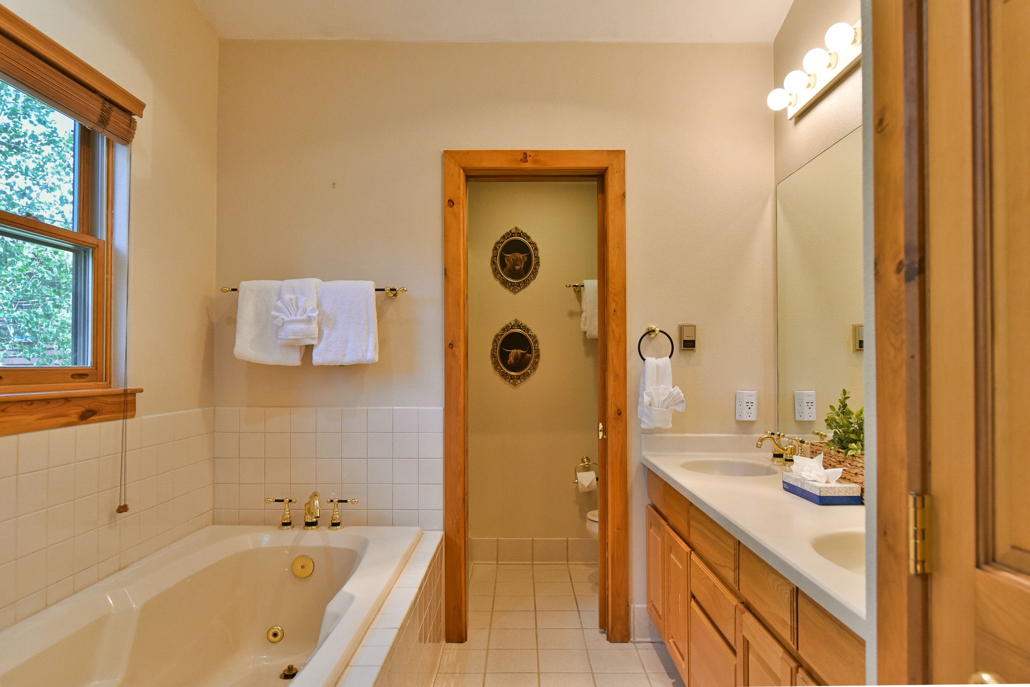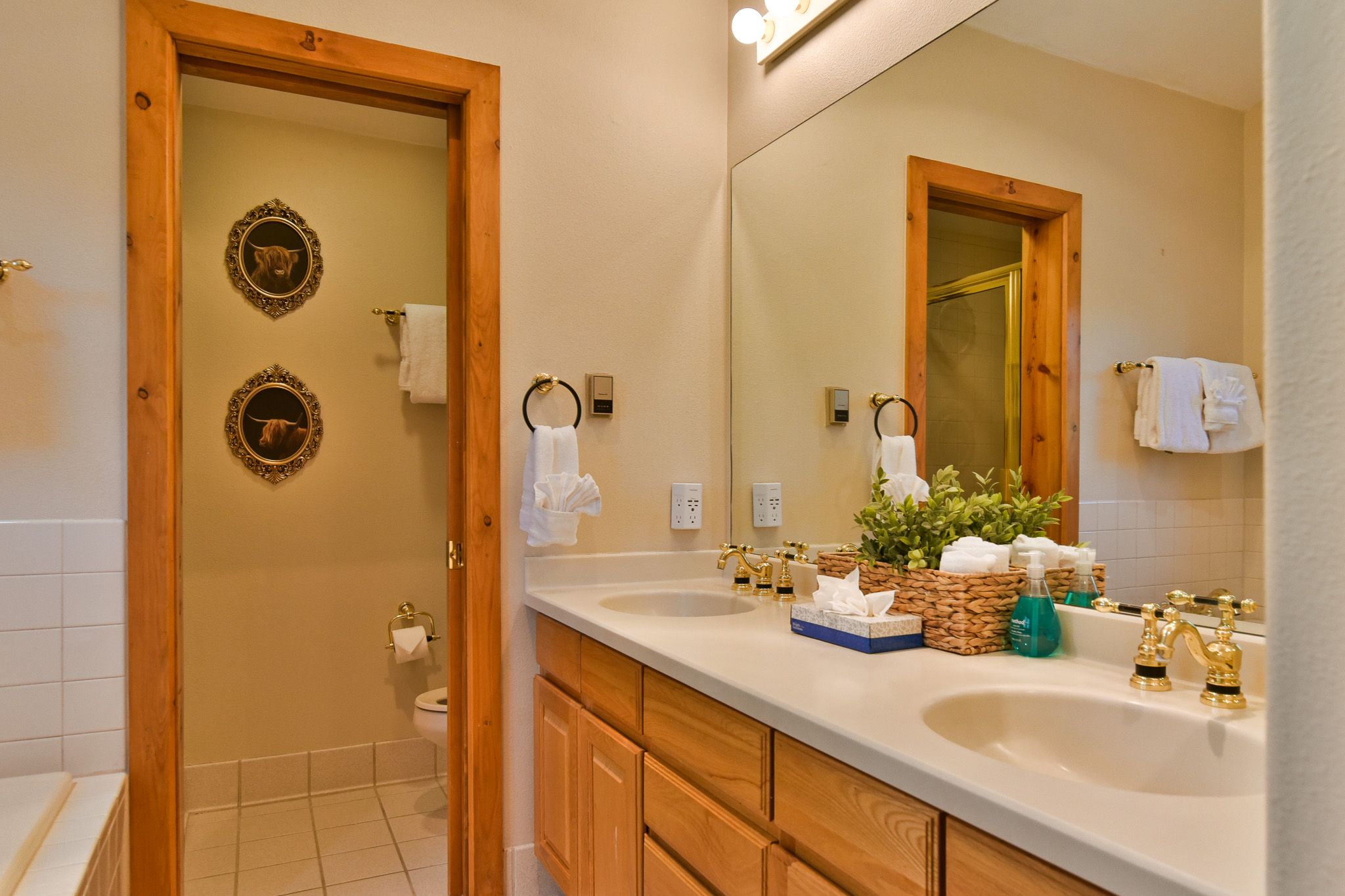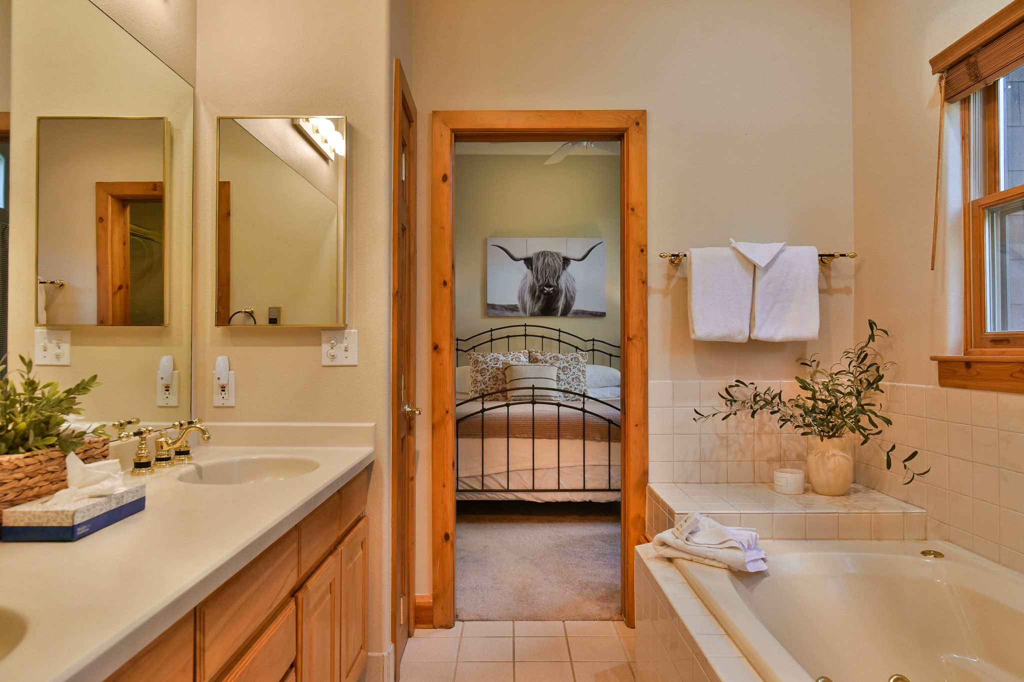 - Master Bedroom: king bed, large sitting room, stone gas fireplace, private bathroom with 2 sinks, large soaking tub and walk-in shower. (sleeps 2)