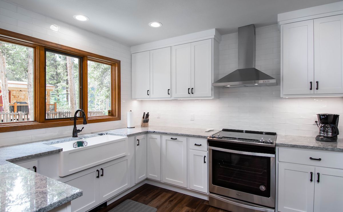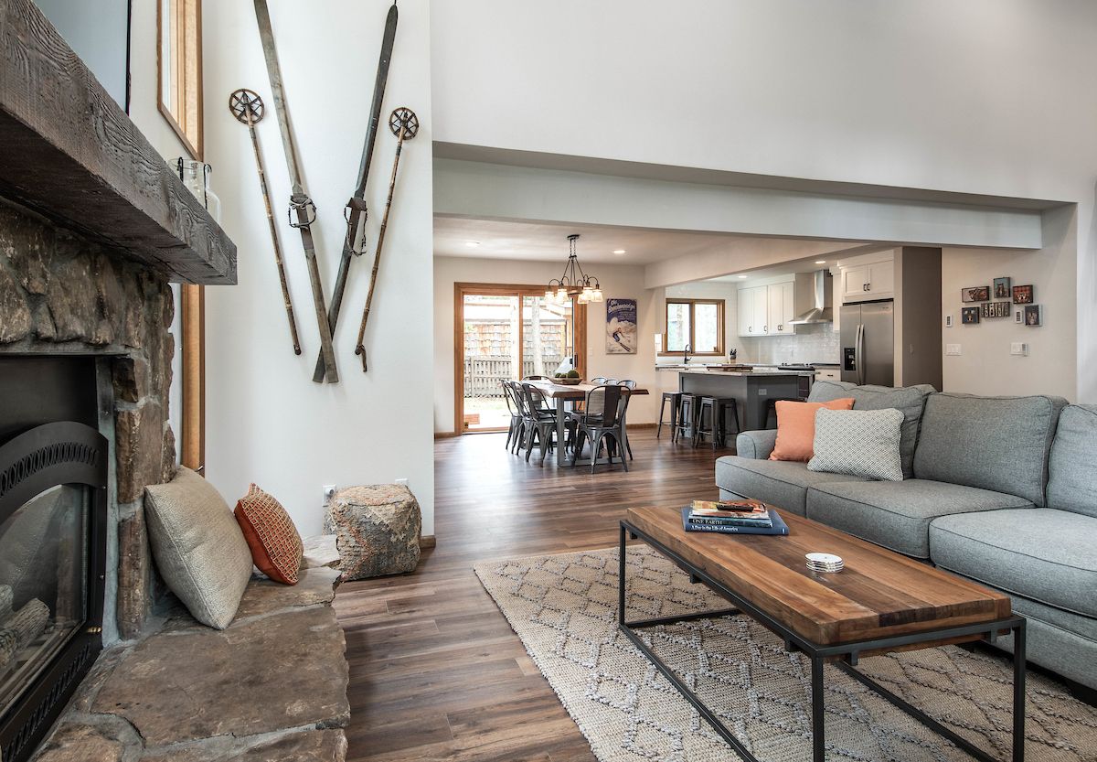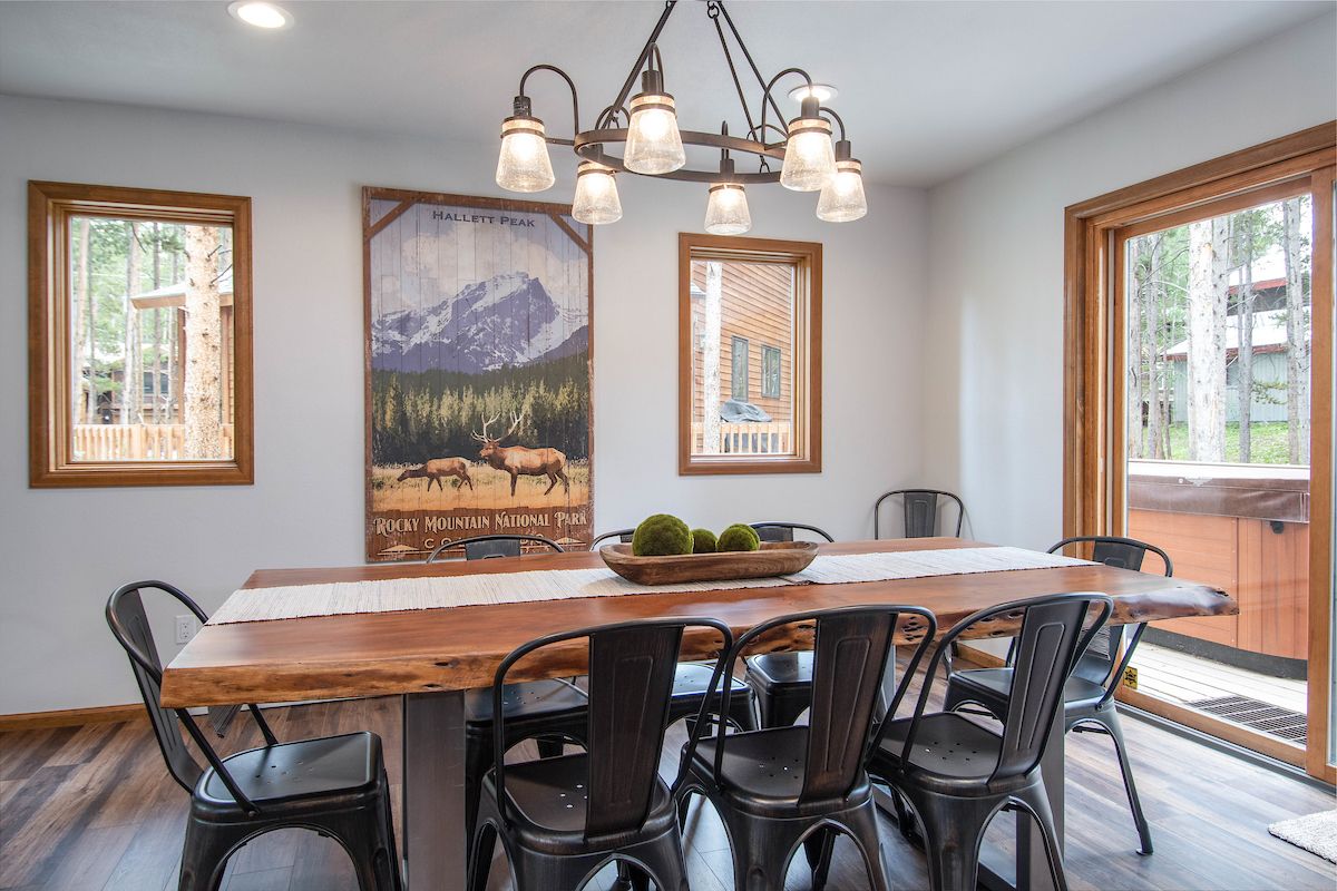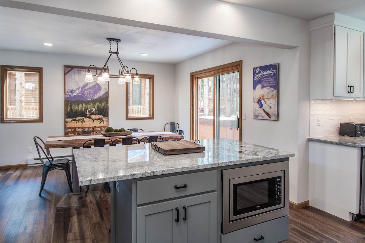 The kitchen is beautiful, with gorgeous granite counters and new stainless-steel appliances. It's fully stocked with all the gear you’ll need to whip up mountain meals to keep the troops fed and happy. There’s room for six or eight at the gorgeous wood slab dining room table, and room for four more at the kitchen island/breakfast bar.