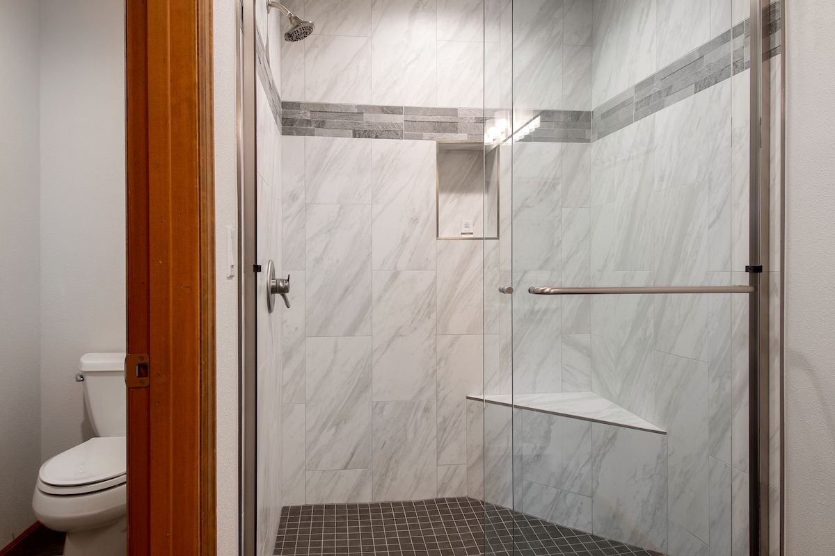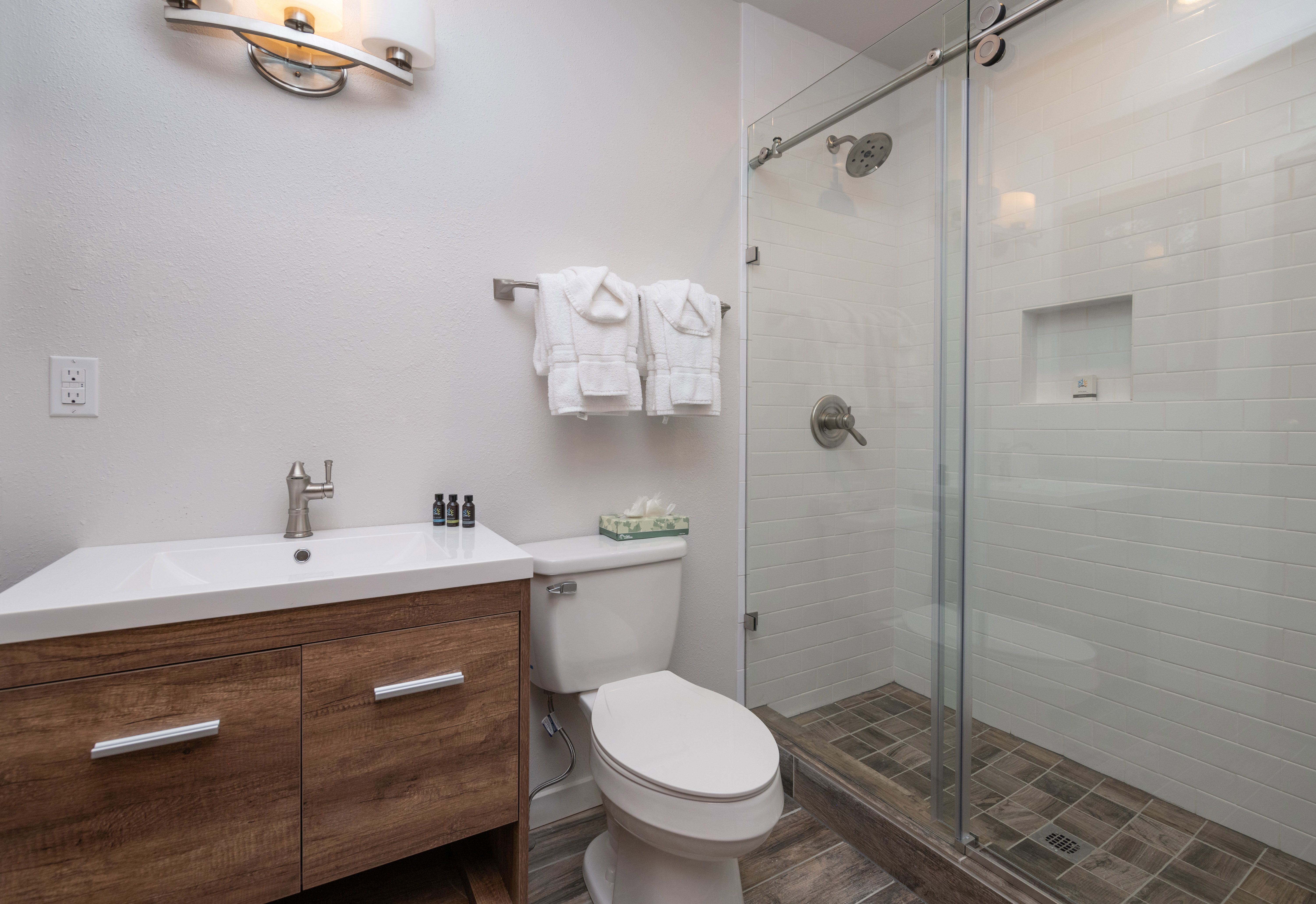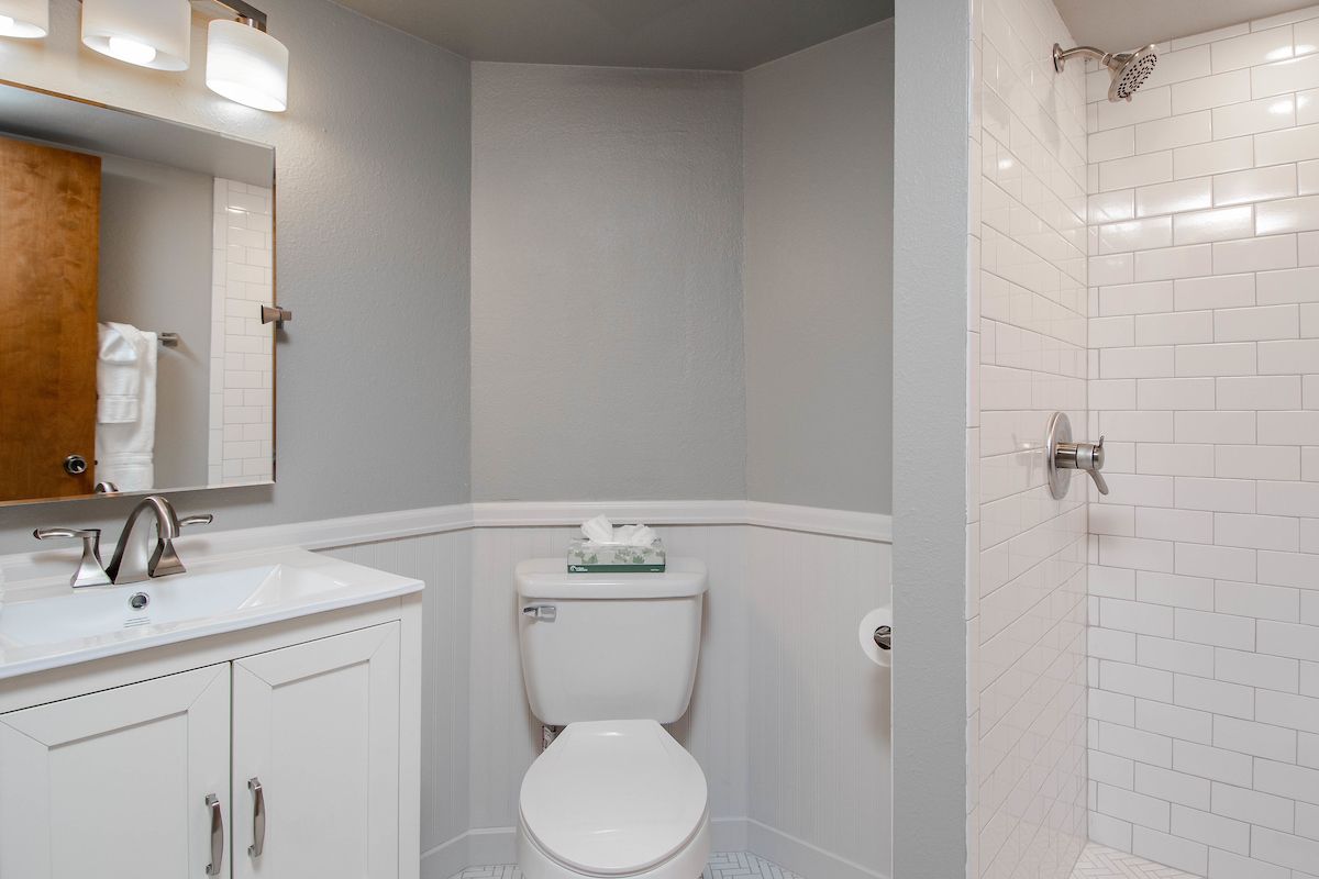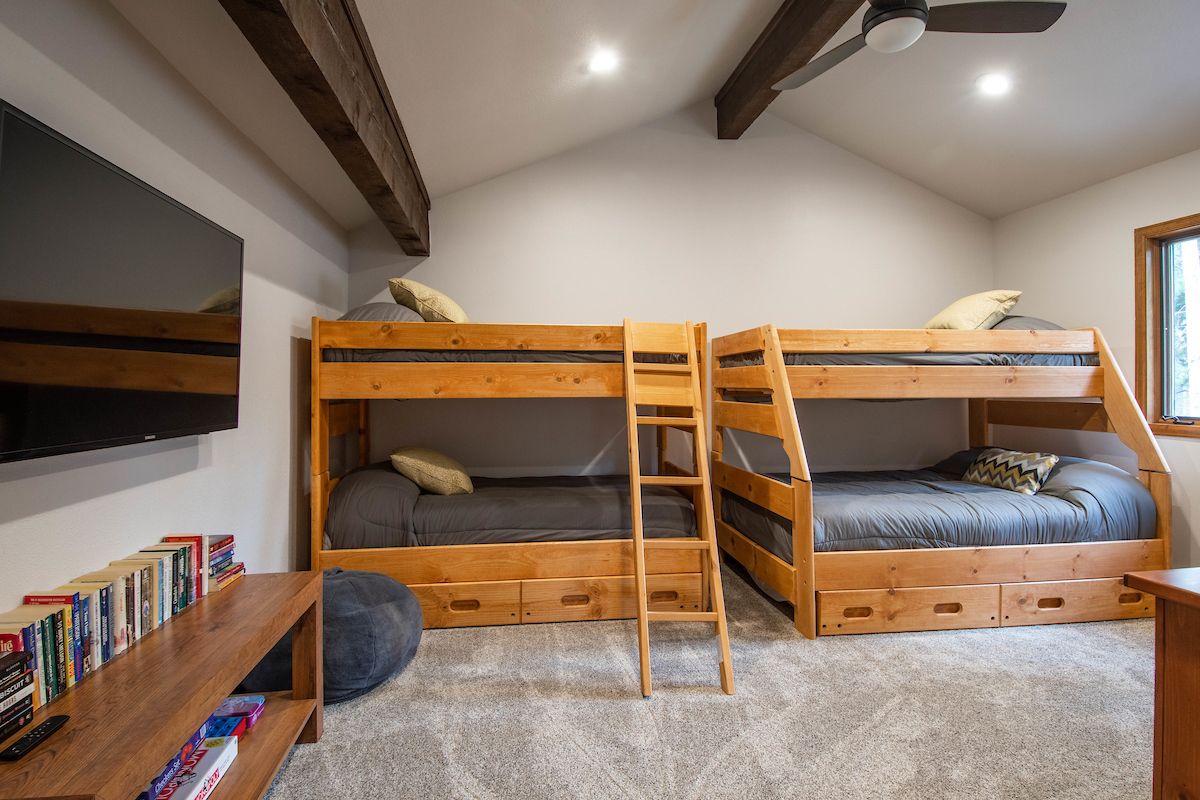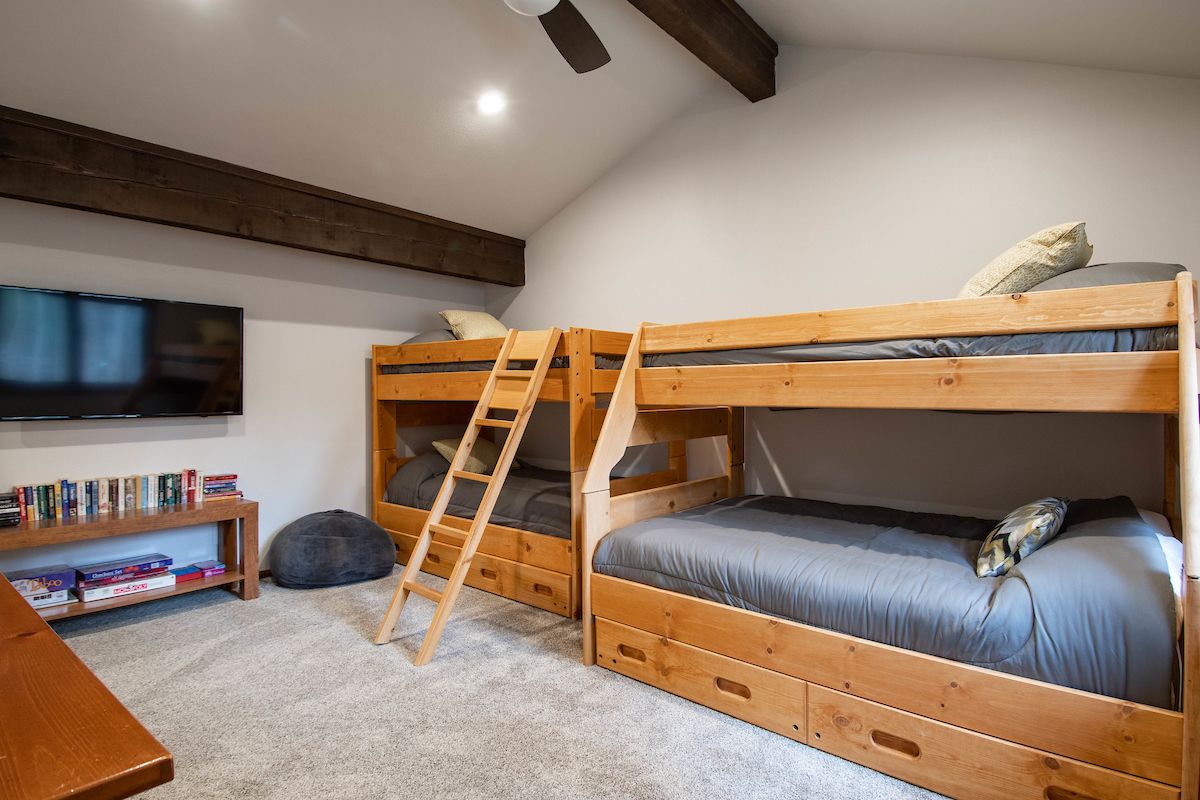 - Bunk room: twin-over-full bunk bed and twin-over-twin bunk bed with private attached bathroom with tile walk-in shower. (sleeps 5)